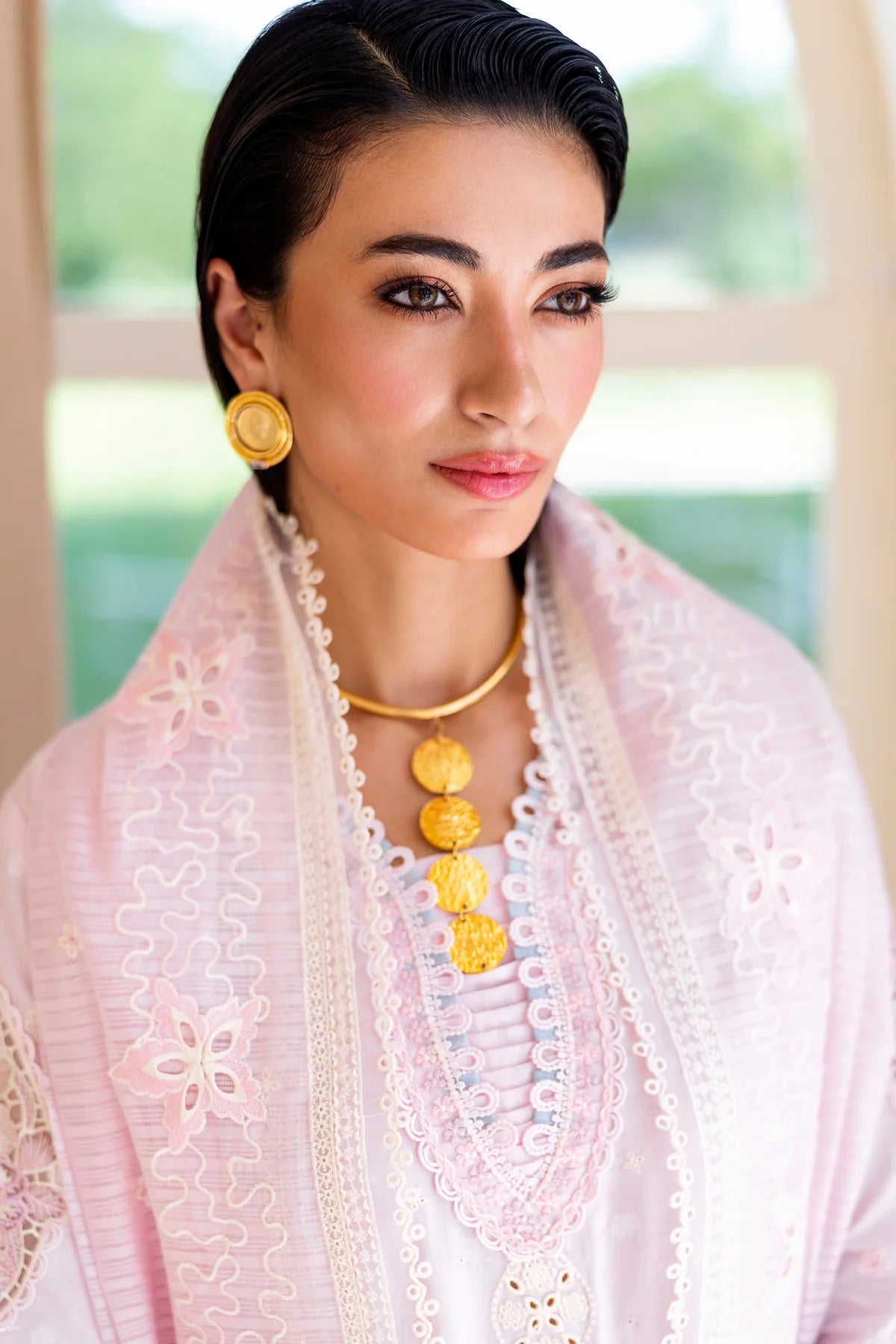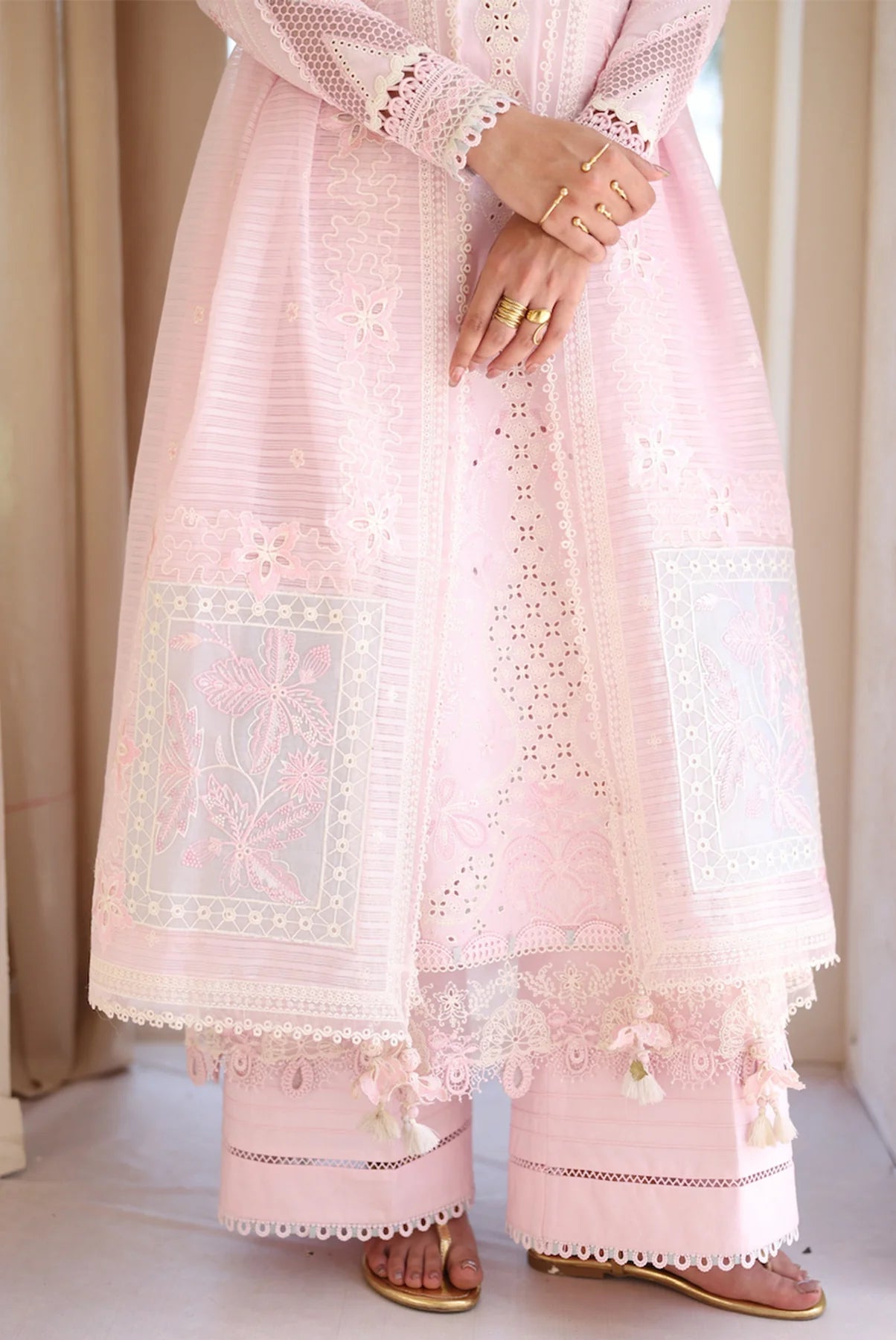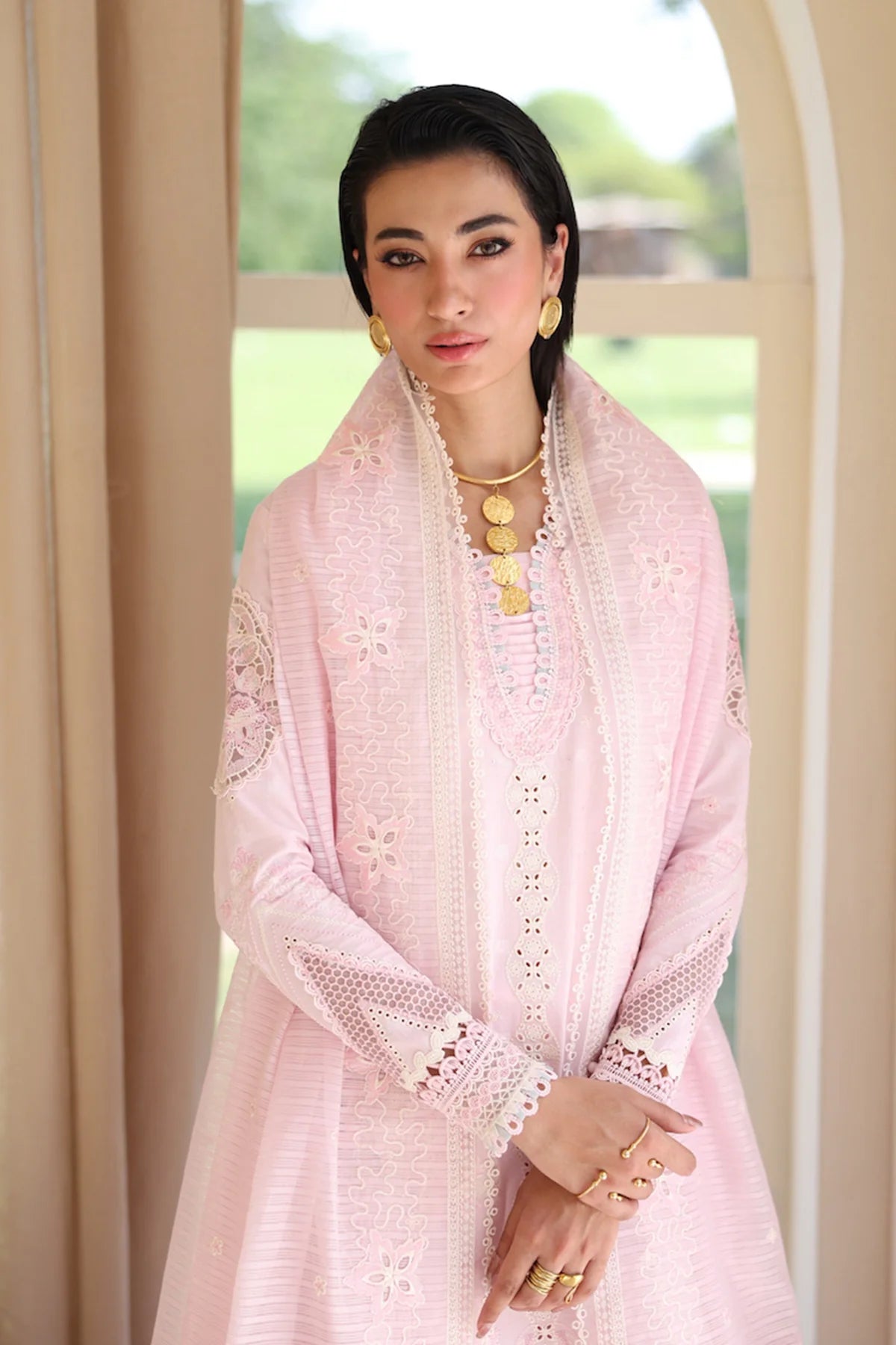 Feather showcases a jacquard weaved shirt styled with a jacquard dupatta and cotton trousers, creating a refined silhouette with soft charm.