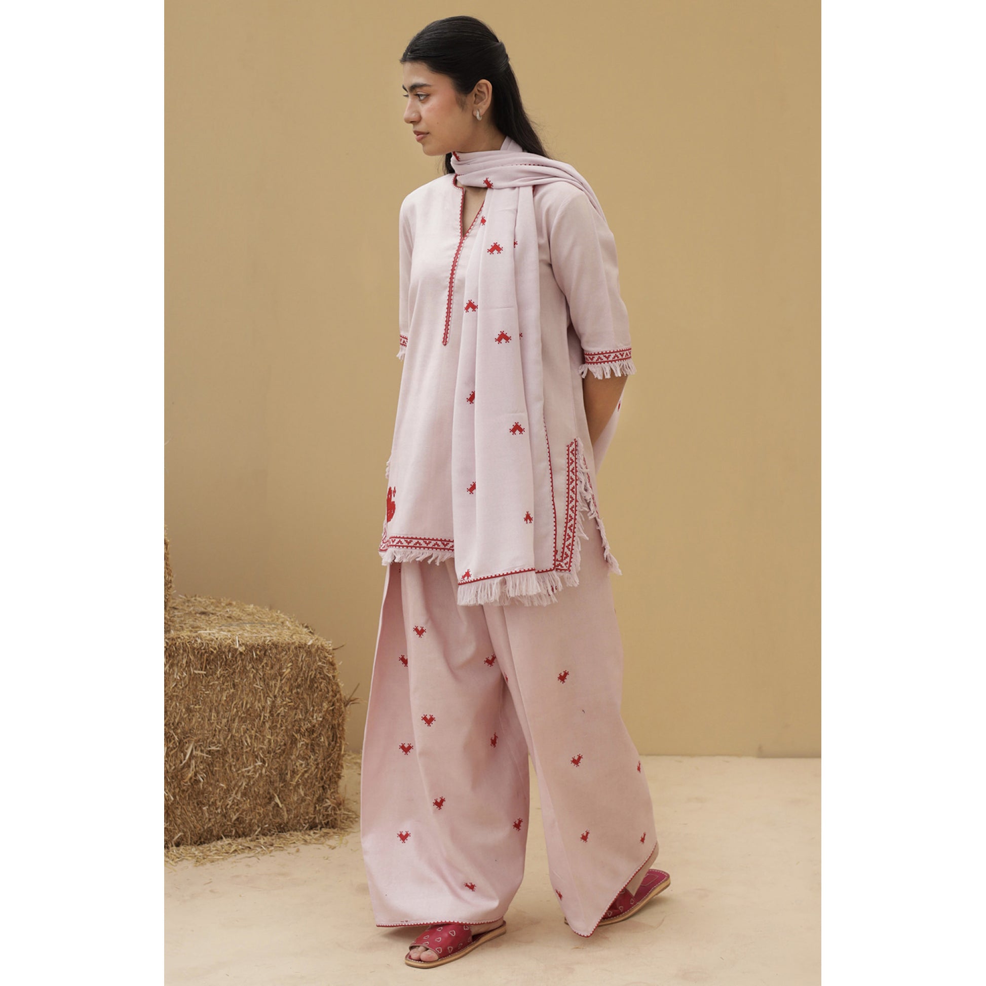 Pale blush sooti khaddar shalwar kameez with constrasting cross stitch embroidery.