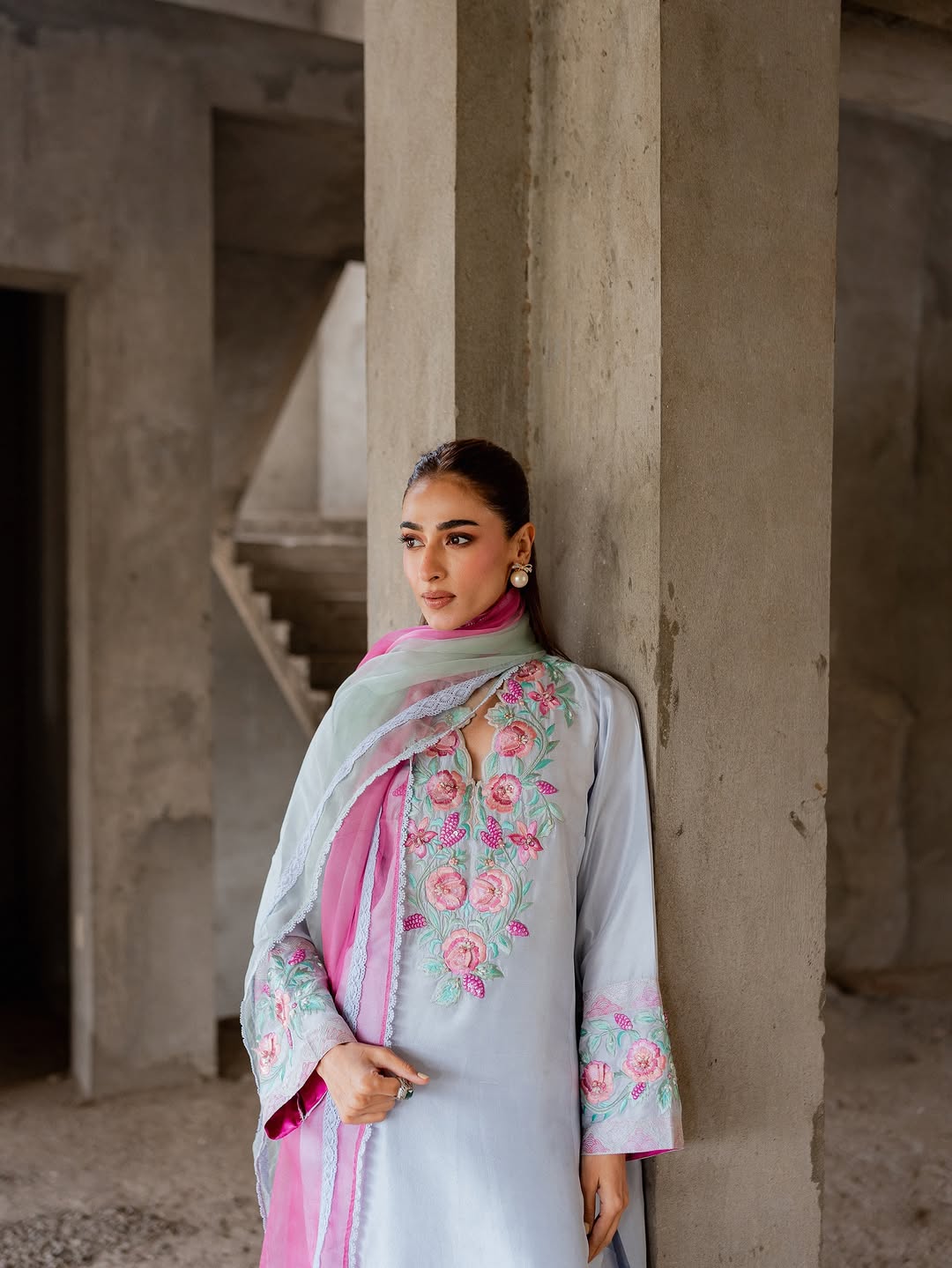 A pure raw silk, elegant Farshi shalwar set, adorned with intricate thread embroidery and exquisite hand embellishments of cut dana and sequins. The three-toned dupatta is beautifully finished with delicate lace detailing, making this ensemble a perfect choice for a fancy iftar party or an Eid lunch