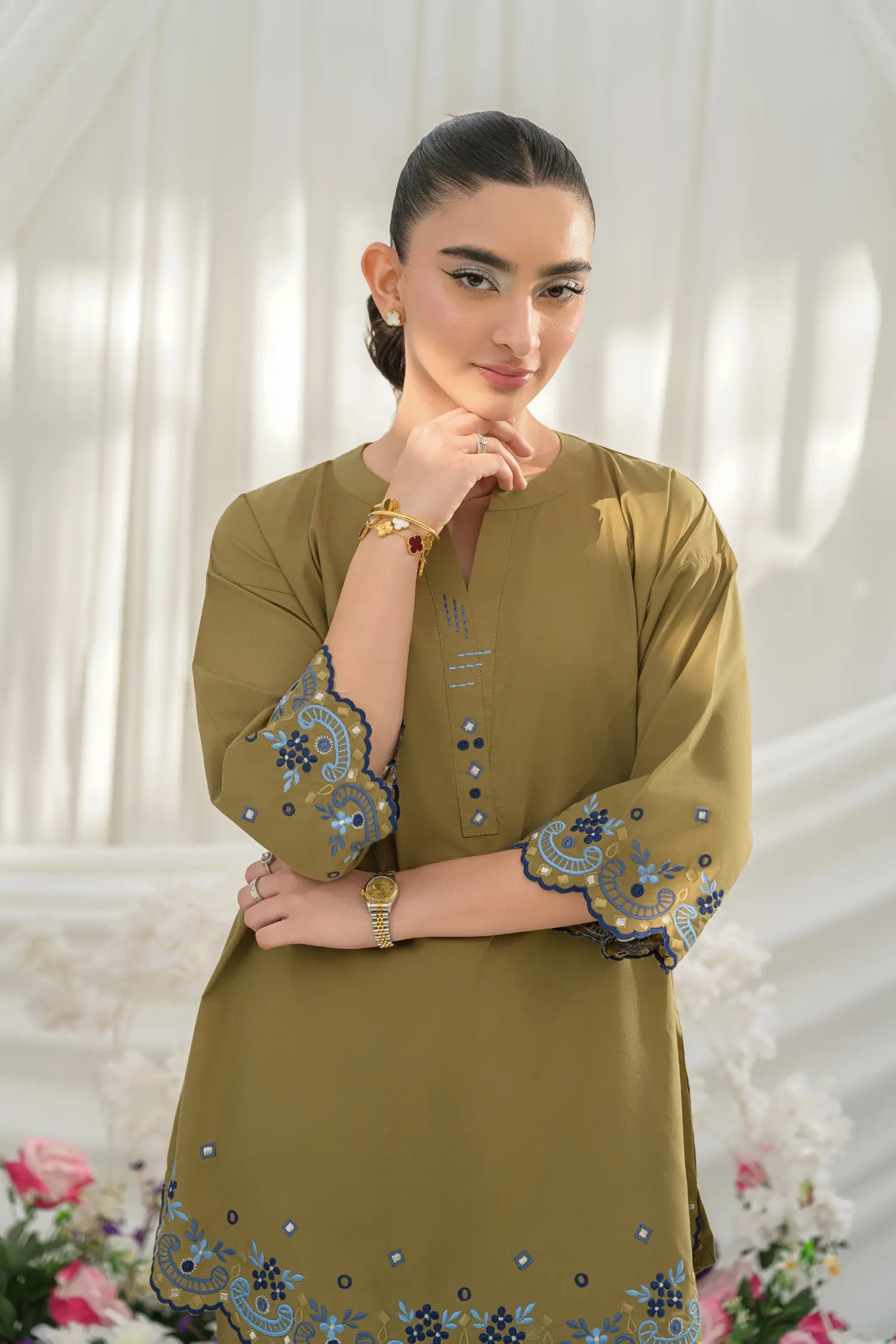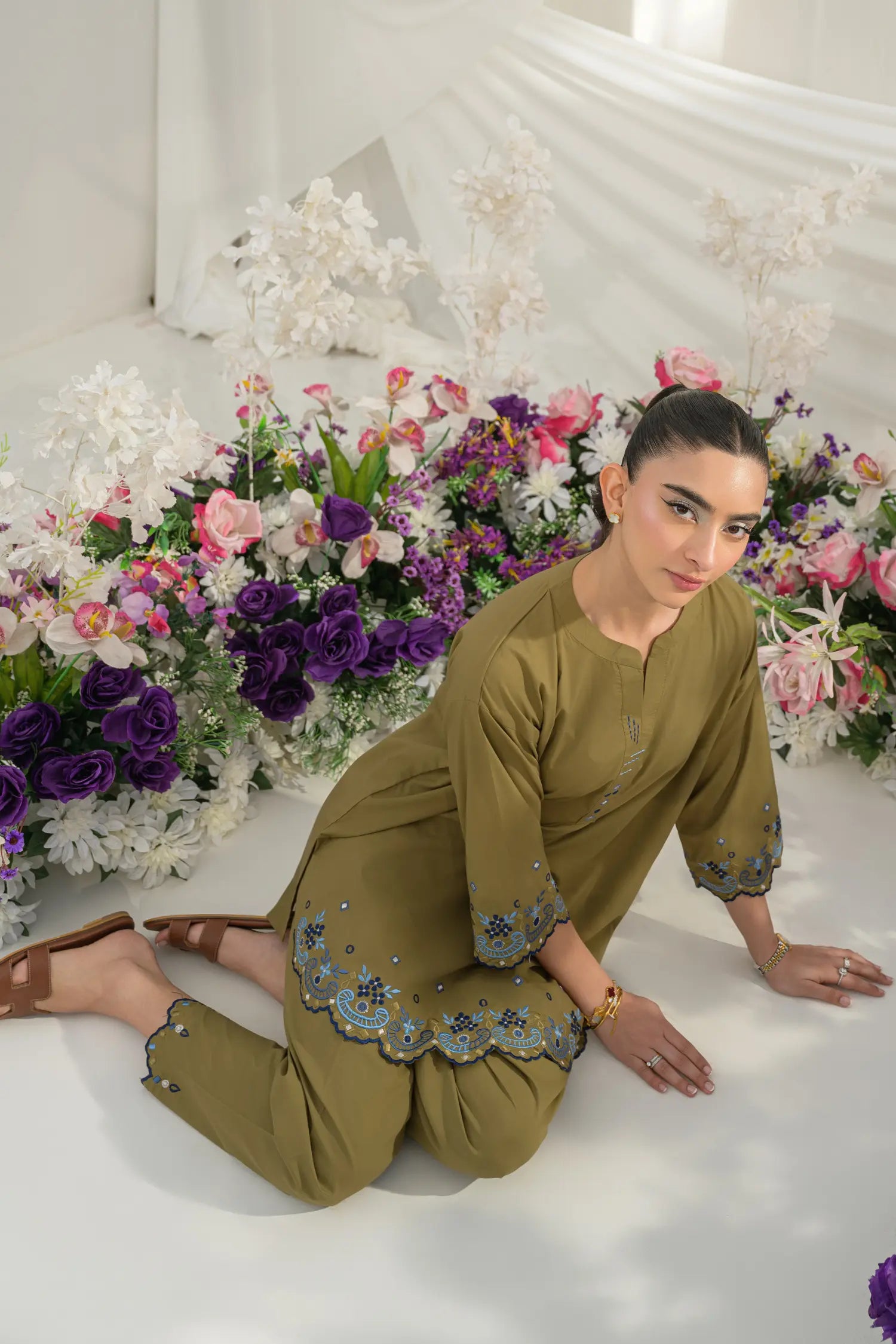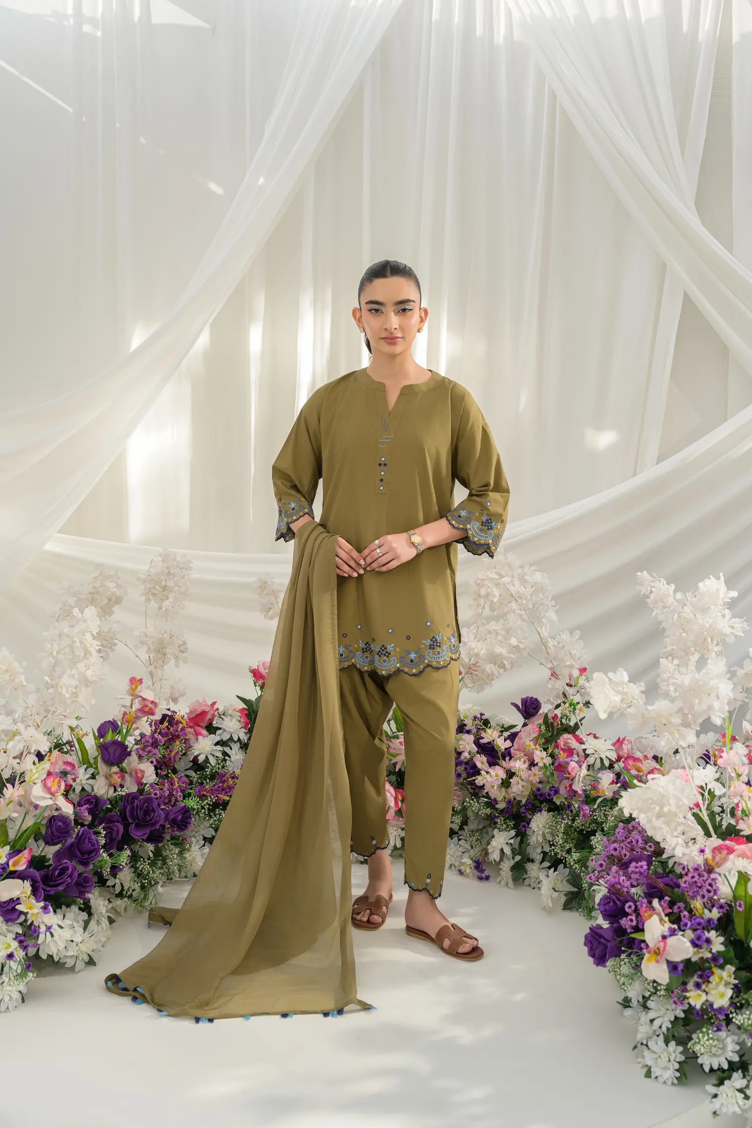 Olive coloured embroidered set that comes with short shirt and skinny shalwar. Fabric used is premium blended viscose suitable for all seasons. Dupatta is brought separately and is curated from chiffon.