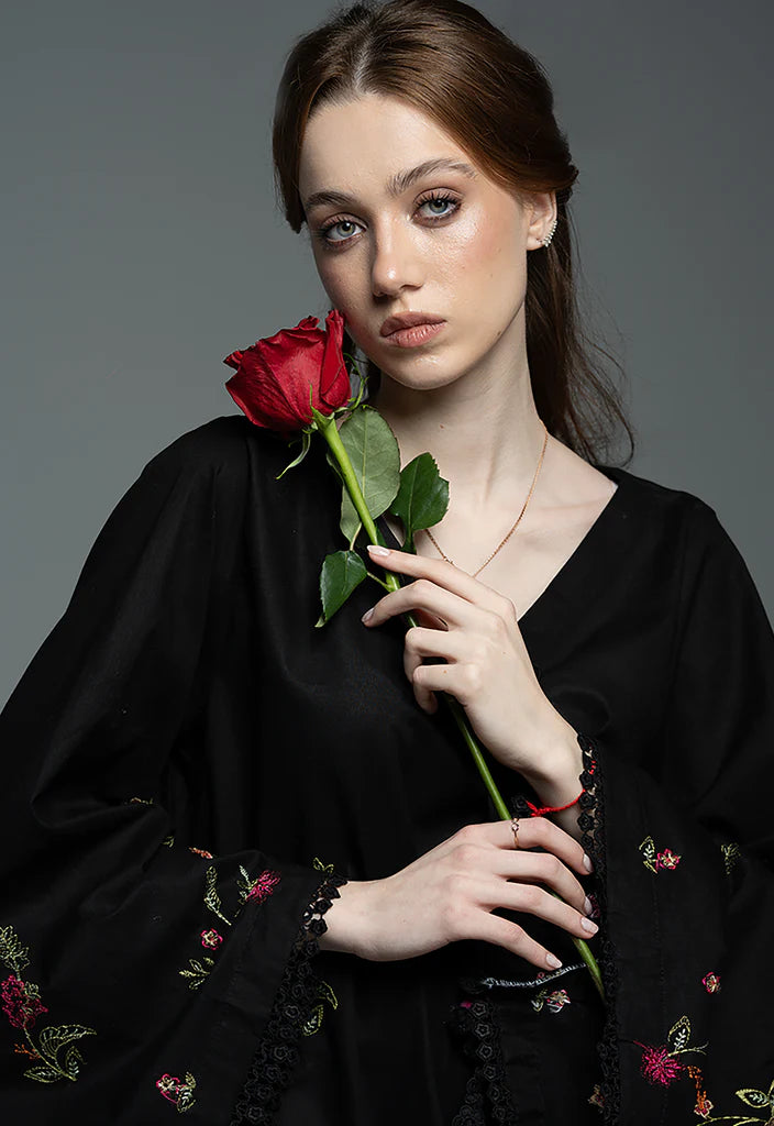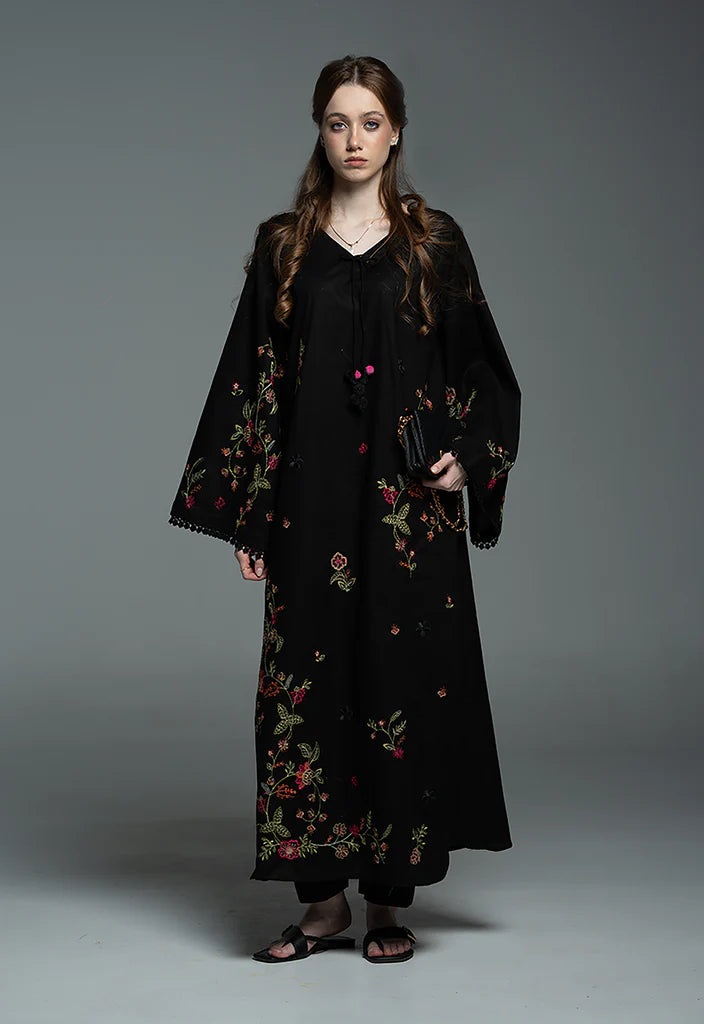 This black cotton kaaftan features a long, flowing silhouette designed for effortless comfort and elegance. Adorned with vibrant floral embroidery, the airy, loose fit and relaxed sleeves with a delicate floral lace makes it ideal for warm Eid evenings. The V-neckline is finished with a delicate dori, accented with pink and black pompoms and lace flower details at the ends. Paired with a tight trouser. A perfect blend of comfort, color, and festive charm.