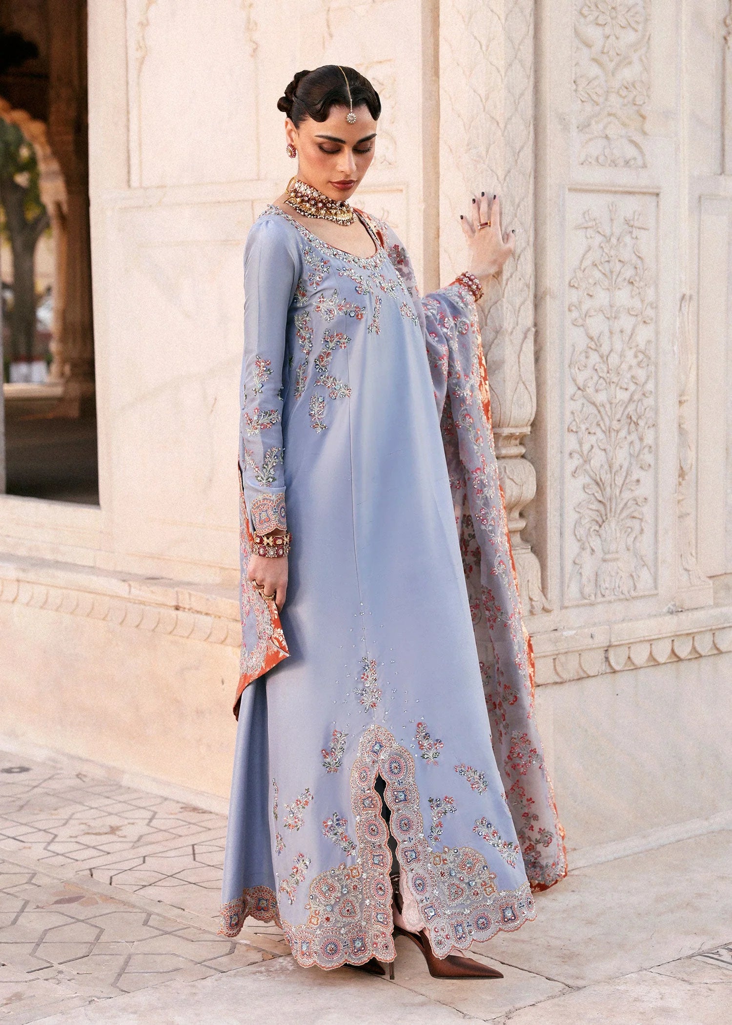 Periwinkle blue raw silk long panelled shirt adorned with embellished aari embroidery on the outfit, finished with embellished organza trims on the slits and hems. Paired with matching culottes and a fully embroidered dupatta accented with chanderi silk facings.
