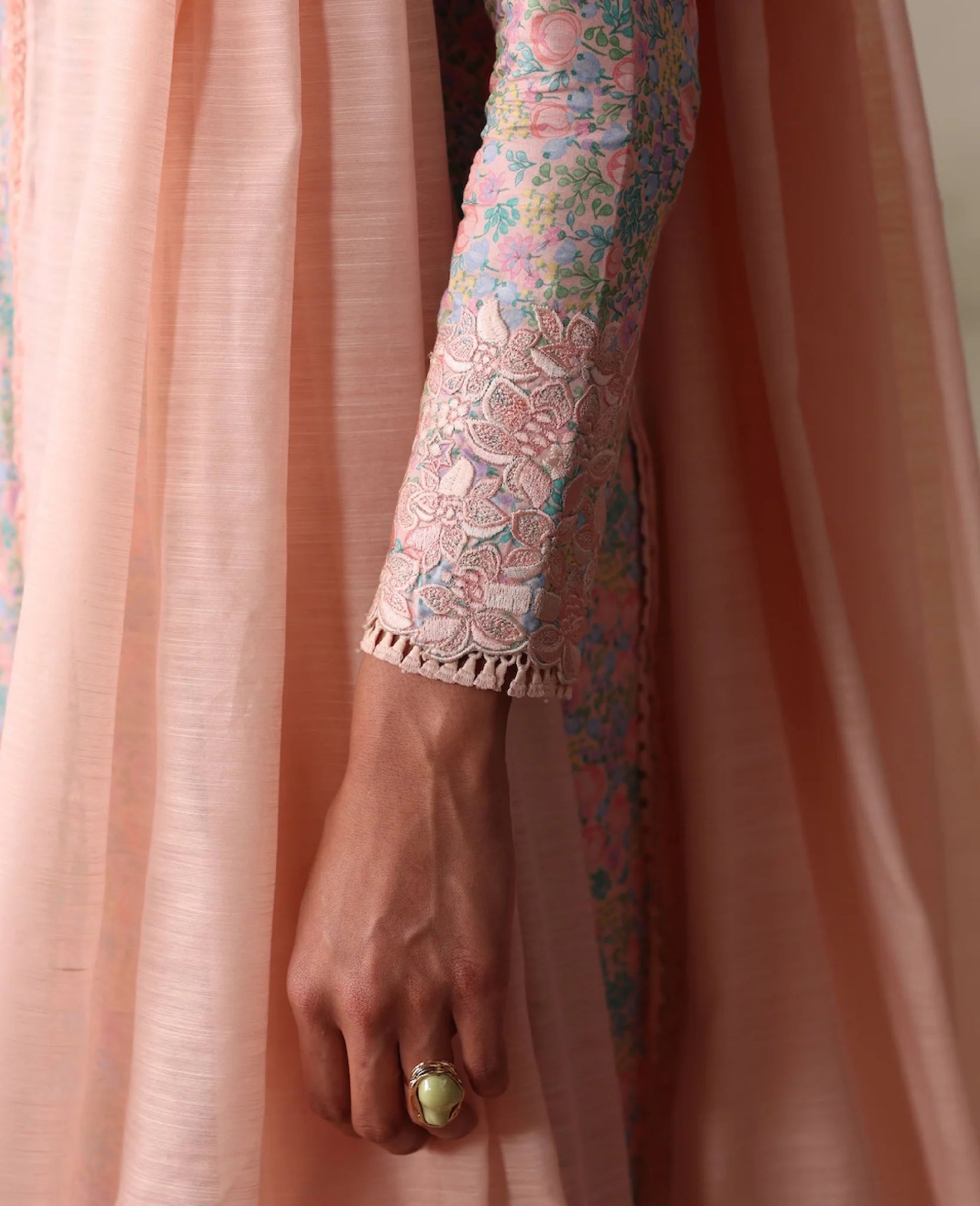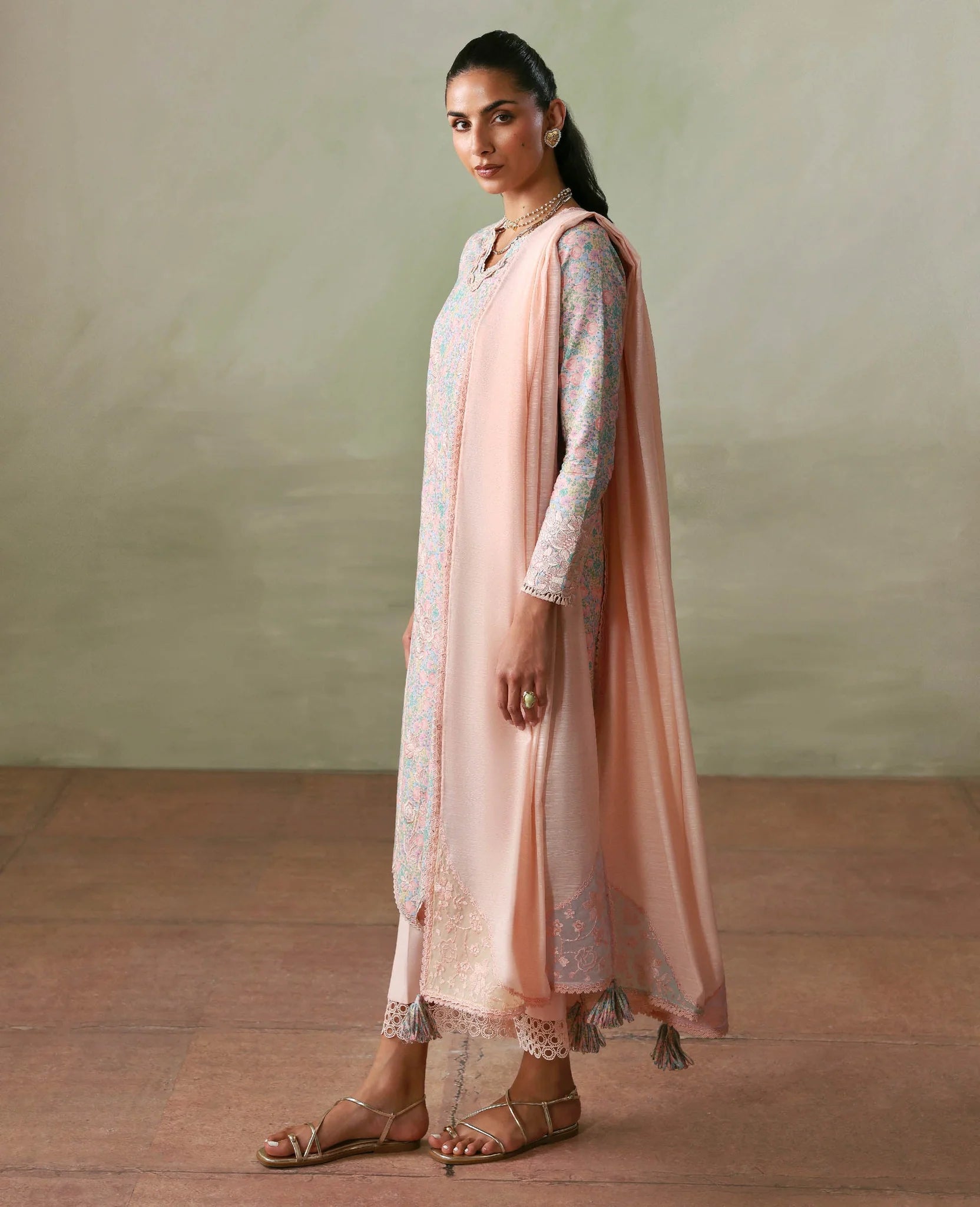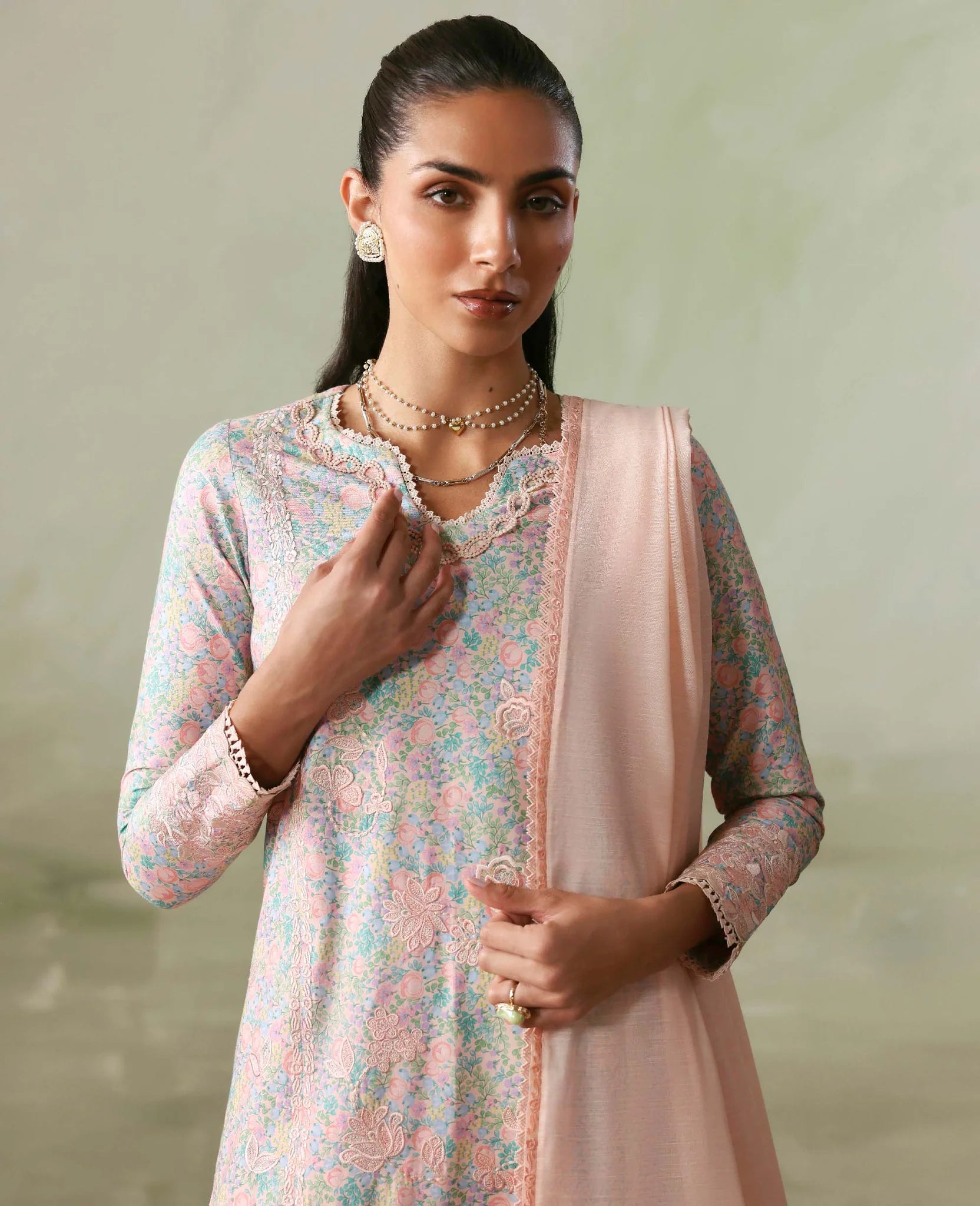 A playful lawn printed shirt designed and elevated with beautiful contrast embroidery and statement scalloped details. Paired with detailed trousers and a slub monar dupatta finished with contrast edges and delicate embroidery for a fresh, chic summer look.