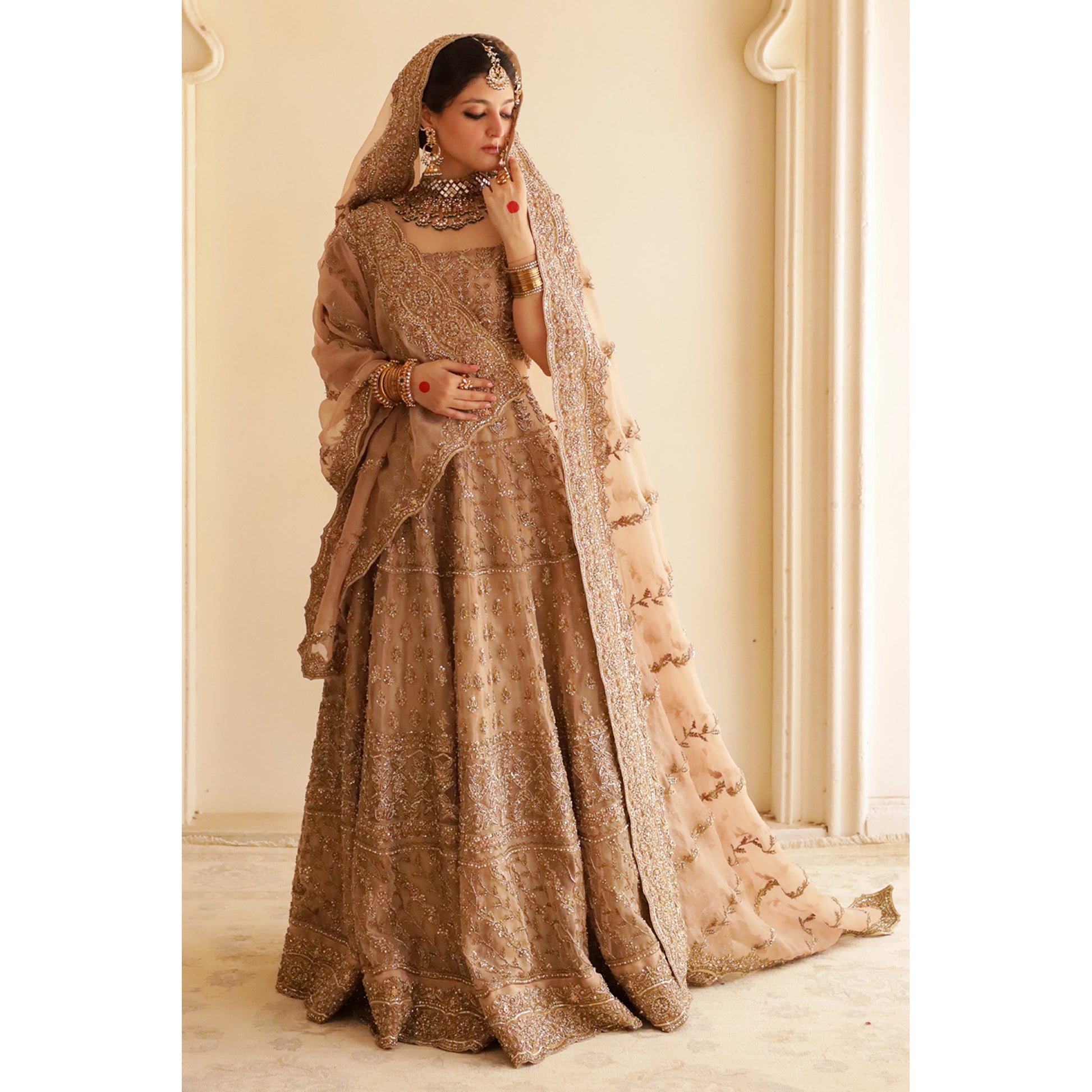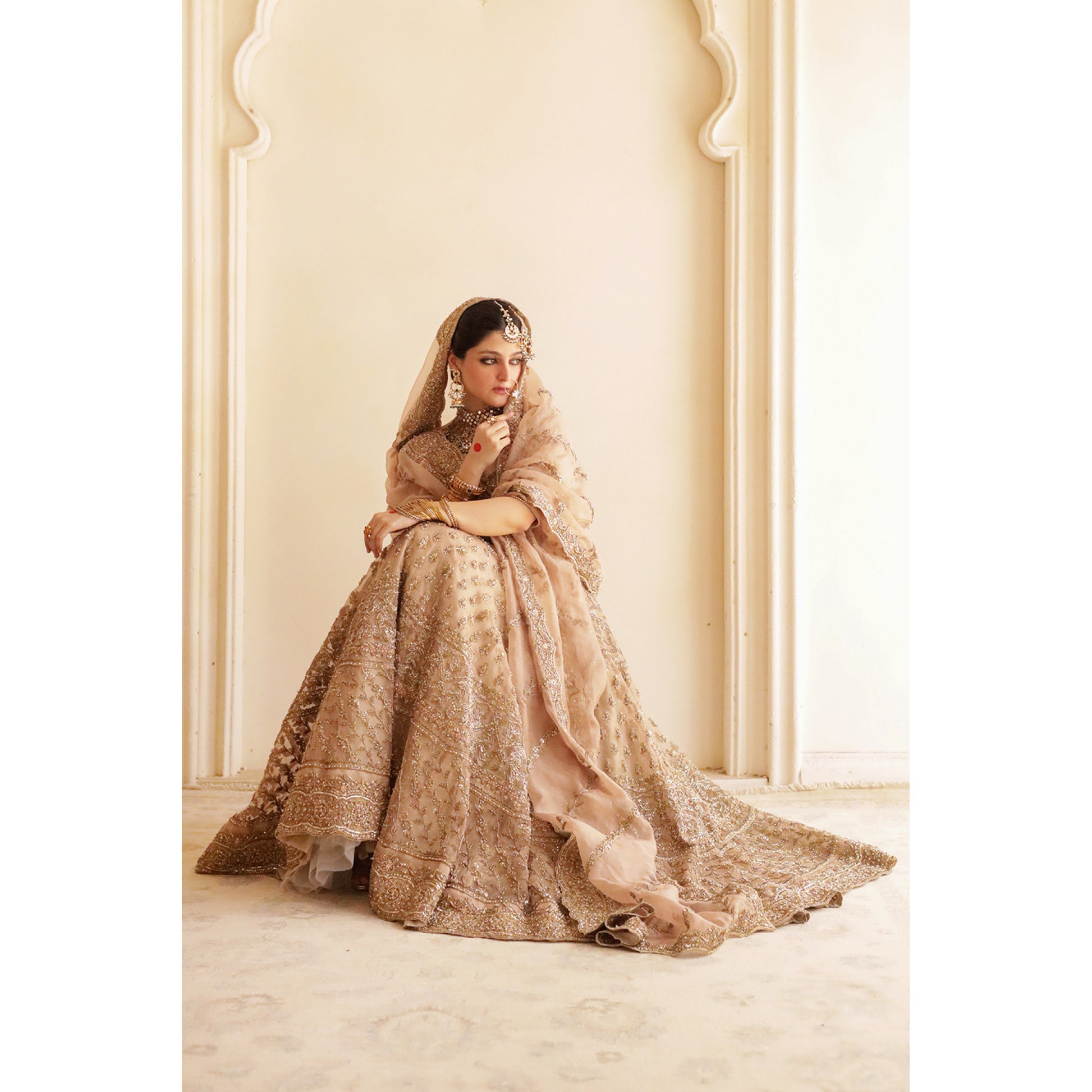 Lehenga & Choli: An enduring ensemble crafted with intricate handwork including details of pearls, baithki, resham, nakshi and dabka with the fusion of golden tissue giving it a magnificent look.