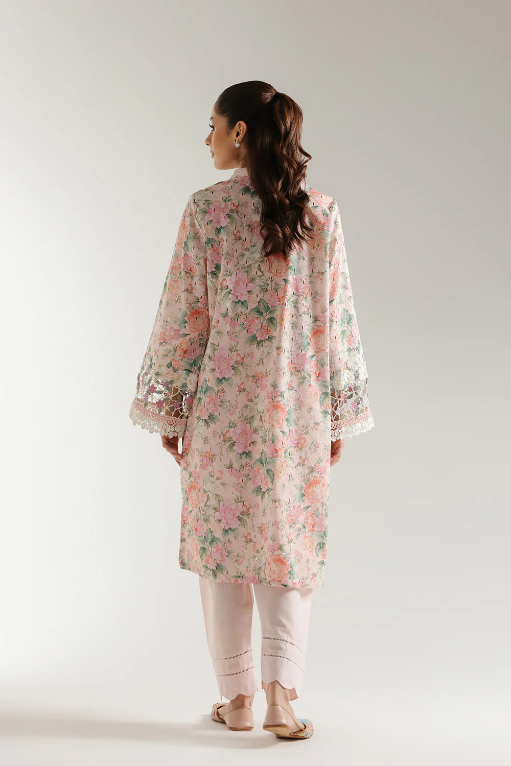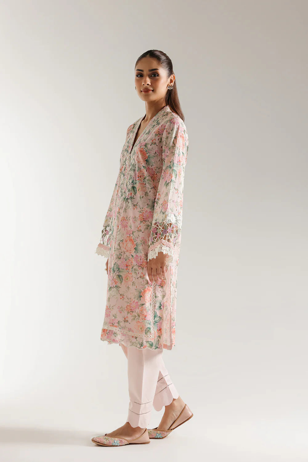 Float through your day in effortless grace with this enchanting floral schiffli ensemble. The shirt crafted from delicate schiffli embroidered fabric, showcases a soft and romantic floral print that whispers of blooming gardens. Intricate neckline detailing and charming lace accents on the sleeves add a touch of ethereal beauty. Paired with comfortable shalwar, this outfit offers a blend of timeless elegance and breezy comfort.