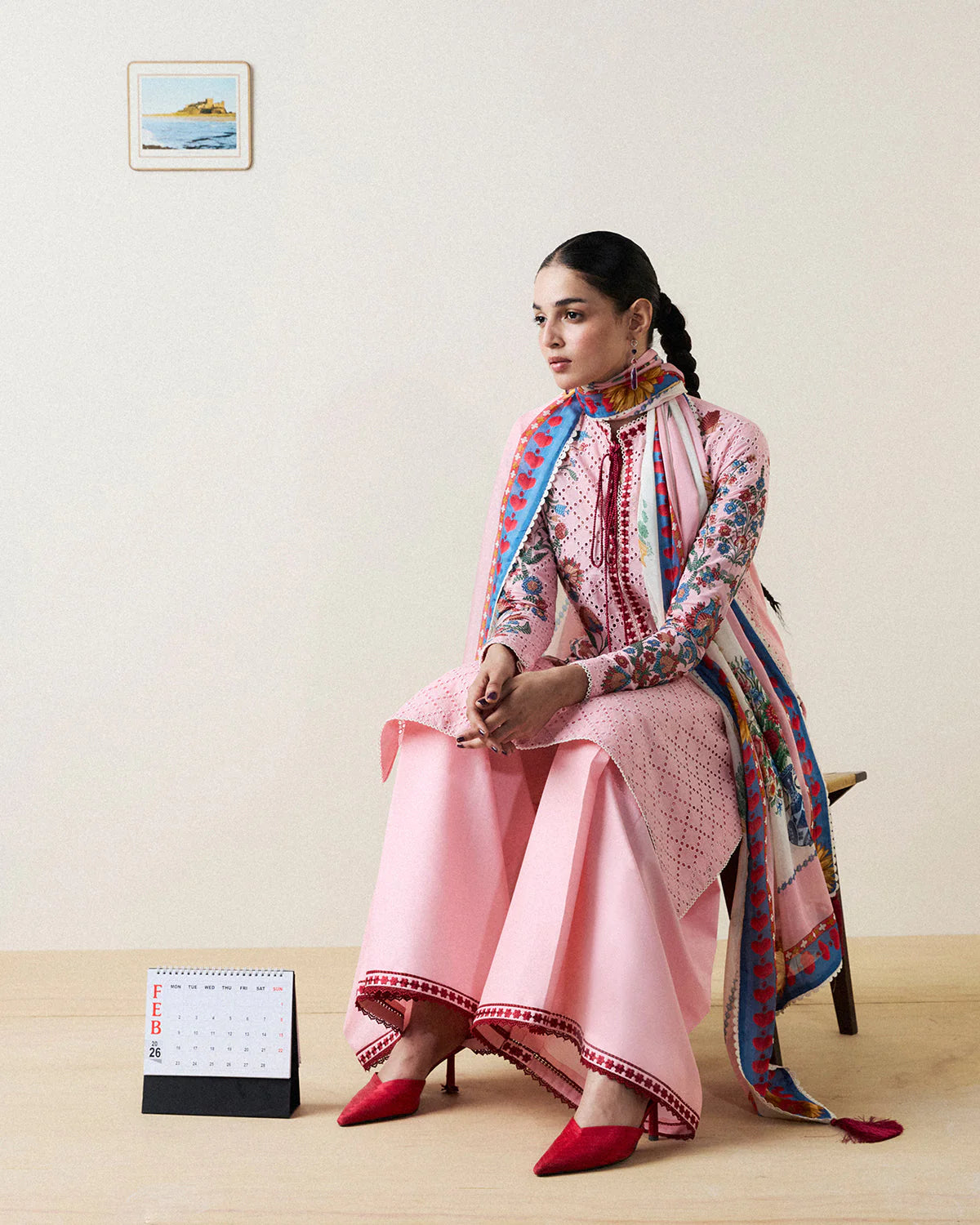 Description: A soft light pink long shirt, lavishly adorned with multicolour floral boring embroidery and delicate tassels along the neckline, paired with intricately embroidered fitted sleeves. Completed with pleated light pink trousers and a flowing digitally printed silk dupatta. Feminine, elegant, and timelessly refined.