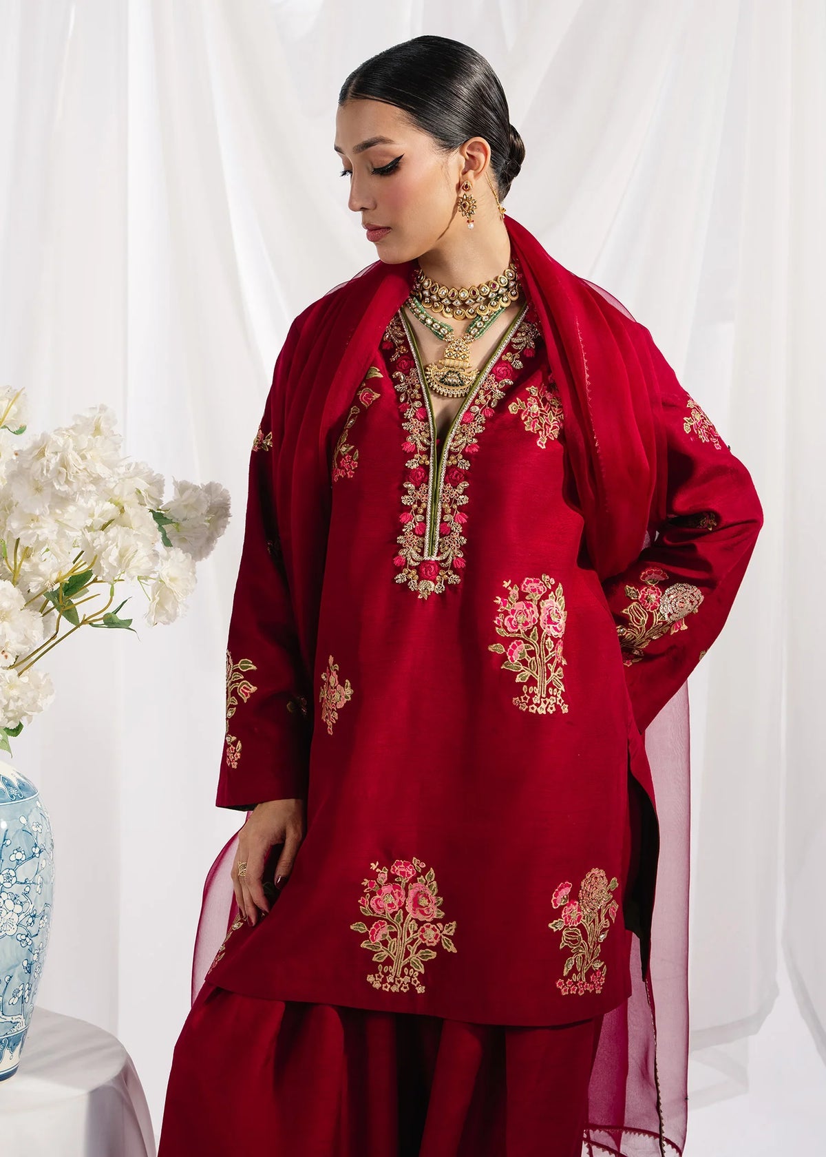 Deep red blockprinted festive set with block printing and handworked delicate resham neckline.