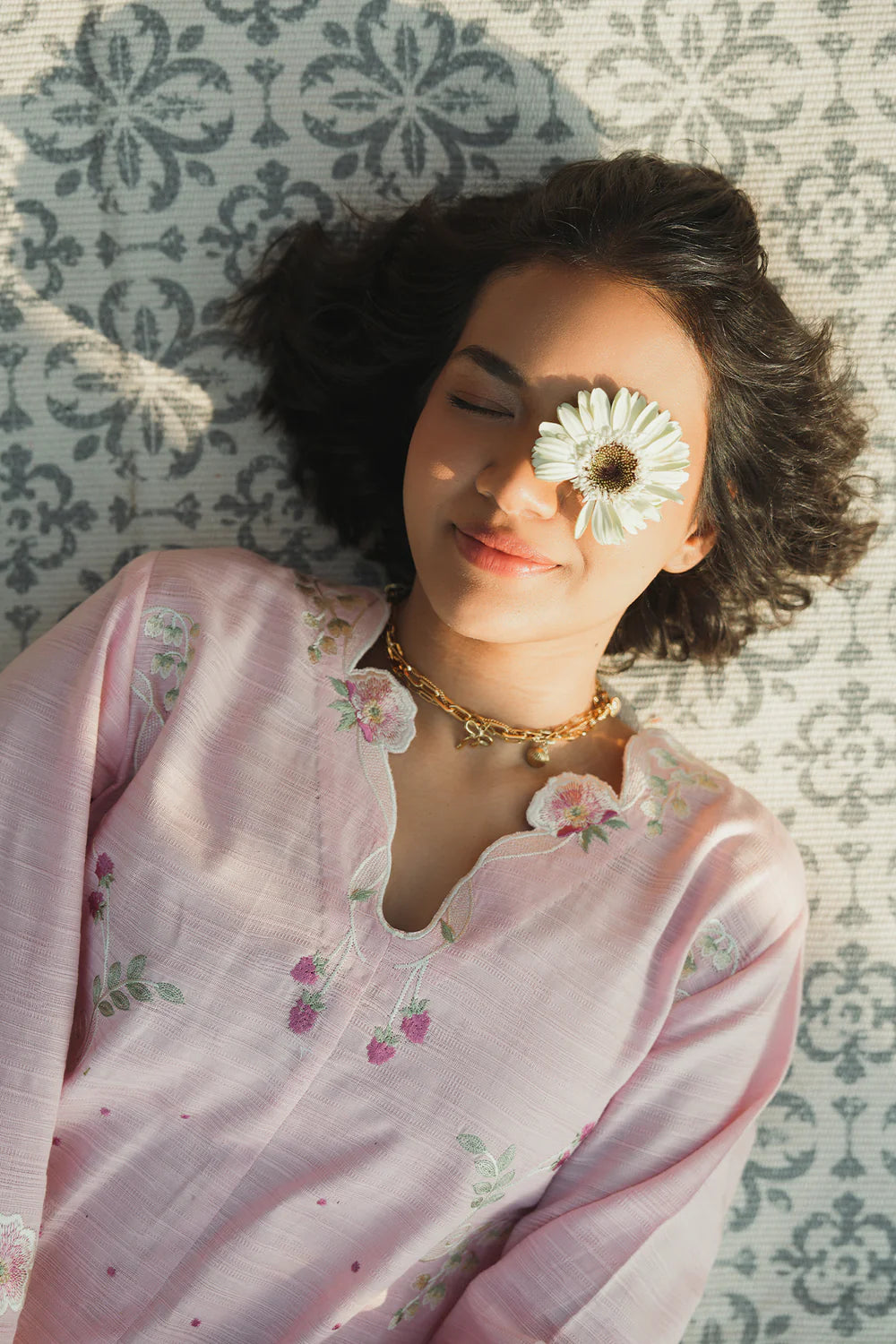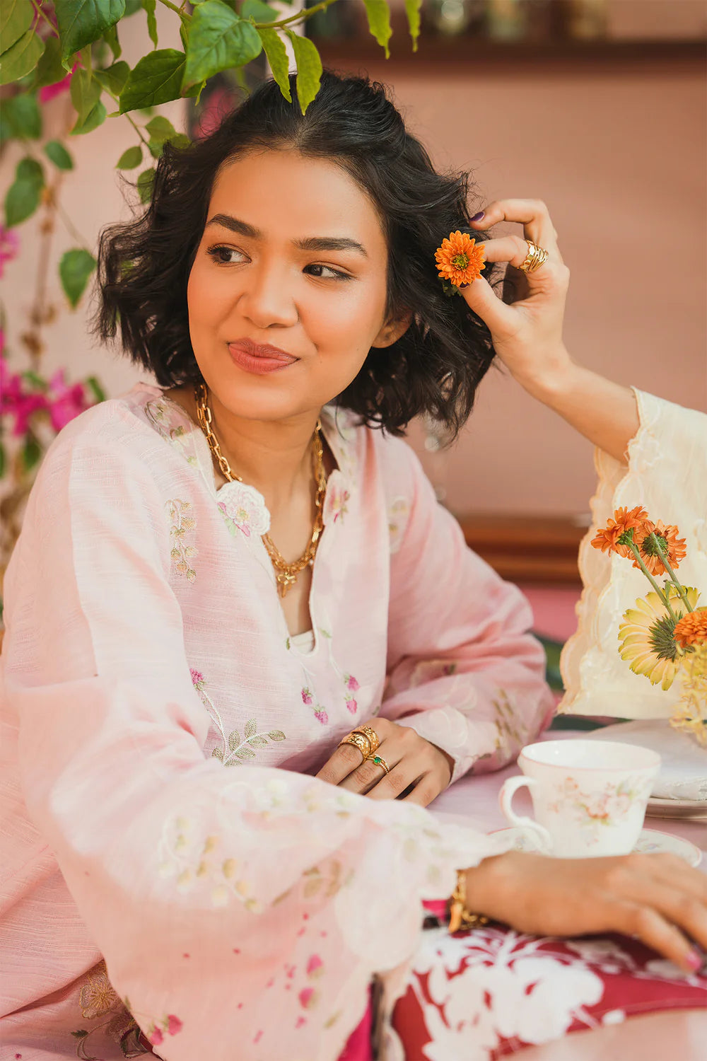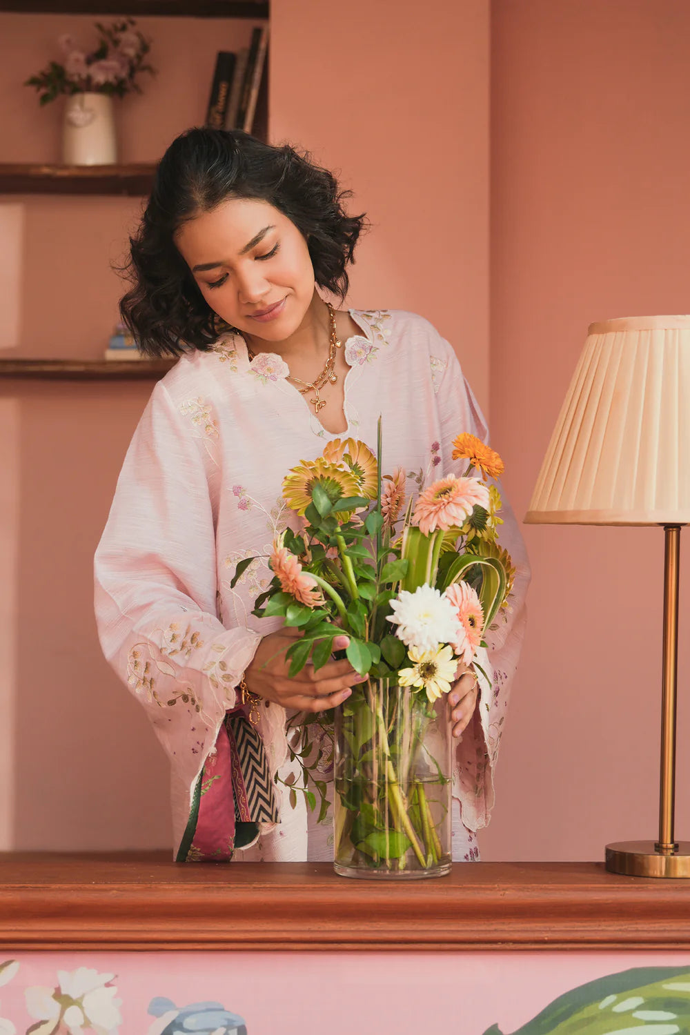 Elevate your spring wardrobe with this exquisite embroidered kurta set. The soft pastel pink kurta features delicate floral motifs in complementary hues, crafted from lightweight, breathable fabric with a subtle sheen for all-day comfort. The scalloped V-neckline and bell sleeves showcase intricate white embroidery and lace detailing, while the modern short-to-medium length keeps the silhouette contemporary. Paired with elegantly draped wide-leg trousers, this ensemble seamlessly blends traditional ethnic craftsmanship with current fashion sensibilities, making it perfect for casual gatherings or festive occasions.