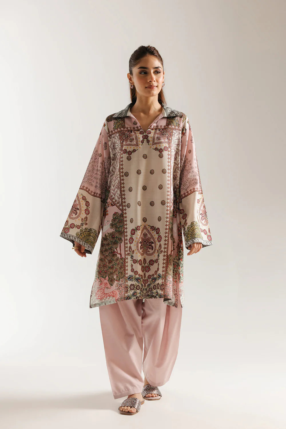 Step into a world of vintage-inspired elegance with this artistic two-piece printed suit, featuring a captivating collage of motifs set against a soft, dusty pink palette. The mid-length shirt serves as a canvas for a rich tapestry of prints, including delicate floral arrangements and classical architectural details in earthy tones of olive and burgundy. Designed with a structured classic collar and a deep V-neckline, the shirt balances sophisticated tailoring with relaxed, wide sleeves for a contemporary silhouette. Completing the ensemble is matching loose-fit shalwar in a solid dusty pink hue, providing a graceful and comfortable finish to this statement look. Perfect for those who appreciate detailed artistry and effortless style, this suit is a versatile addition to any curated wardrobe.