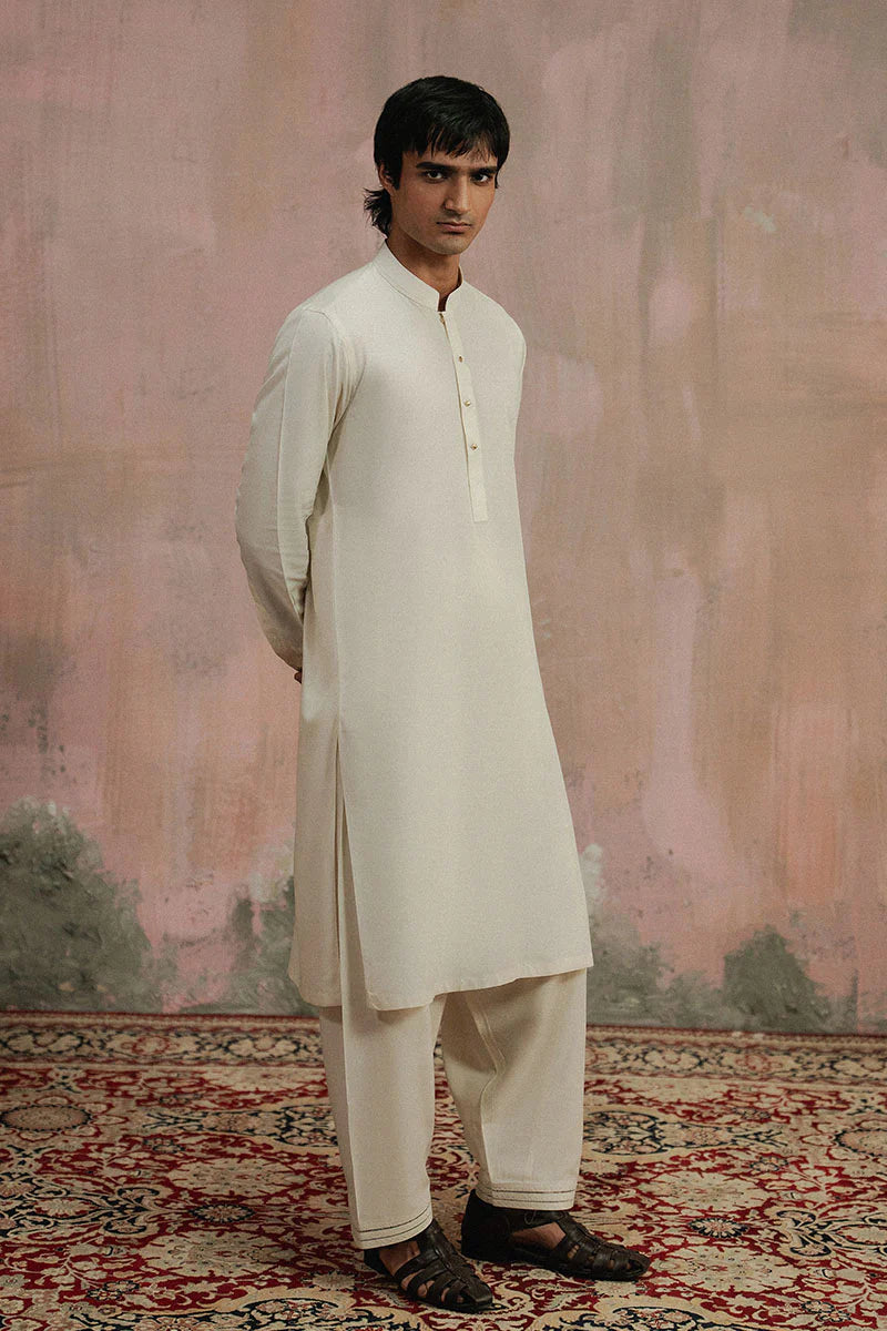 Ivory premium boski Shalwar Kameez. Meticulously designed and detailed with classic tone on tone golden buttons. Detailed with box cut band collar, front button placket and pleated cuffs.