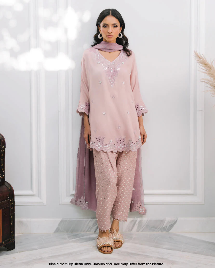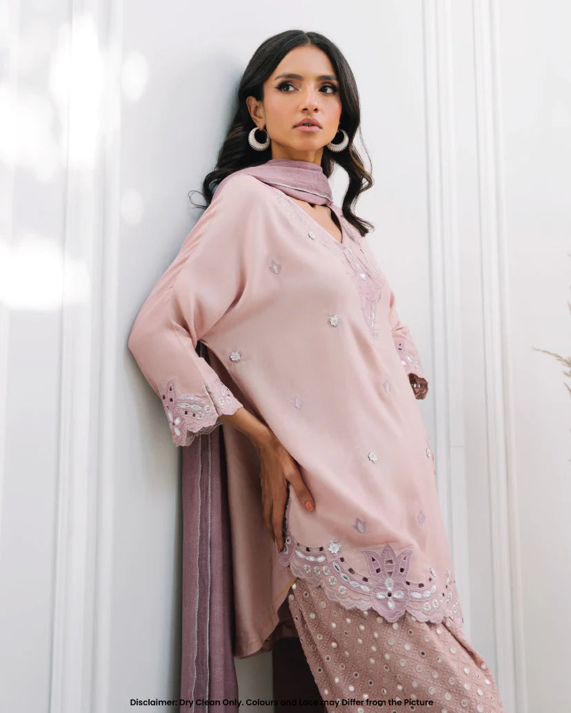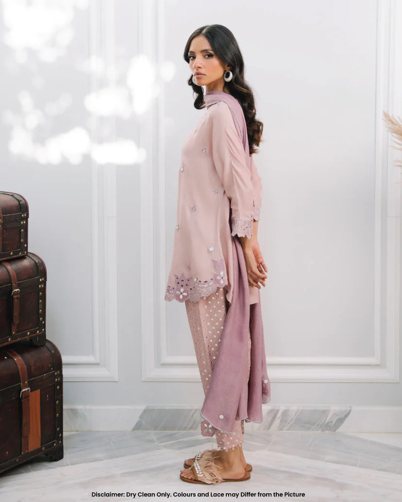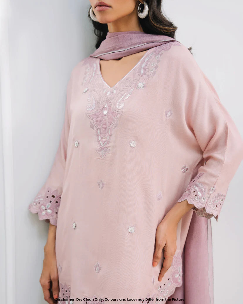 The look is completed with a beautifully crafted khaadi cotton dupatta, finished with detailed embroidery and applique edging for a graceful touch.