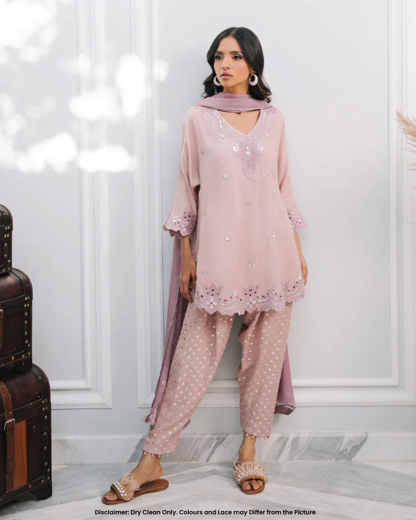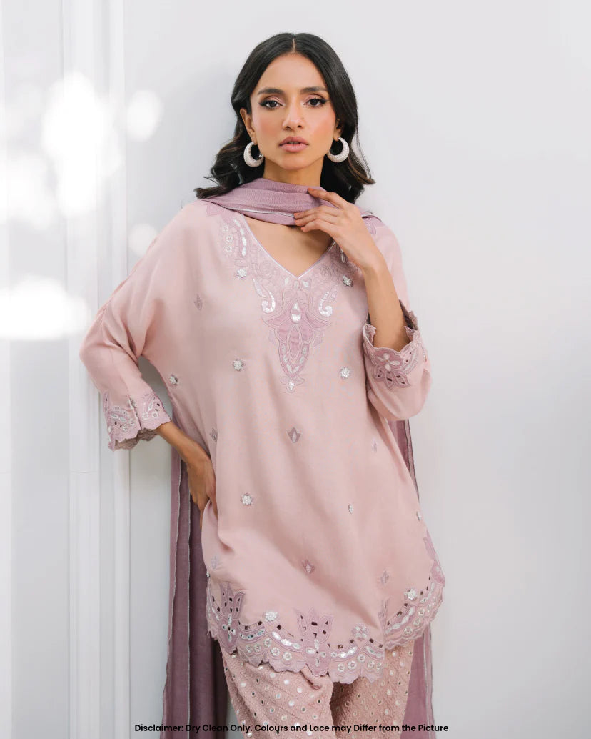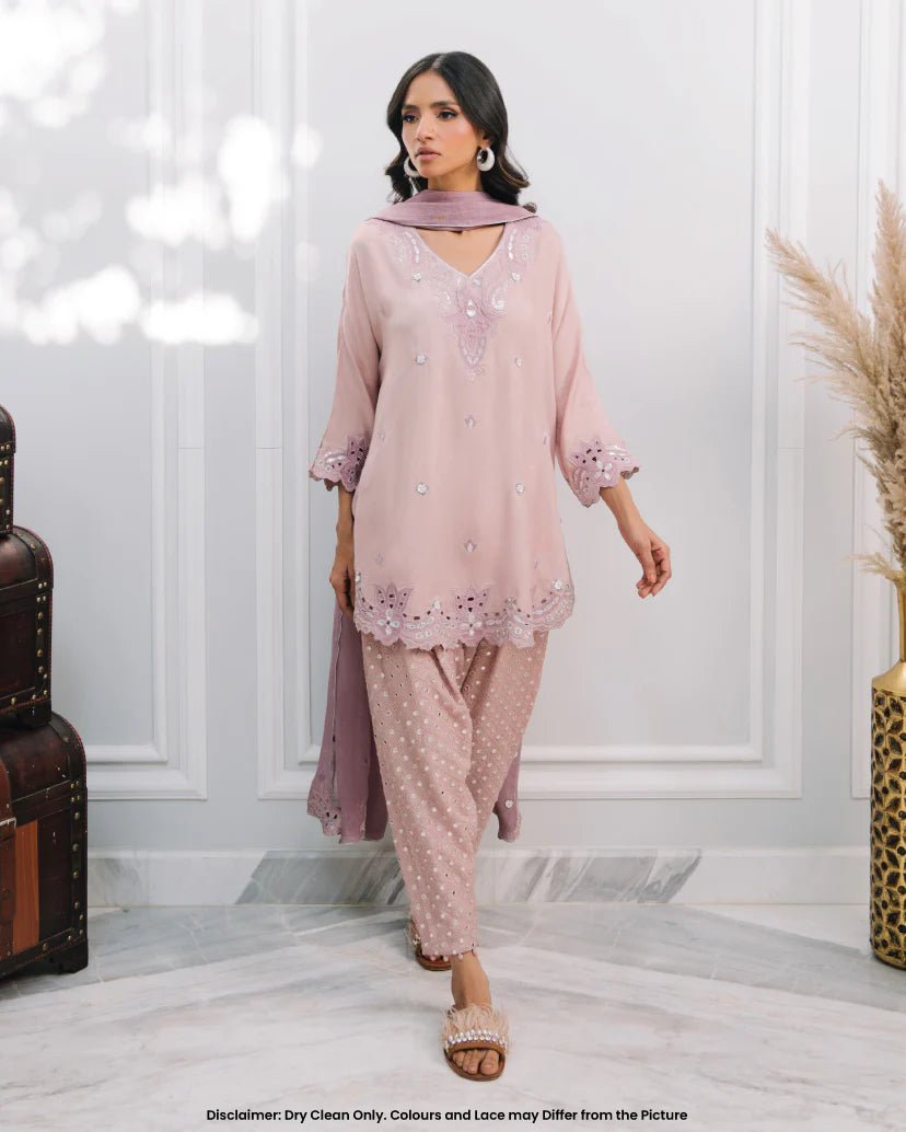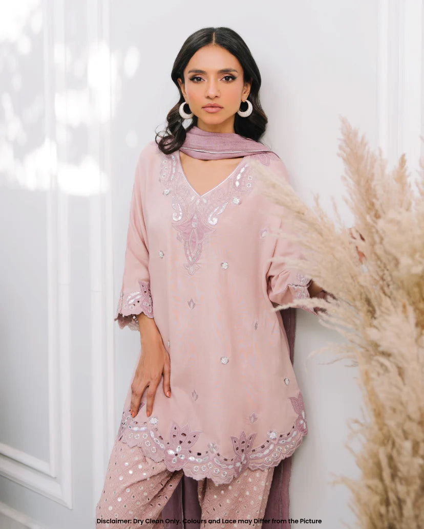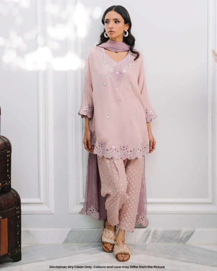The look is completed with a beautifully crafted khaadi cotton dupatta, finished with detailed embroidery and applique edging for a graceful touch.