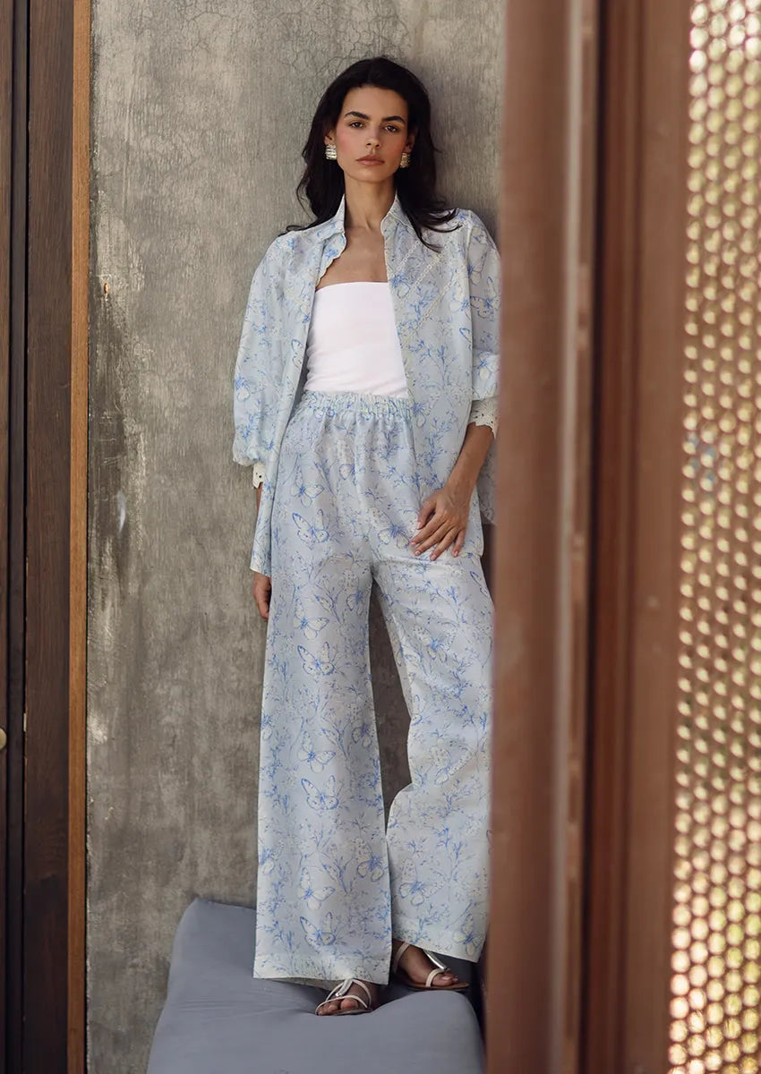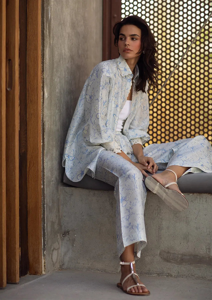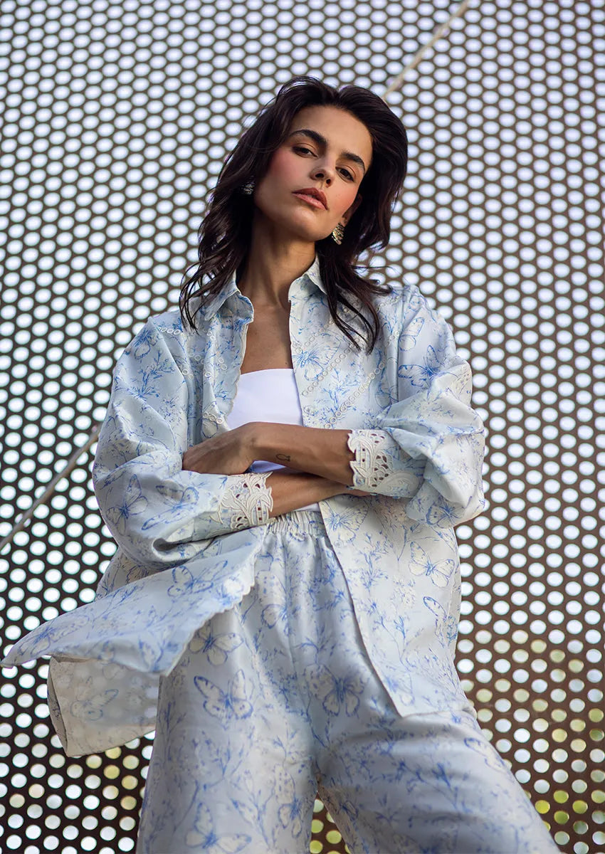 The Bria co-ord set is a romantic, coordinated ensemble crafted from pure raw silk. The button-down shirt features an ethereal monochromatic butterfly and floral print in soft periwinkle, with a scalloped collar and delicate eyelet and cutwork detailing across the cuffs. This set strikes a whimsical yet polished balance, perfect for refined lounging or resort travel.