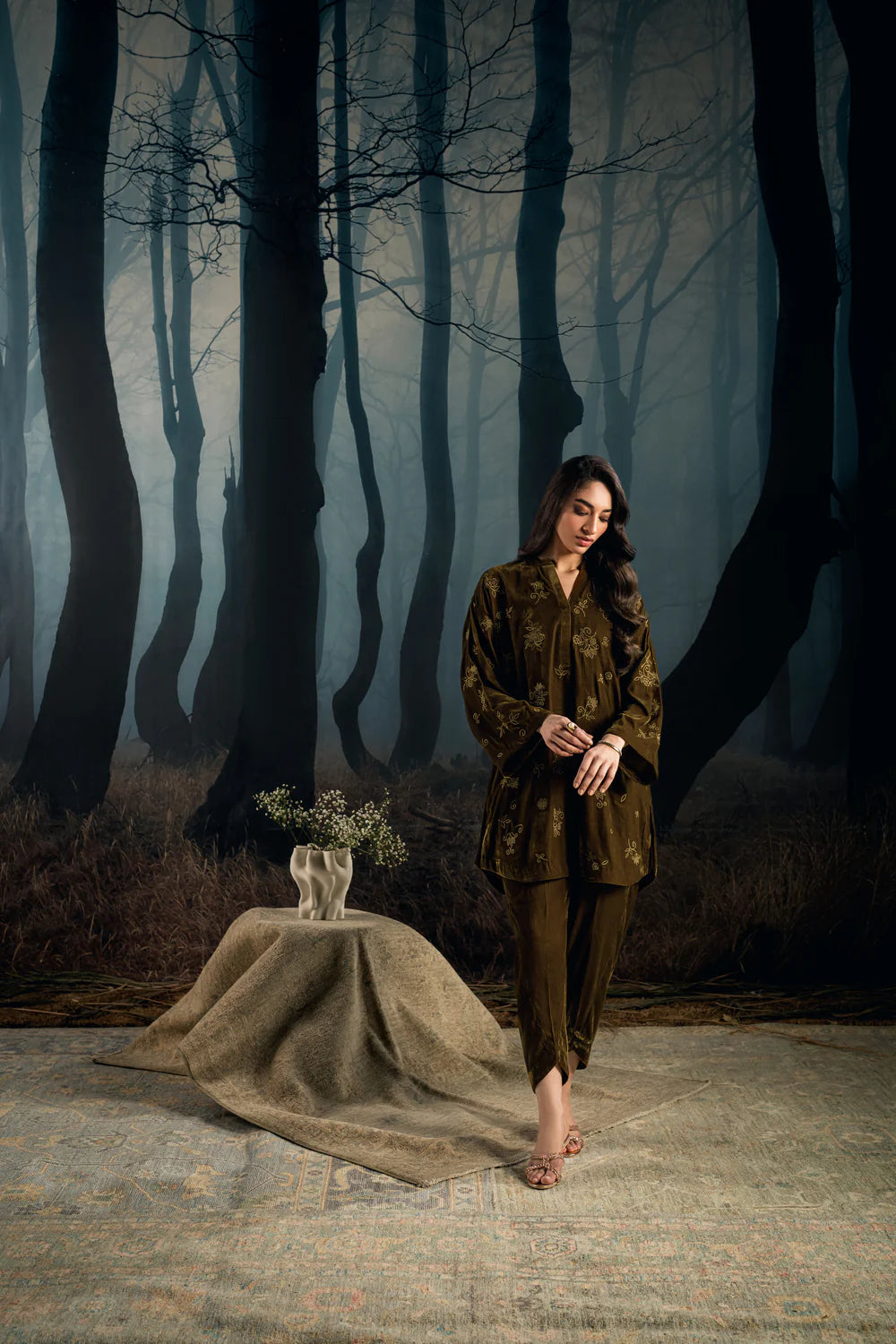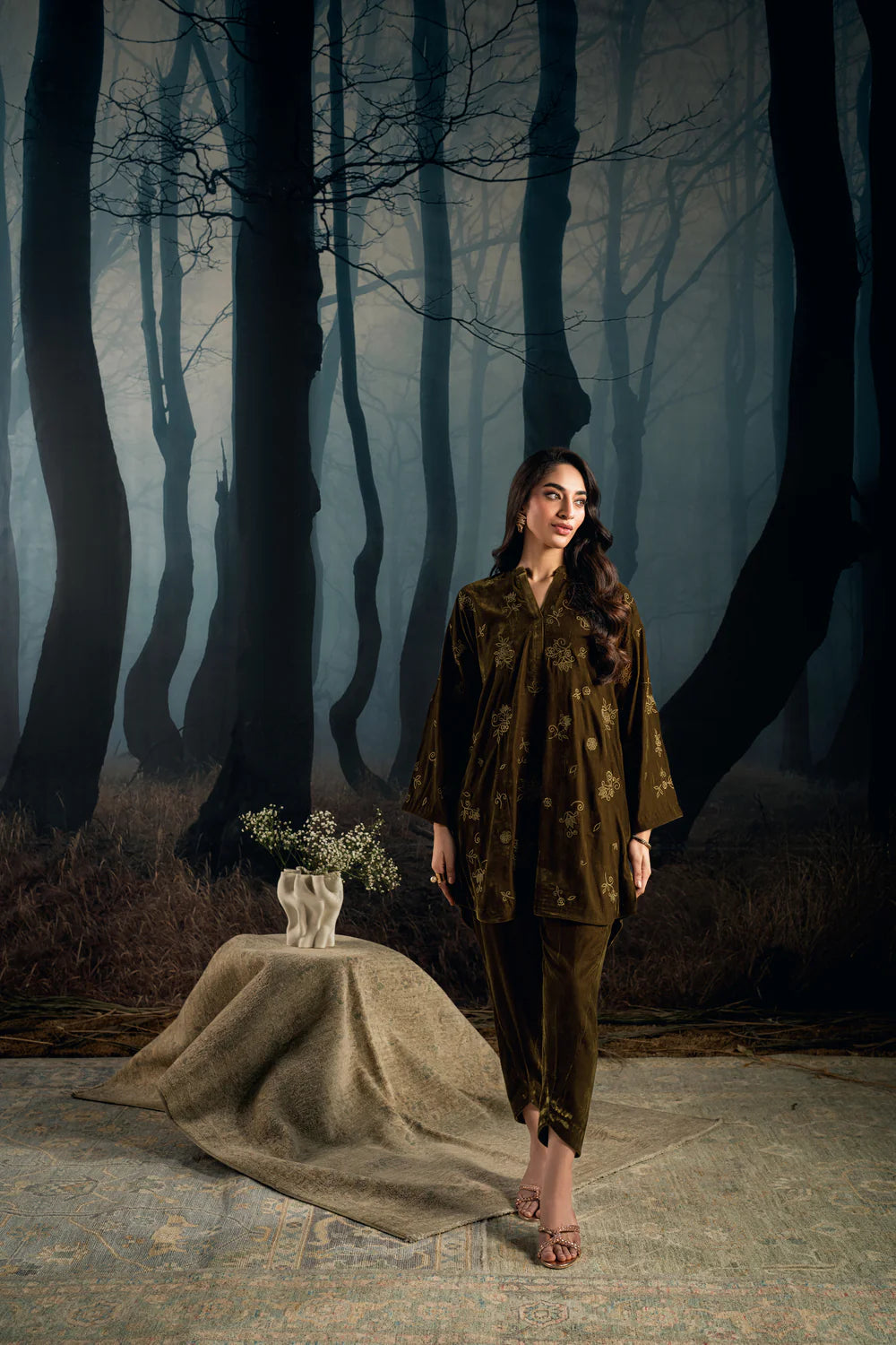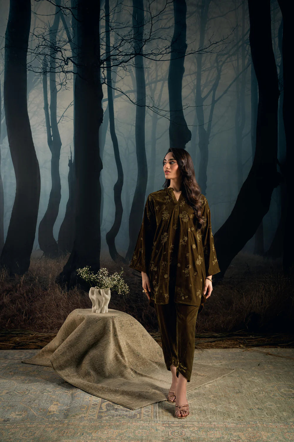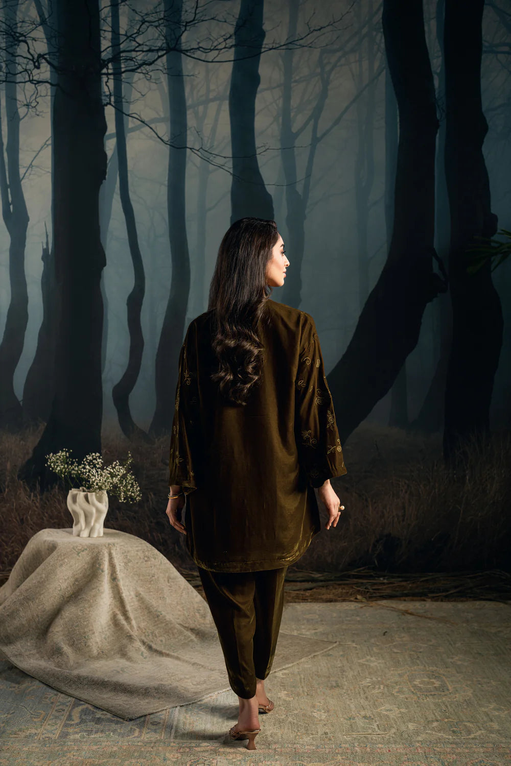 A rich velvet kurta adorned with soft floral embroidery scattered across the front and sleeves. The relaxed silhouette drapes smoothly, creating an easy, graceful fall. Paired with matching velvet trousers, it’s a warm, statement piece with a touch of festive charm.
