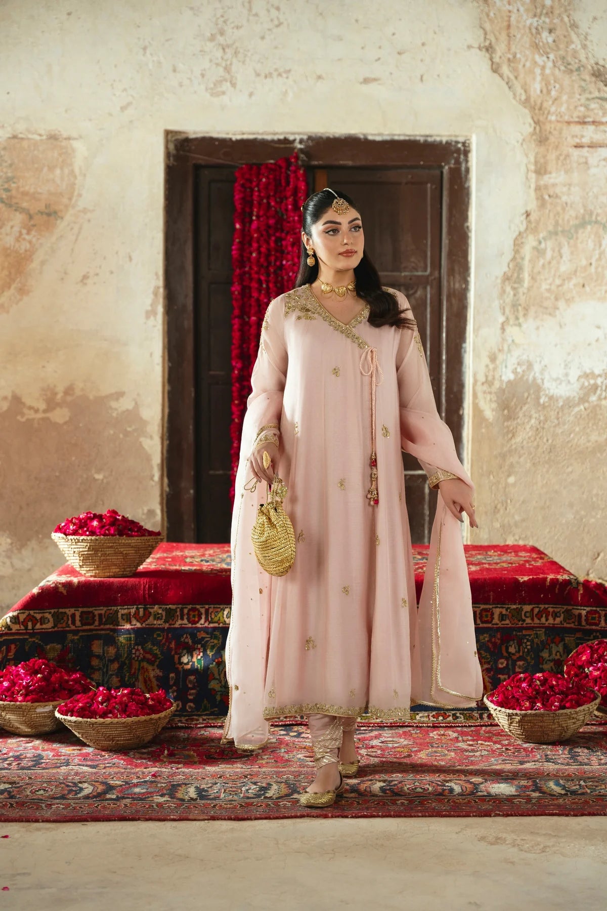 Curated on pure handloom cotton net in the most beautiful dusky pink Kashmiri chai hue. Rani Bagh is adorned with the most beautiful intricate gold Ada/handwork of dabka, nagshi, sequins, moti and katori nug. This design is paired with a matching pure soft tissue organza dupatta and chooridar with gotah accents. If you like subtle elegance, Rani Bagh will be your new favourite this festive season.