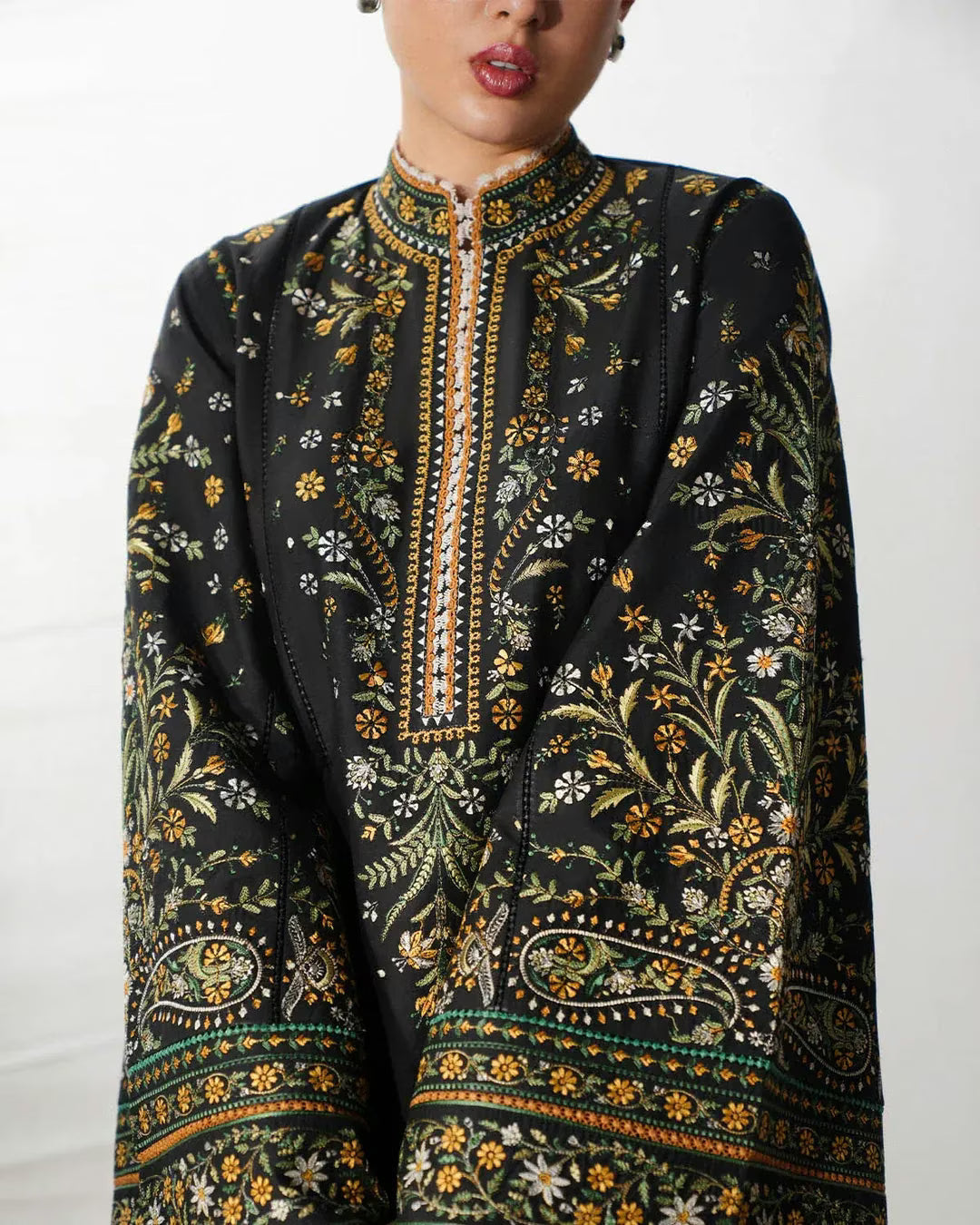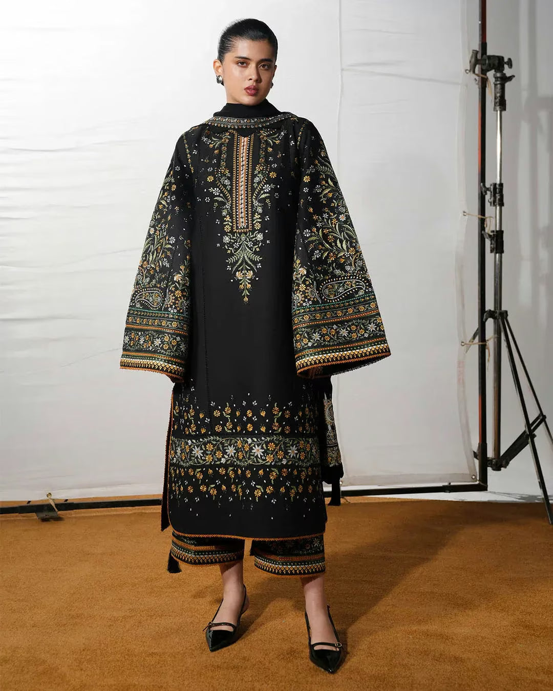 A striking black long shirt, richly adorned with multicolour traditional embroidery and delicate tilla work, exudes timeless sophistication. The matching bell sleeves, detailed with the same intricate embroidery and tilla, add a graceful, flowing dimension. Paired with black dyed culottes featuring embroidered borders, the ensemble is completed with a multicolour, tilla-embroidered chiffon dupatta, bringing movement, texture, and a refined classical charm to the overall look.