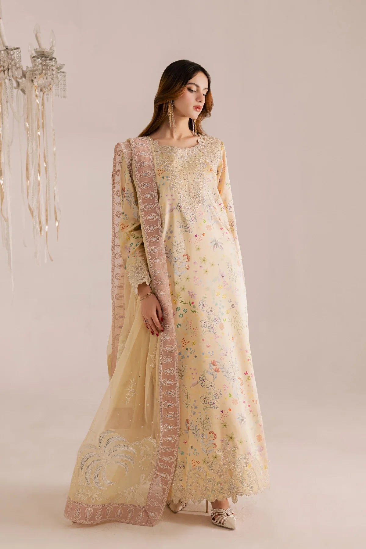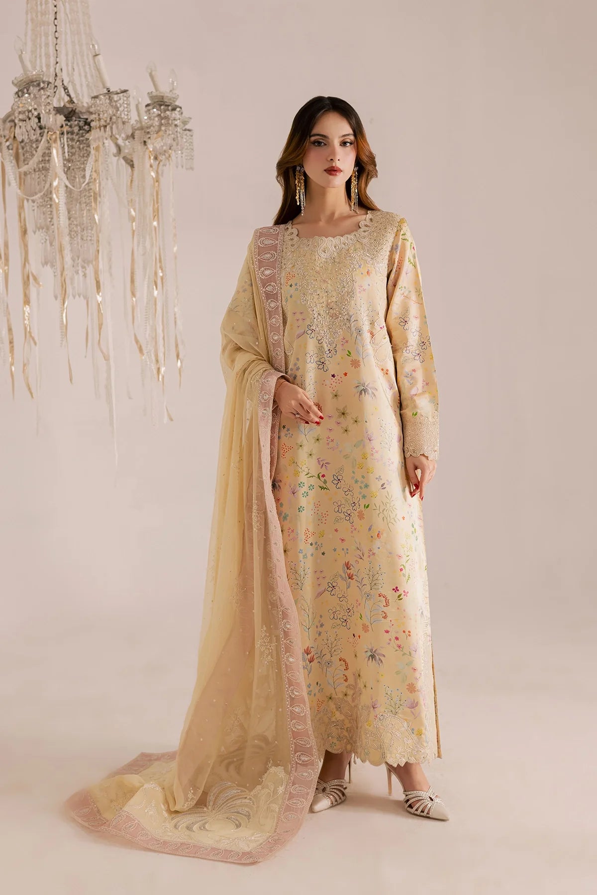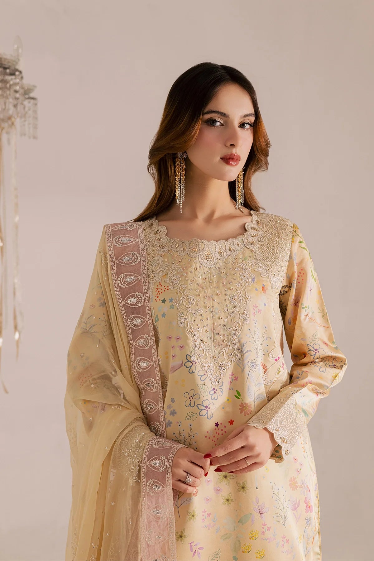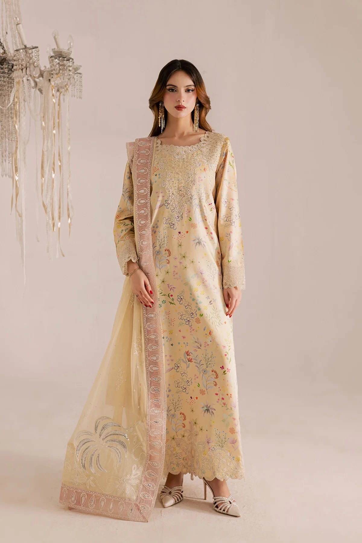Elegant shirt with intricate embroidery paired with a zari chiffon dupatta and plain trousers for a refined, timeless look.