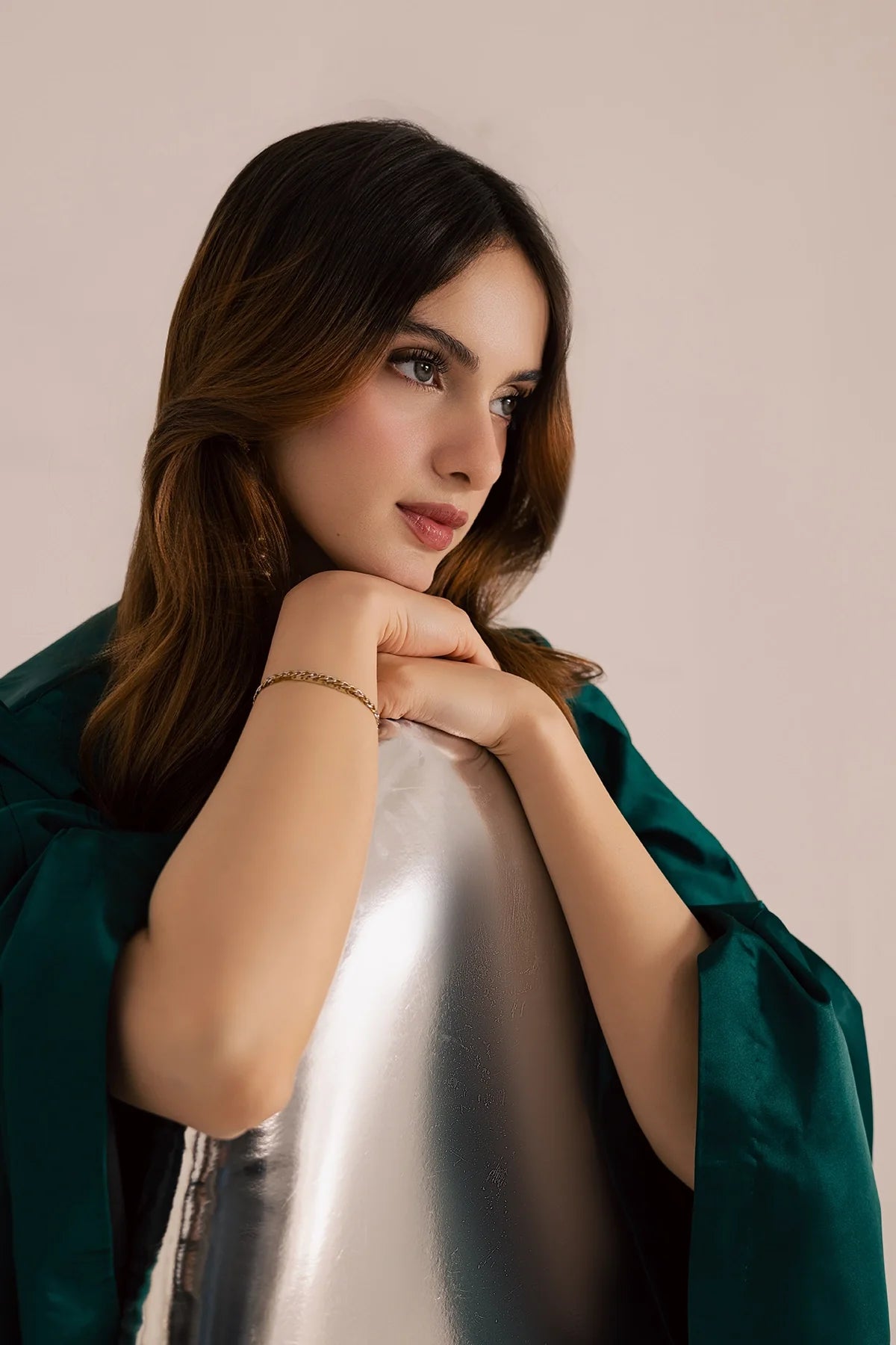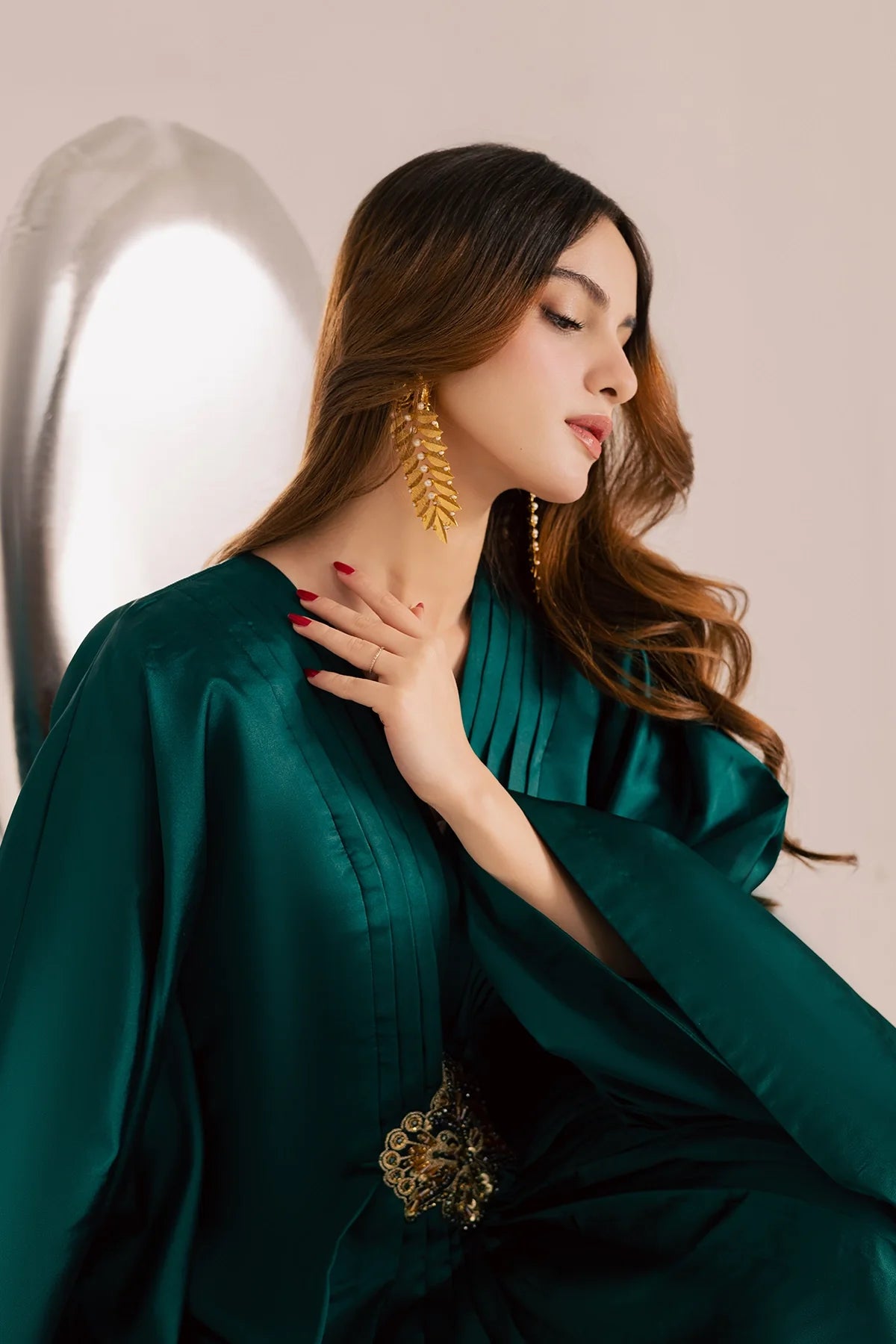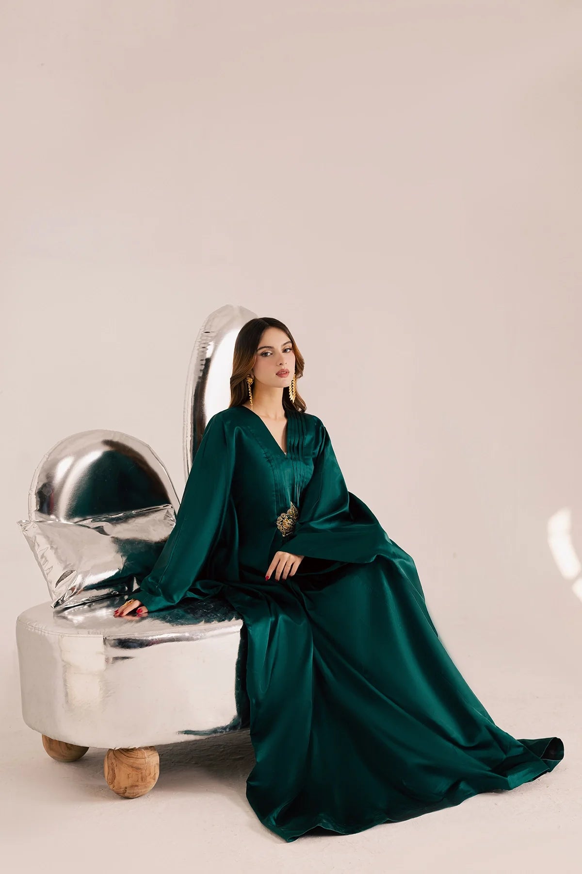 A rich emerald green silk kaftan in a refined fusion silhouette, accented with a hand-embellished stone brooch, perfect for an elegant iftar dinner.