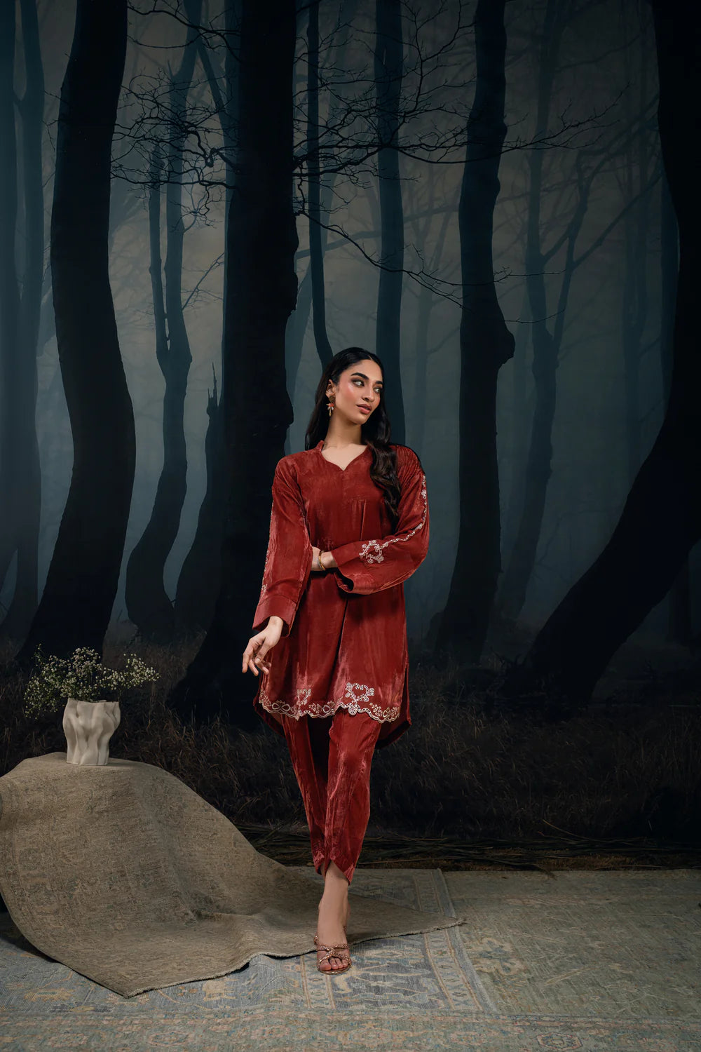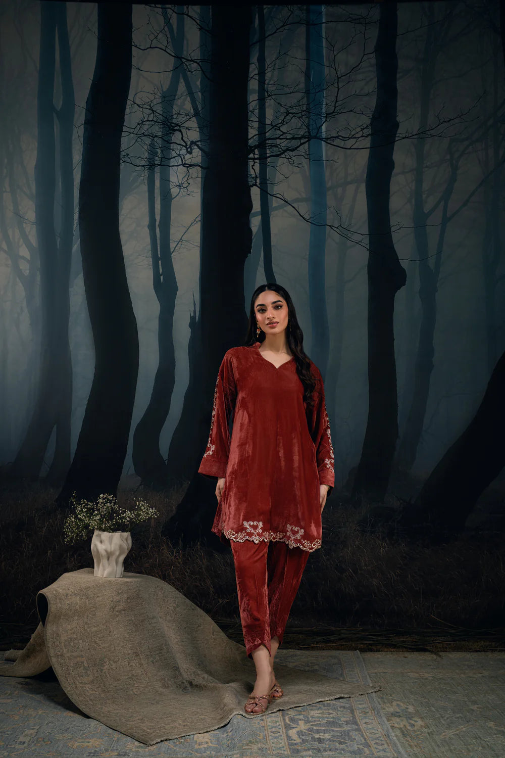 A rust-toned velvet kurta with light embroidery detailing on the sleeves and lower hem. The soft neckline and straight cut make it an easy, graceful winter staple, paired with matching trousers.