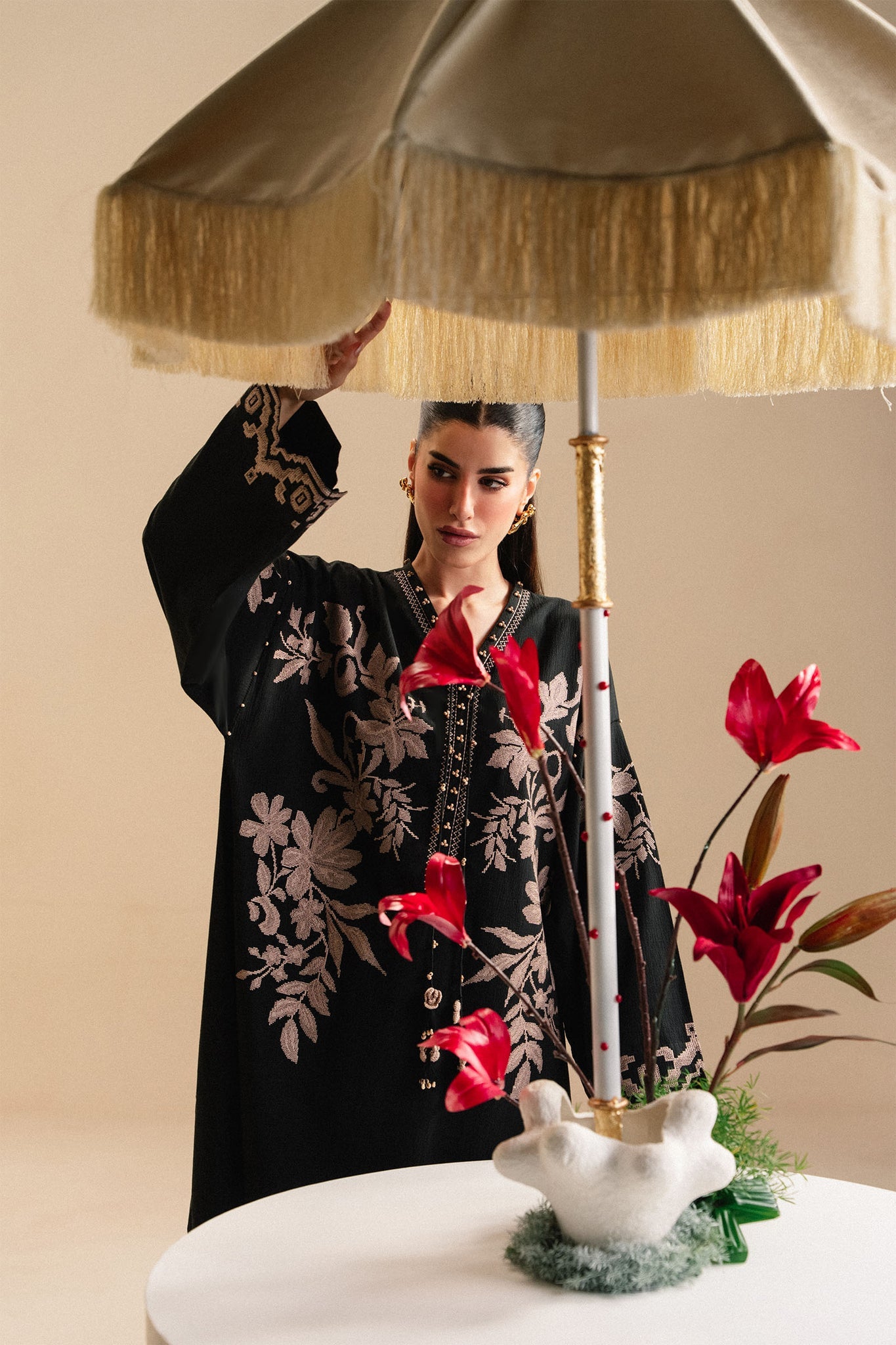 Draped in deep black canvas, Reya moves like a serene winter night. Soft cream floral embroideries bloom delicately at the neckline, glowing against the rich darkness, while black scalloped embroidered pants add subtle depth and texture.