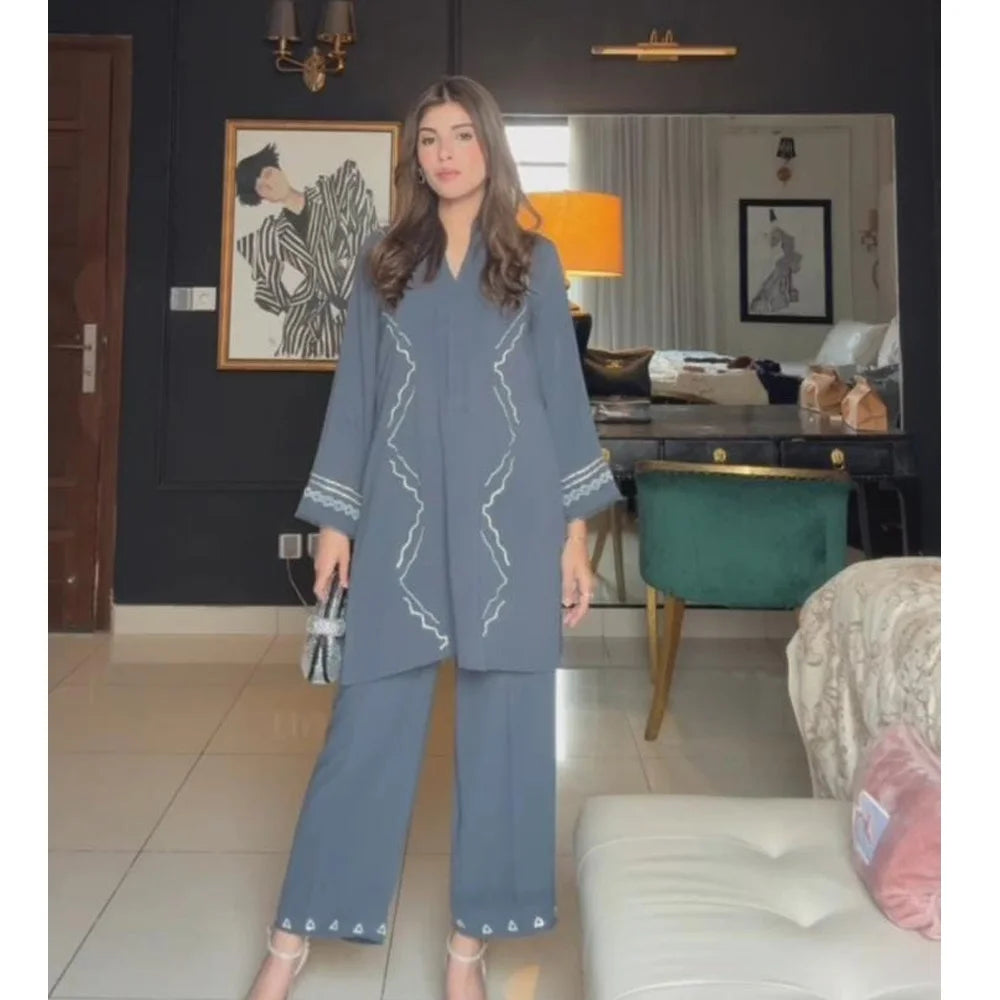 A sophisticated Steel Grey-Blue outfit featuring a smart cut with stunning swarovski and embroiderd front. Intricate swarovski work and embroidery on sleeves