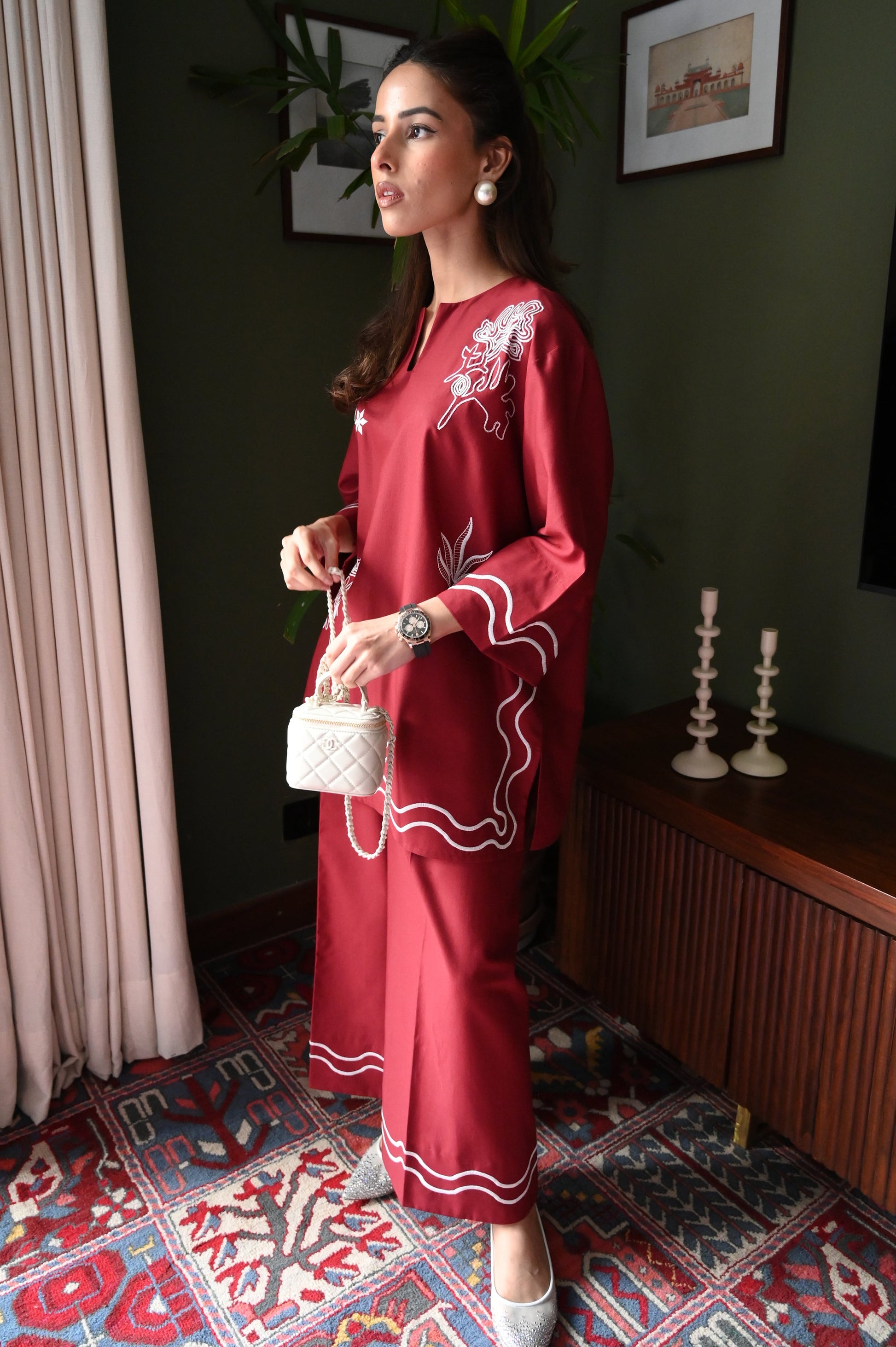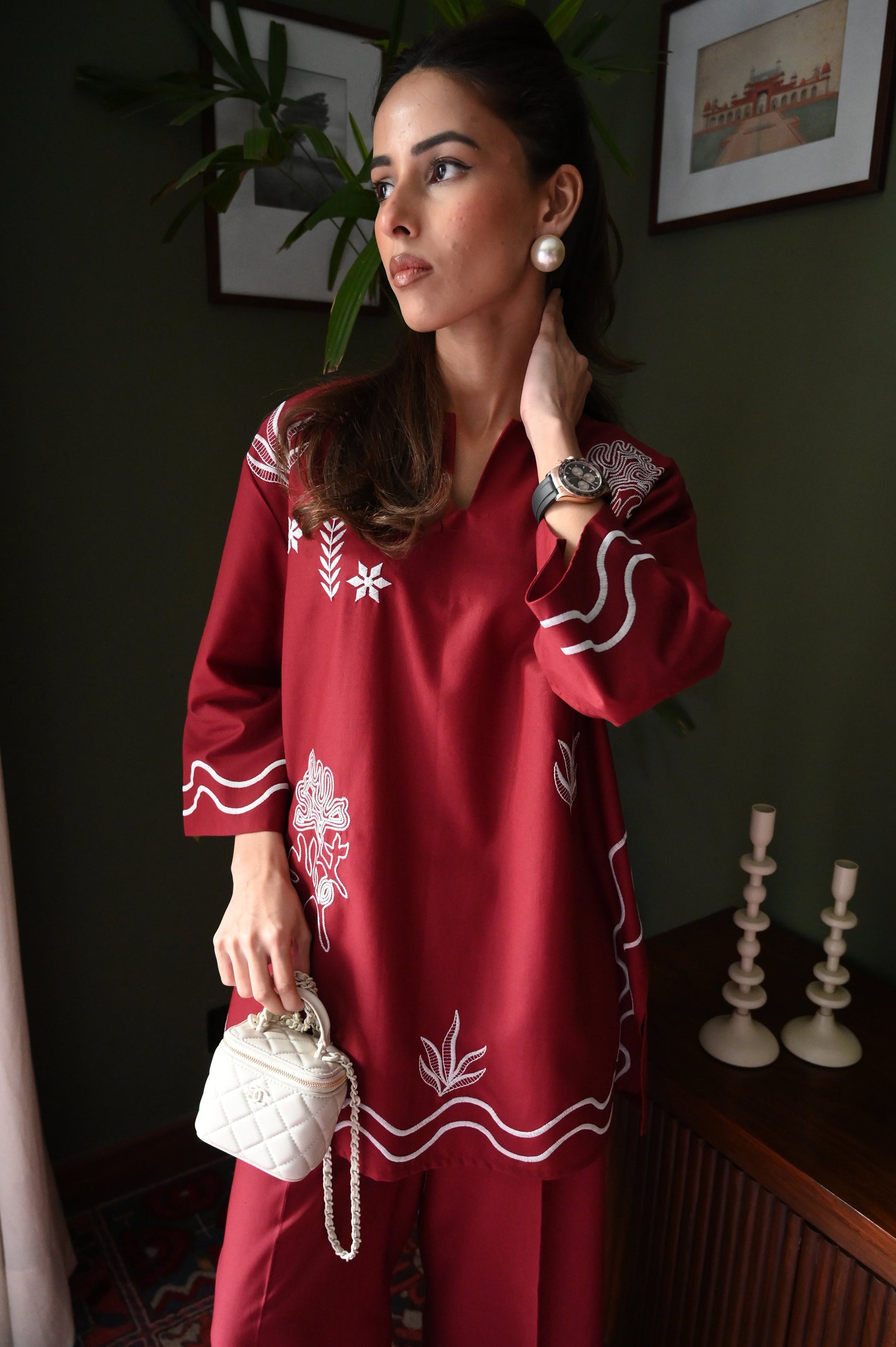 A deep maroon two-piece set featuring a straight kurta with white contrast embroidery in abstract and floral motifs on the front, sleeves, and hem. The kurta is paired with wide-leg trousers, detailed with matching embroidered borders, creating a striking yet elegant look.