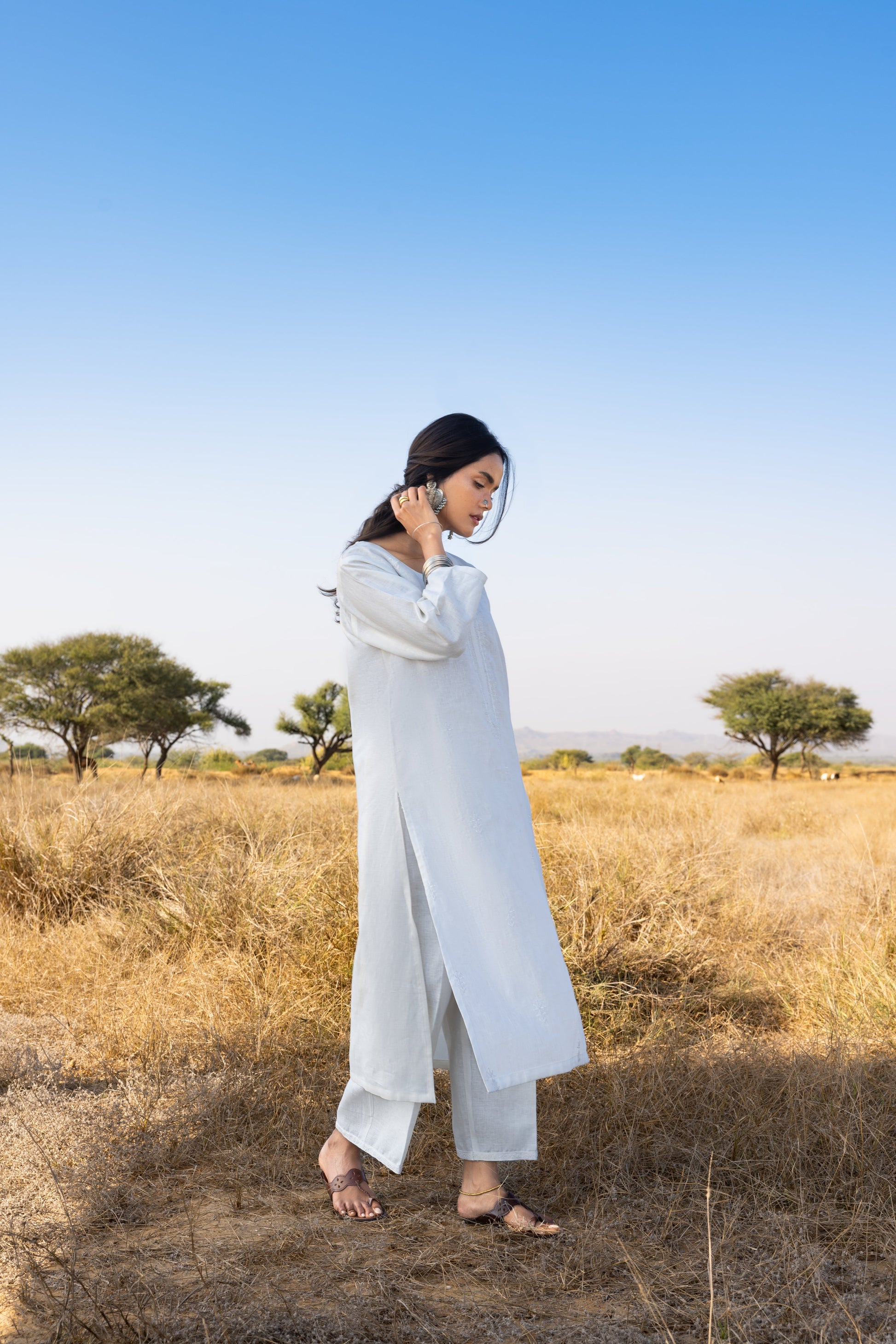 The kurta is decorated with delicate embroidery on the front and is complemented by the brand's signature tassel.