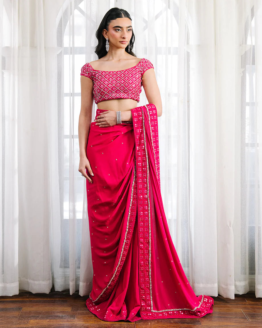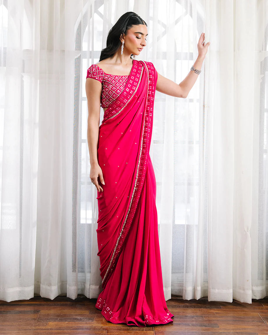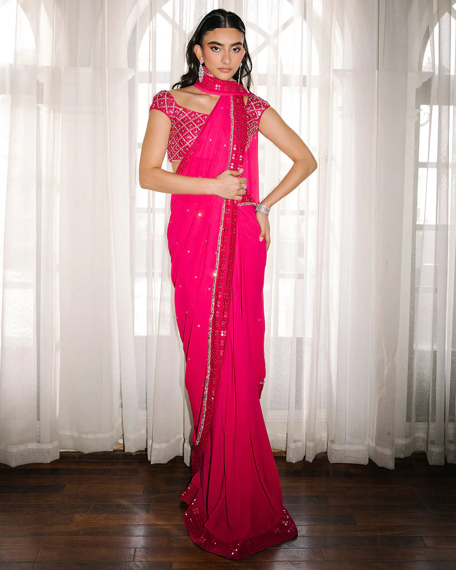 A hot pink set featuring a raw silk choli paired with a chiffon georgette saree and soft silk skirt. Accented with silver handwork throughout the choli and saree, designed for a tailored fit with layered flow, combining bold tones with graceful elegance.