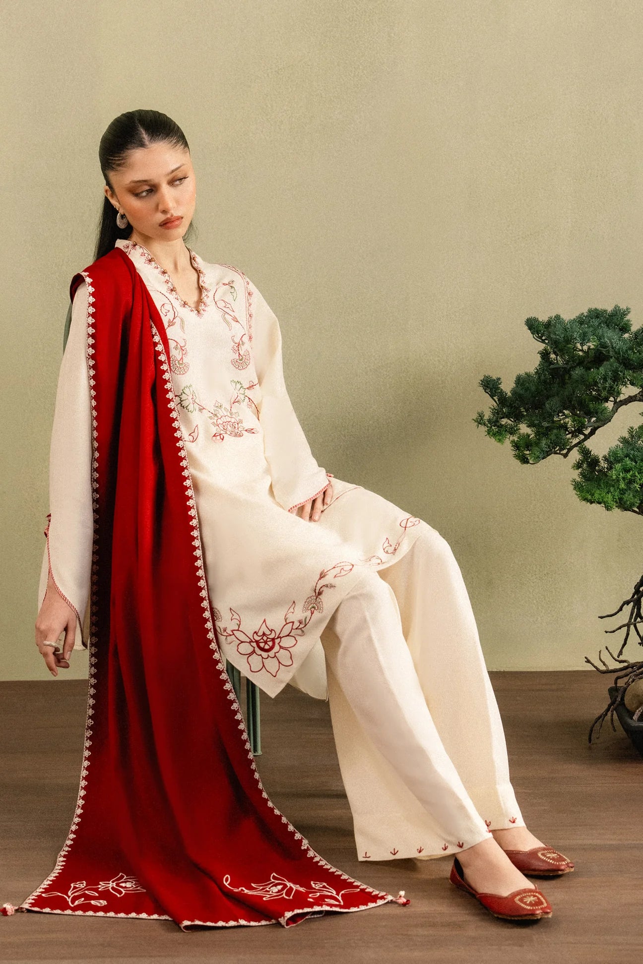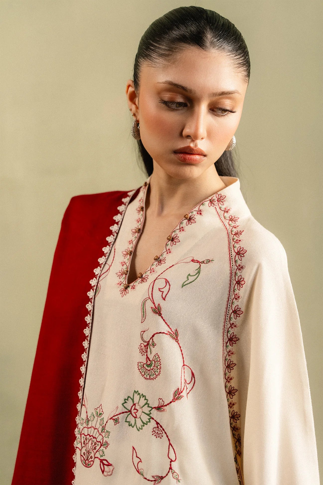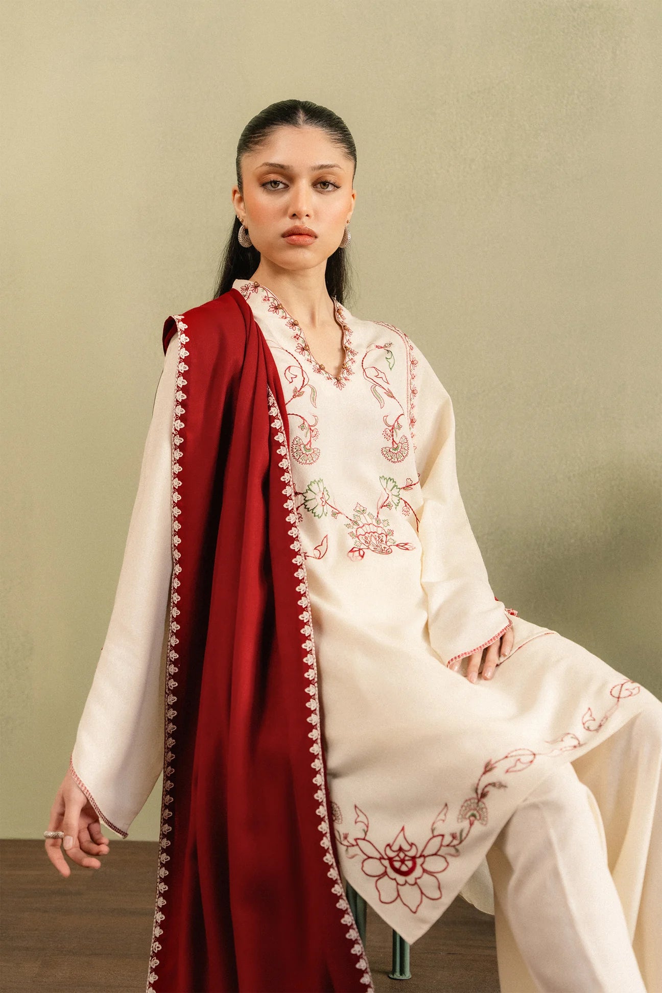 RÓSA — winter softened in porcelain khaddar, its neckline traced with delicate florals in deep maroon, whispered with accents of pink and green. Tulip-shaped sleeves flow like quiet shadows, detailed with subtle hand-stitching. A contrasting maroon dupatta with embroidered borders completes the layered, season-ready silhouette. Minimal, grounded, and quietly powerful.