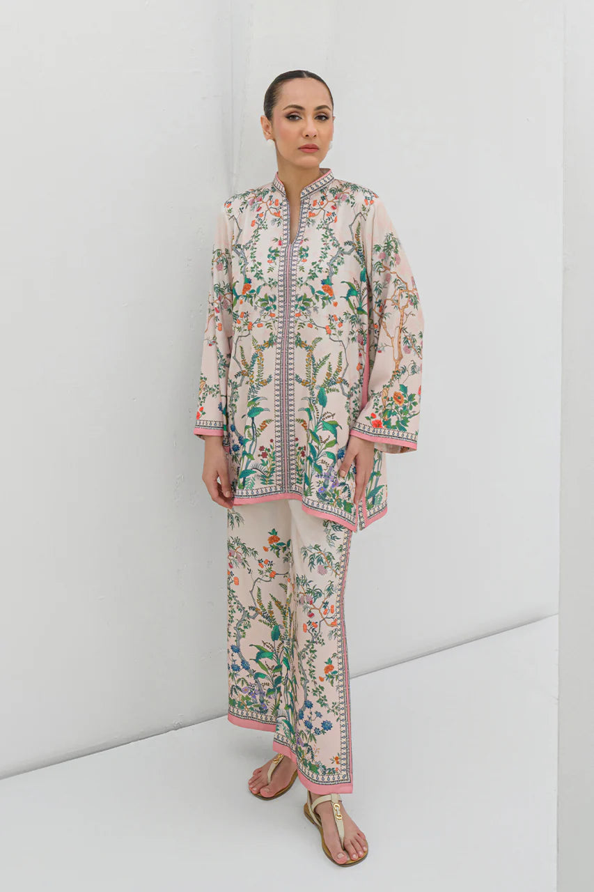 A vibrant digital print brings luxurious silk to life in this coordinated set. Featuring dainty flora and fauna imagery, the ensemble is perfect for casual wear and blends effortless style with the timeless beauty of silk.