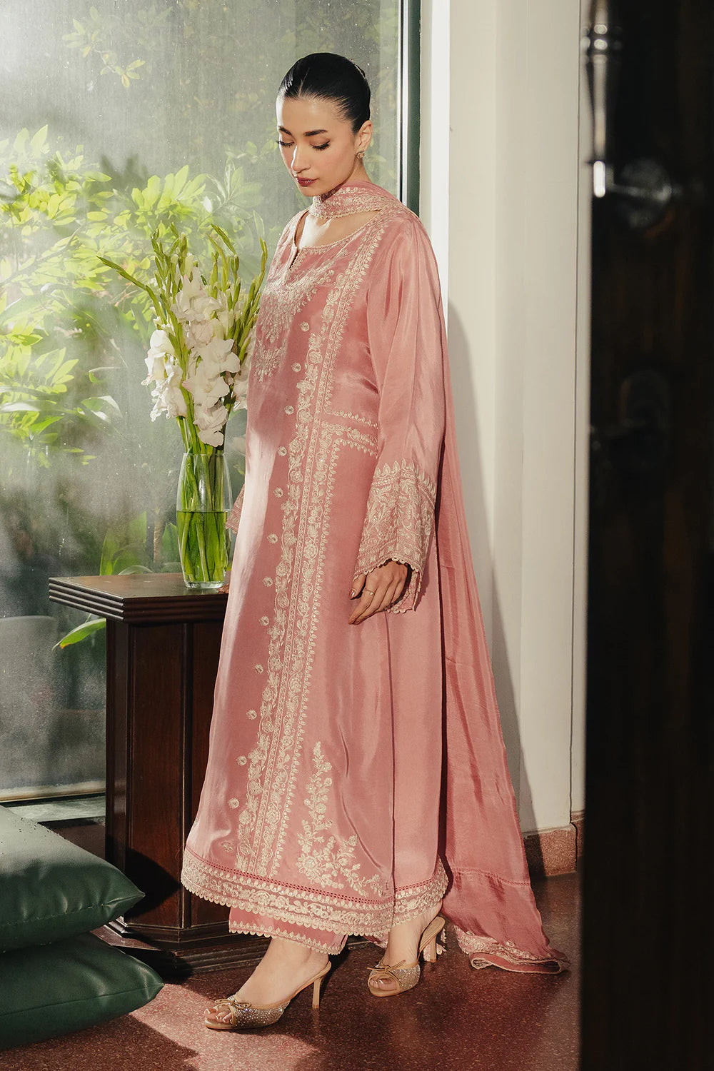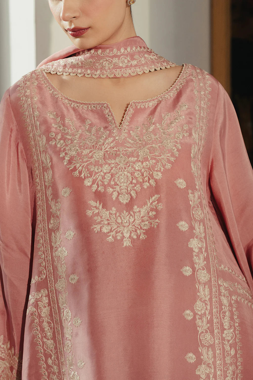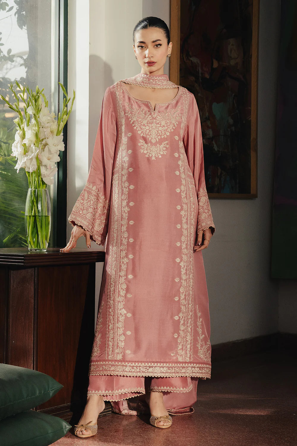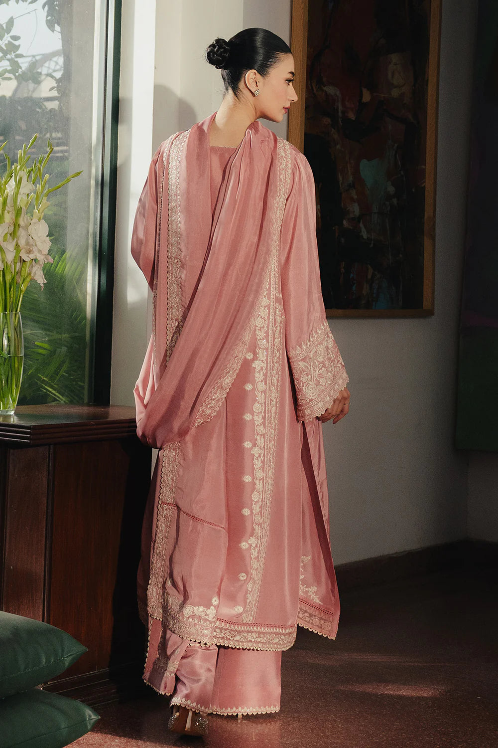 Contrasting embroidery adds depth to this chai pink ensemble, styled with loose-fit pants and an embroidered silk dupatta.