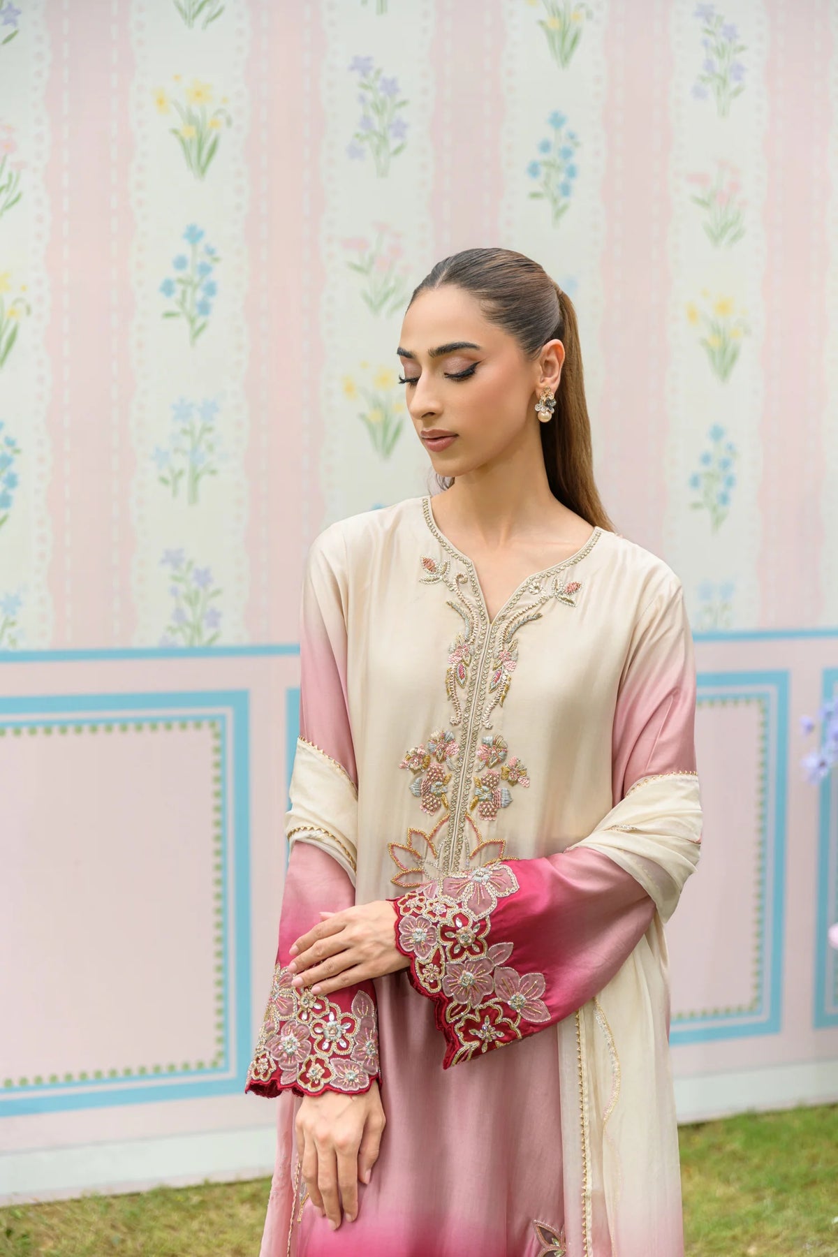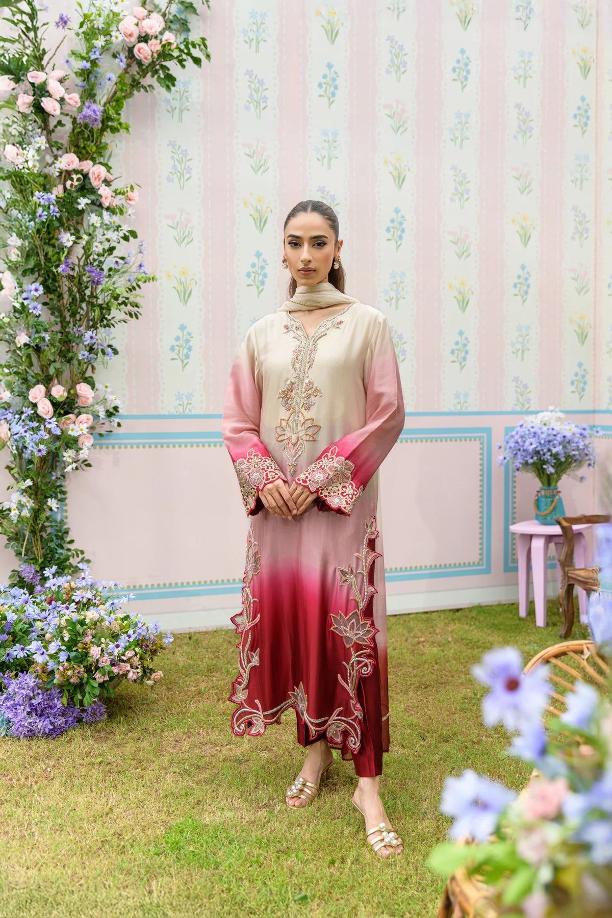 From our Zarayna Festive Collection, Roselle features a long, ombré-toned shirt paired with straight pants — both crafted from luxurious pure sheesha silk. The gradient hues of crème, rose pink, and deep cherry create a rich, romantic palette.