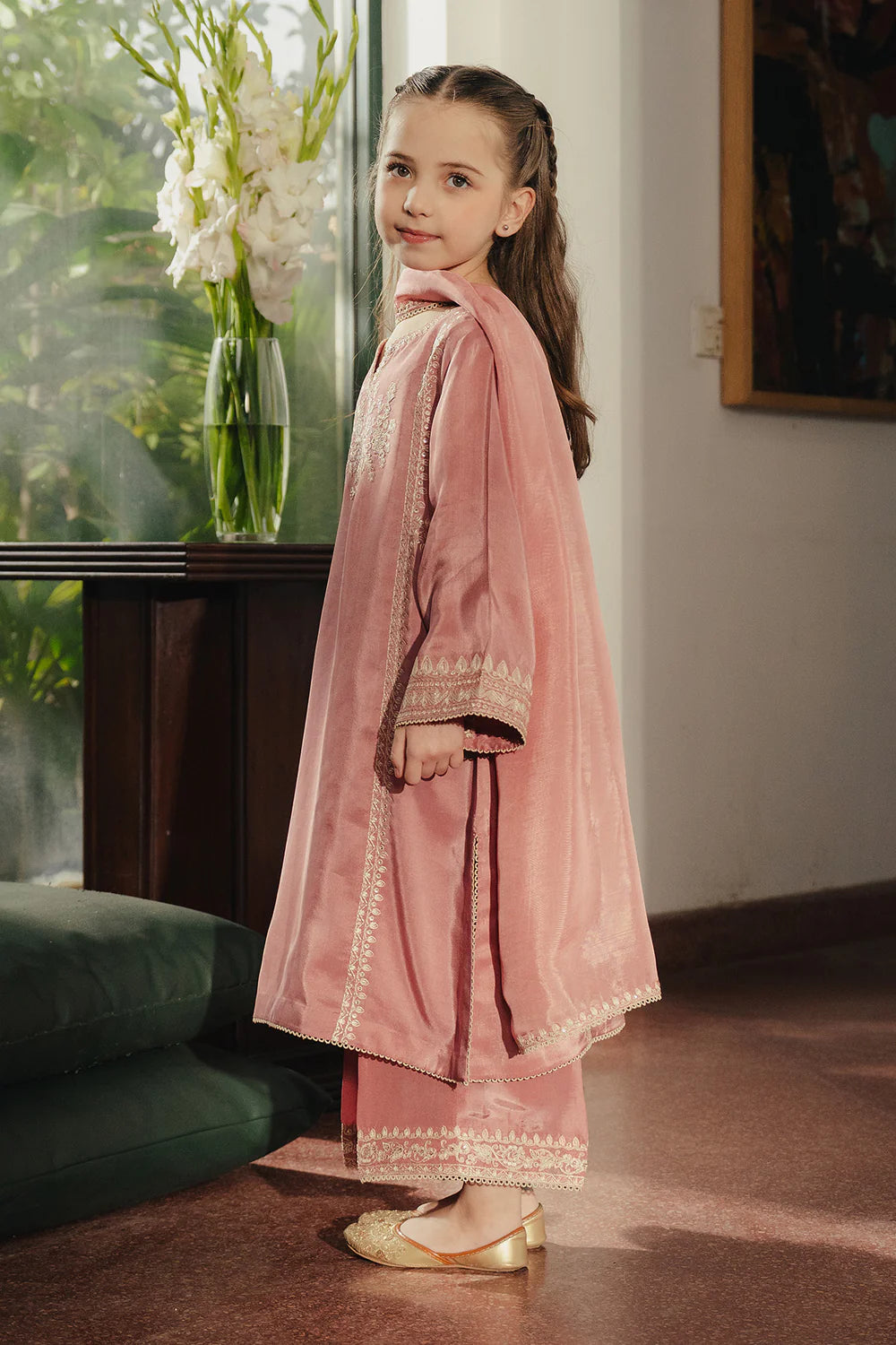 Contrasting embroidery adds depth to this chai pink ensemble, styled with loose-fit pants and an embroidered silk dupatta.