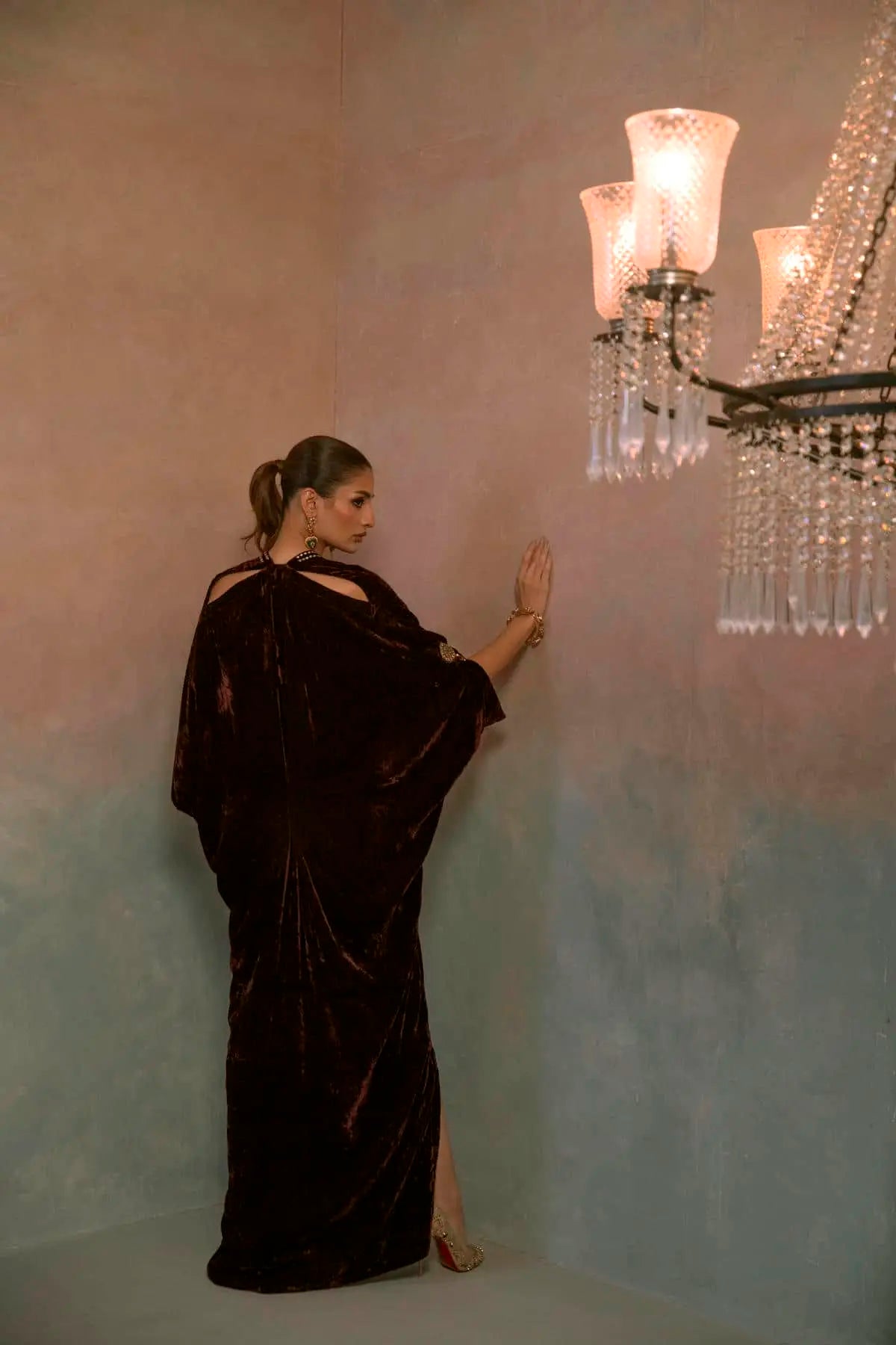 A luxurious velvet kaftan beautifully embellished with Swarovski crystals and delicate polki work. The soft drape of velvet meets intricate craftsmanship, creating an ensemble that exudes timeless elegance and effortless glamour — perfect for festive nights and refined soirées.