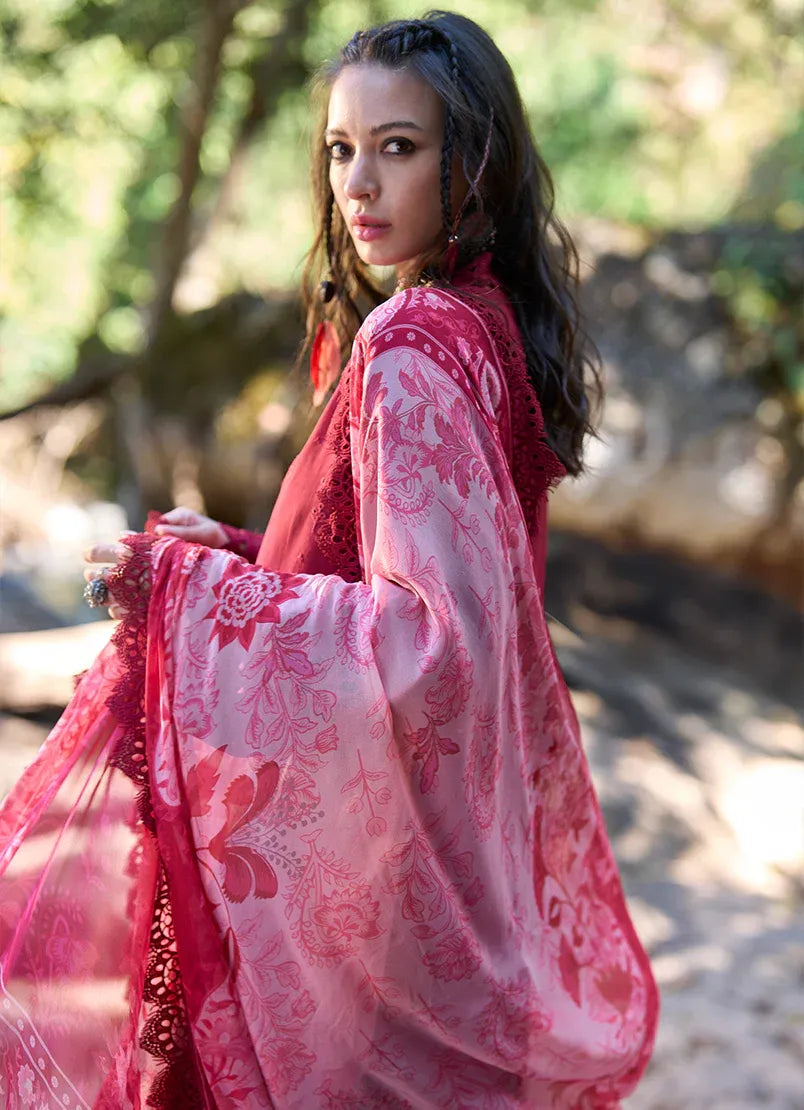 This unstitched pure cotton lawn shirt is presented in a rich red tone, detailed with intricately composed floral and geometric fabric motifs that create a striking all-over pattern. The surface design is enhanced with decorative borders that add depth and structure to the fabric while maintaining visual balance. Paired with a pure cotton cambric trouser and a printed chiffon dupatta, the ensemble offers a breathable feel with bold, statement-making fabric detail suited for summer wear.