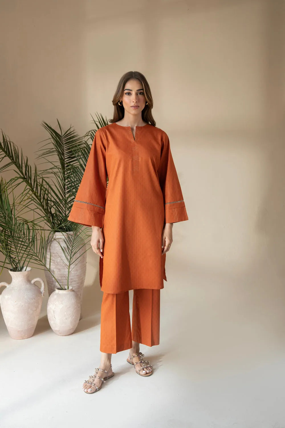Confident and composed ensemble is made for women who do it all. Featuring a round neckline with a subtle front slit, accented with parallel stitch detailing, this shirt speaks quiet strength. The bell sleeves mirror the same design with joined lace, adding soft structure. Paired with culottes, this look moves with purpose and poise.