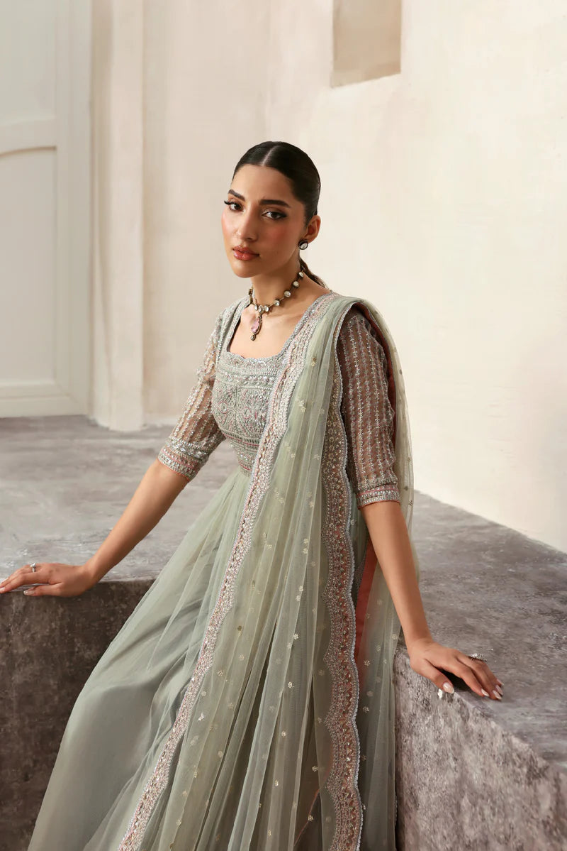Ash gray net pishwas with intricate sequin embroidery and double sequin borders, paired with raw silk foil-printed trousers and an embroidered scalloped dupatta for a graceful festive look.