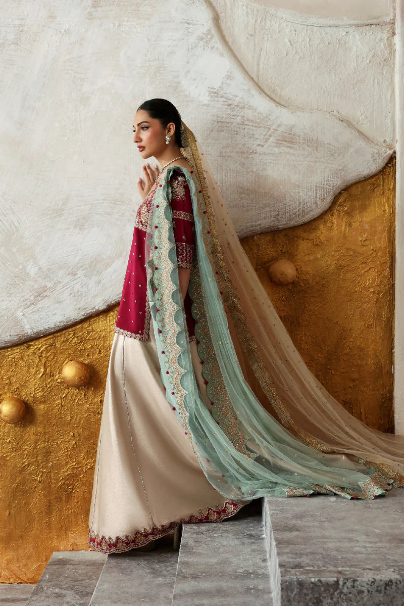 Magenta embroidered short shirt adorned with tassels, paired with light gold tissue lehnga featuring matching tassel accents. Styled with a contrasting aqua net dupatta with scalloped embellished borders.