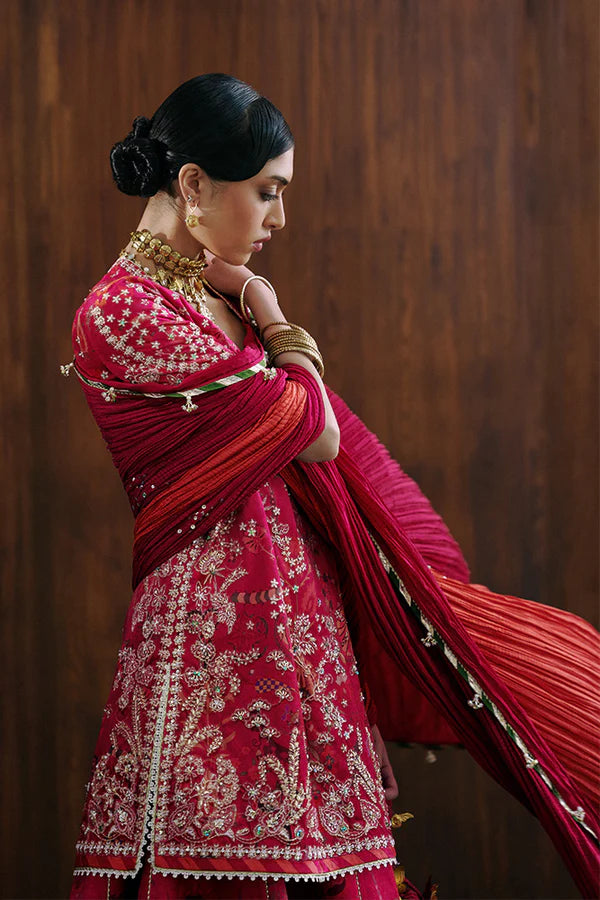 - Crush dupatta in medium silk (coral/pink), four-sided lace/tassels, chatta patti in gold/green, sequin spray.