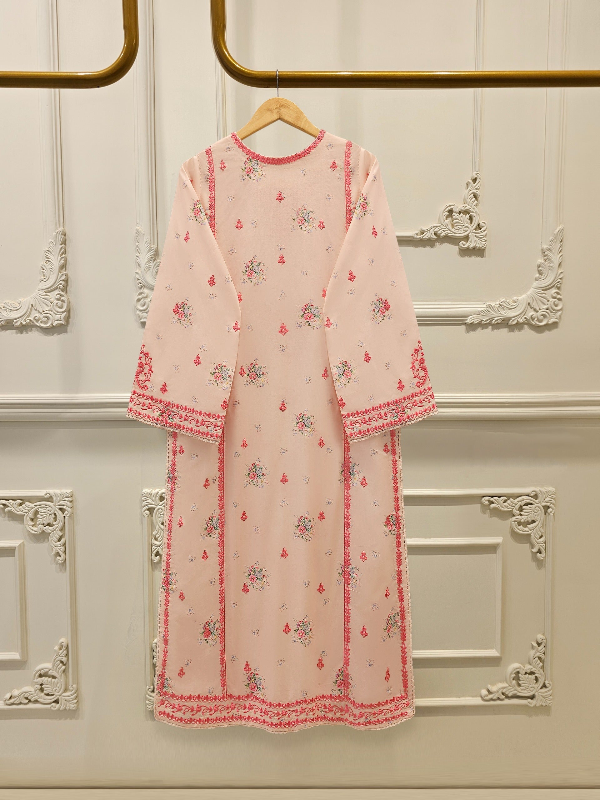 Elevate your summer wardrobe with this beautifully crafted peach printed cambric shirt, featuring intricate Chikan Kari work on the sleeves and daman. Designed for timeless elegance, this piece blends breathable lawn fabric with traditional craftsmanship, perfect for festive occasions or casual sophistication. Pair it with pants for a complete look.