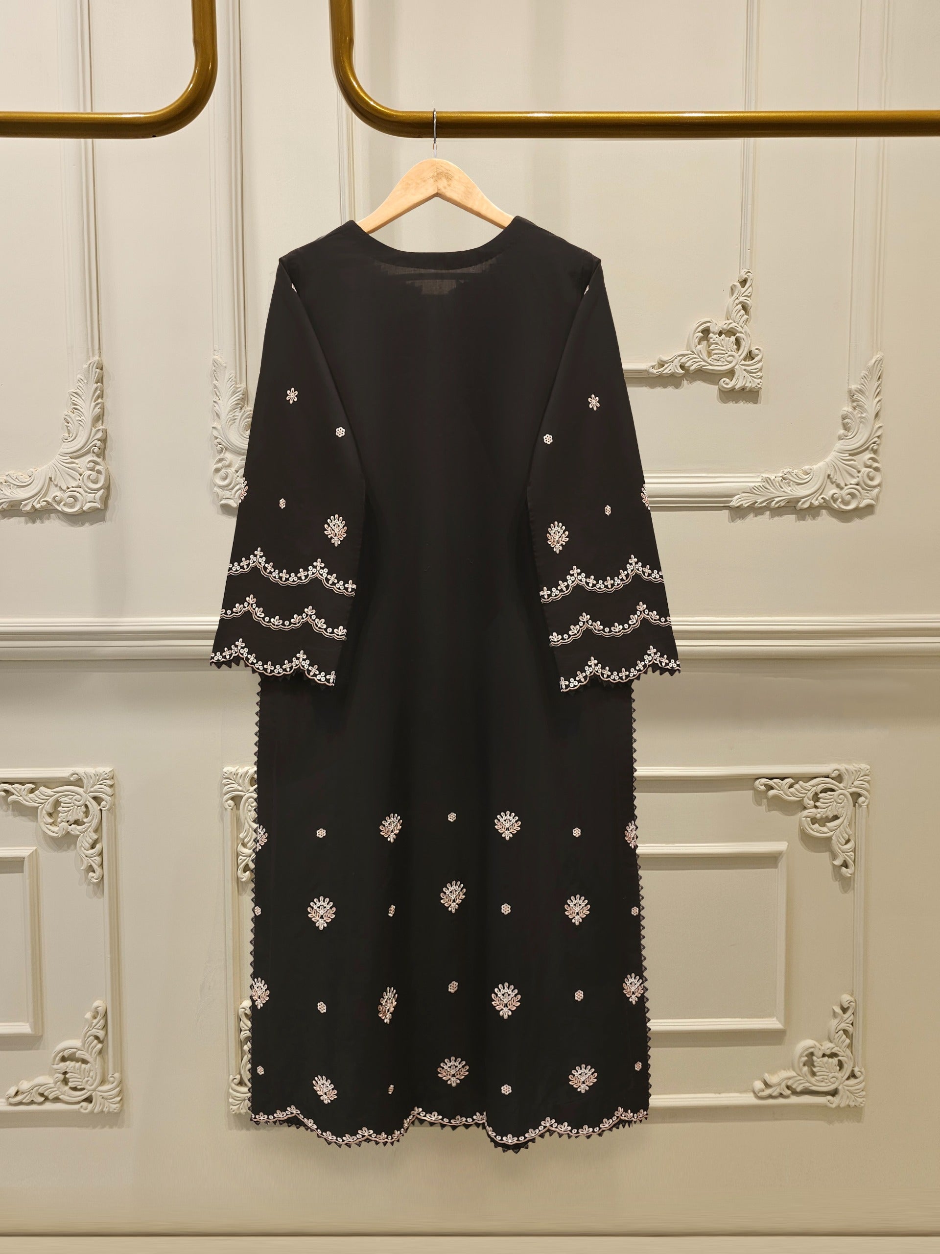 Elevate your summer wardrobe with this beautifully crafted black cambric shirt, featuring intricate Chikan Kari work on the sleeves and daman. Designed for timeless elegance, this piece blends breathable lawn fabric with traditional craftsmanship, perfect for festive occasions or casual sophistication. Pair it with pants for a complete look.
