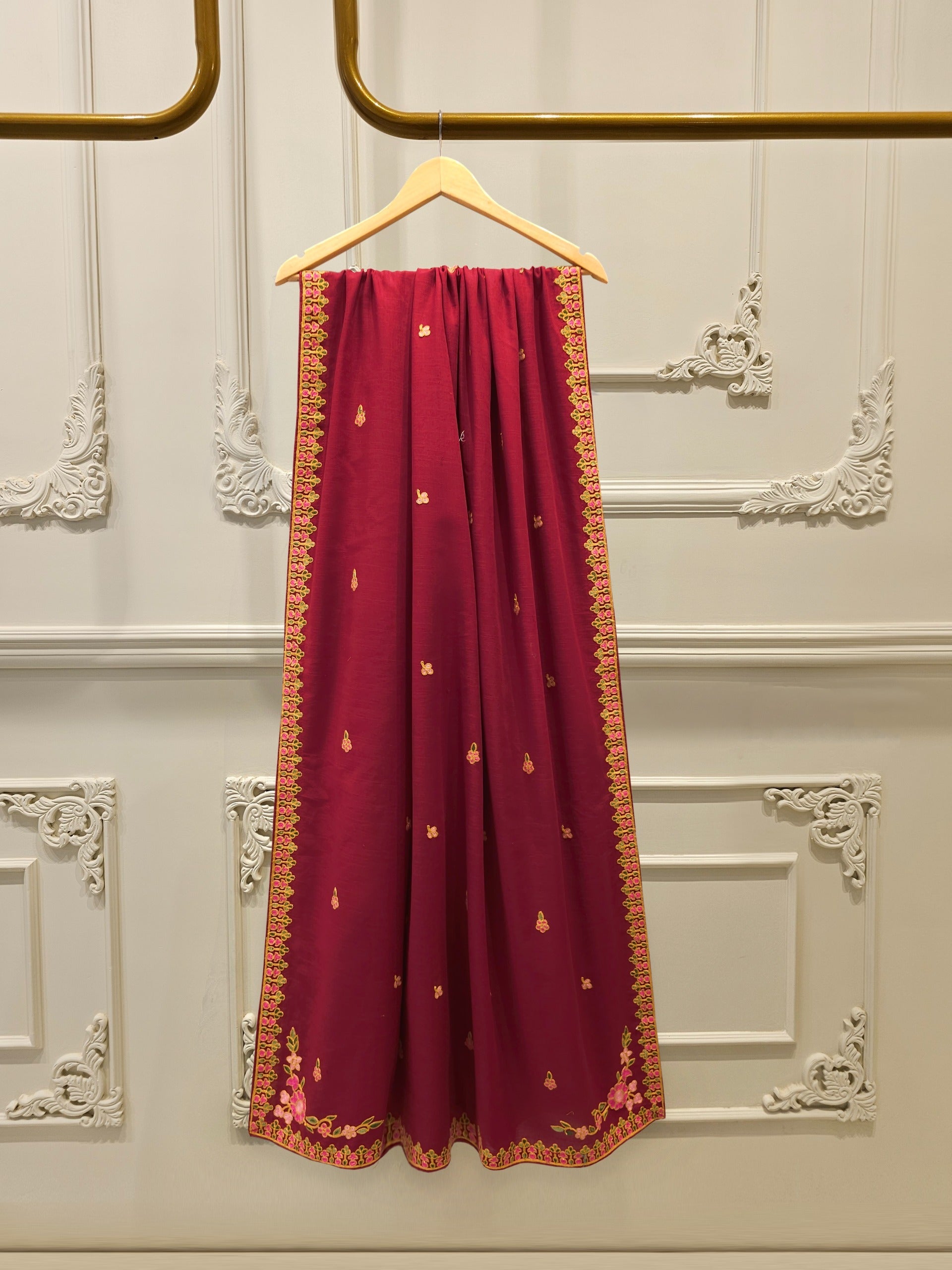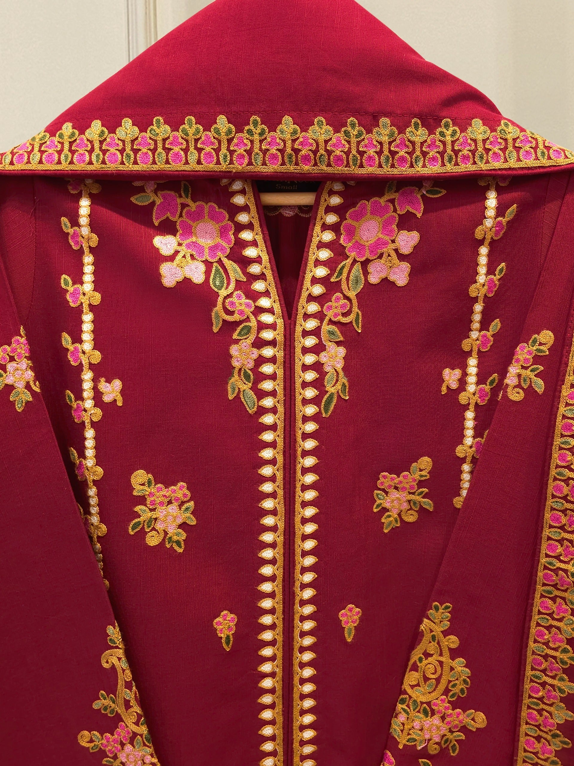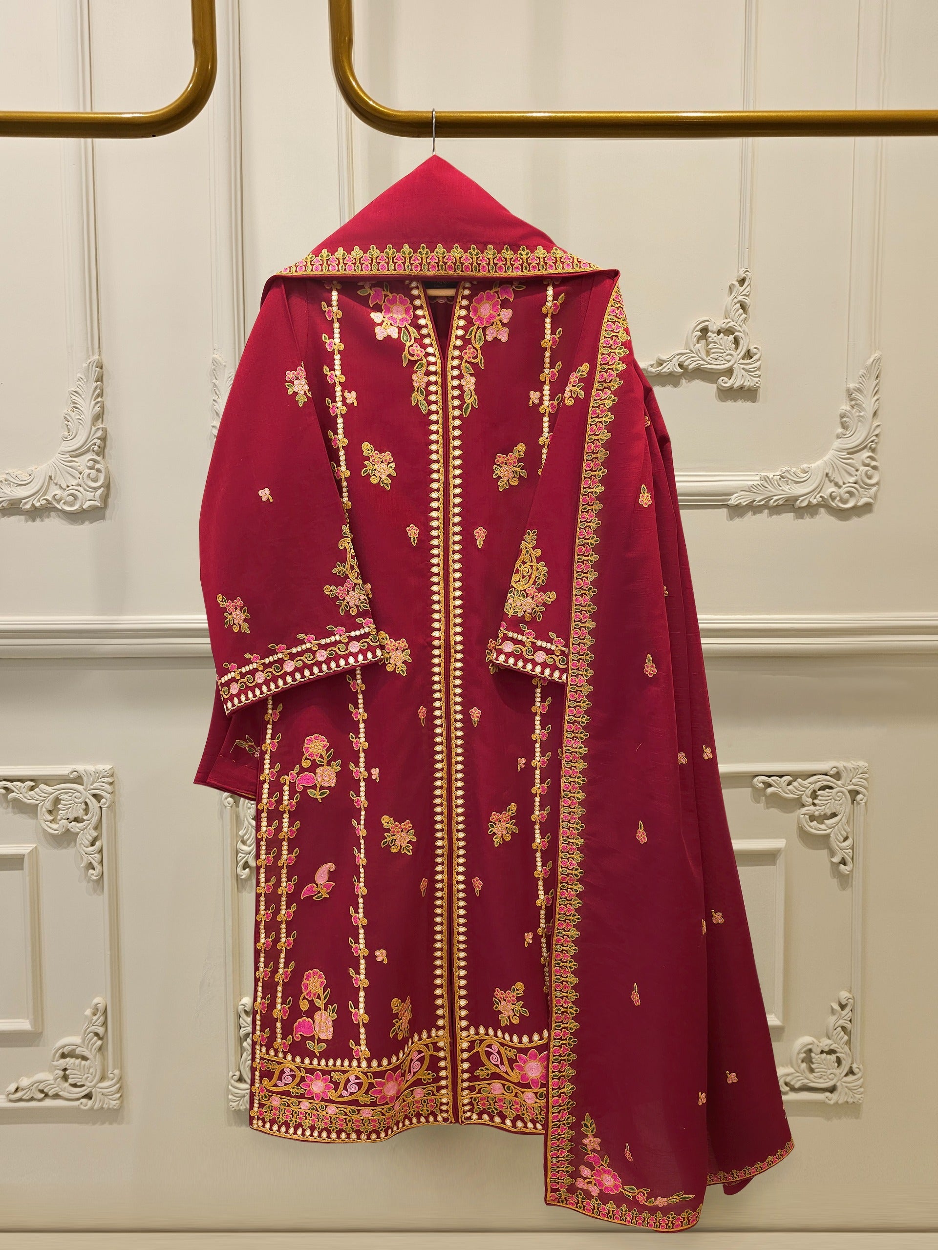 Maroon embroidered khaddar suit features a rich, traditional design on a warm, textured fabric ideal for cooler weather. The intricate embroidery add a touch of elegance, while the soft yet durable khaddar material ensures comfort and style for everyday wear or casual gatherings. Perfect for autumn and winter seasons.