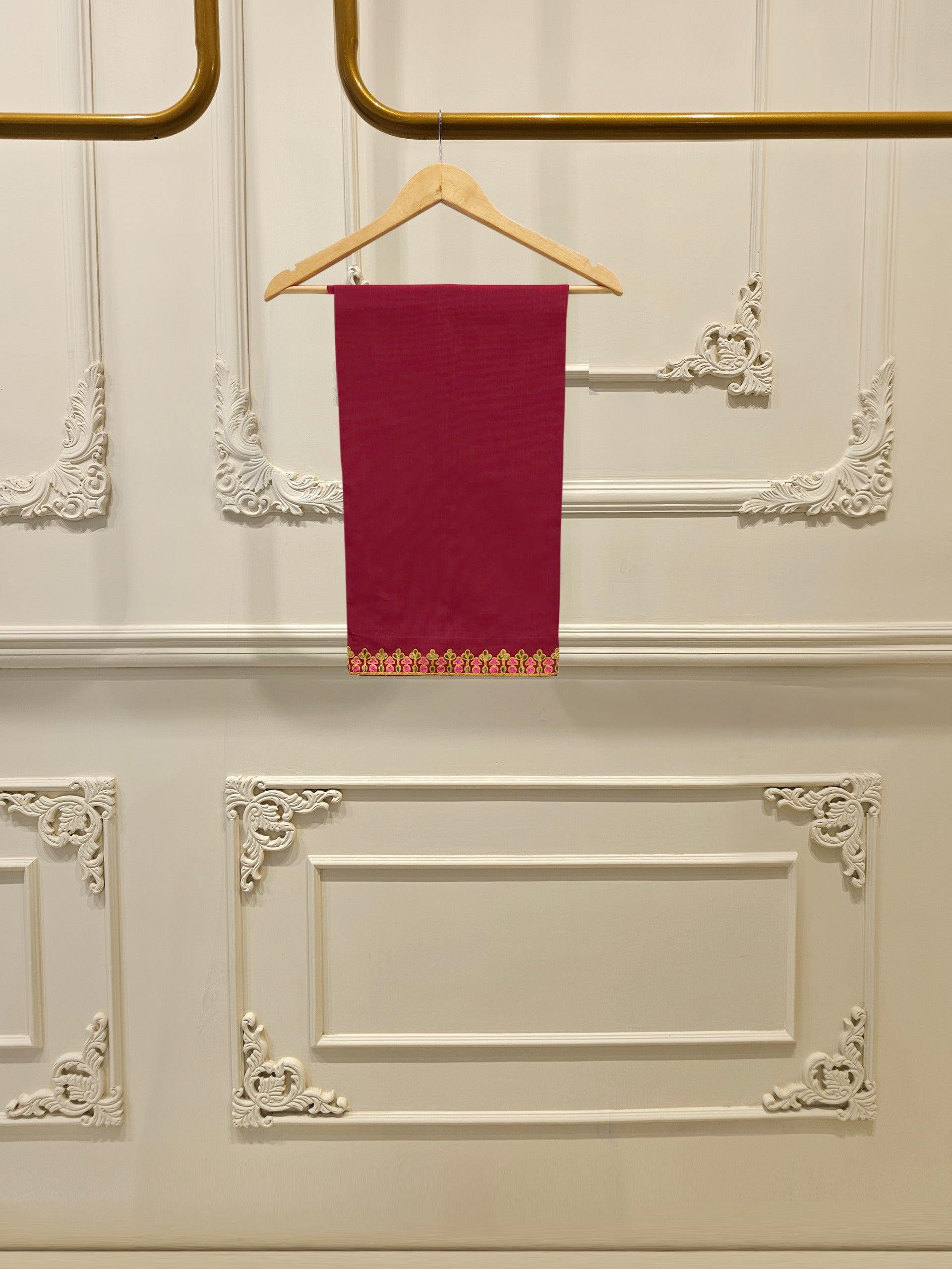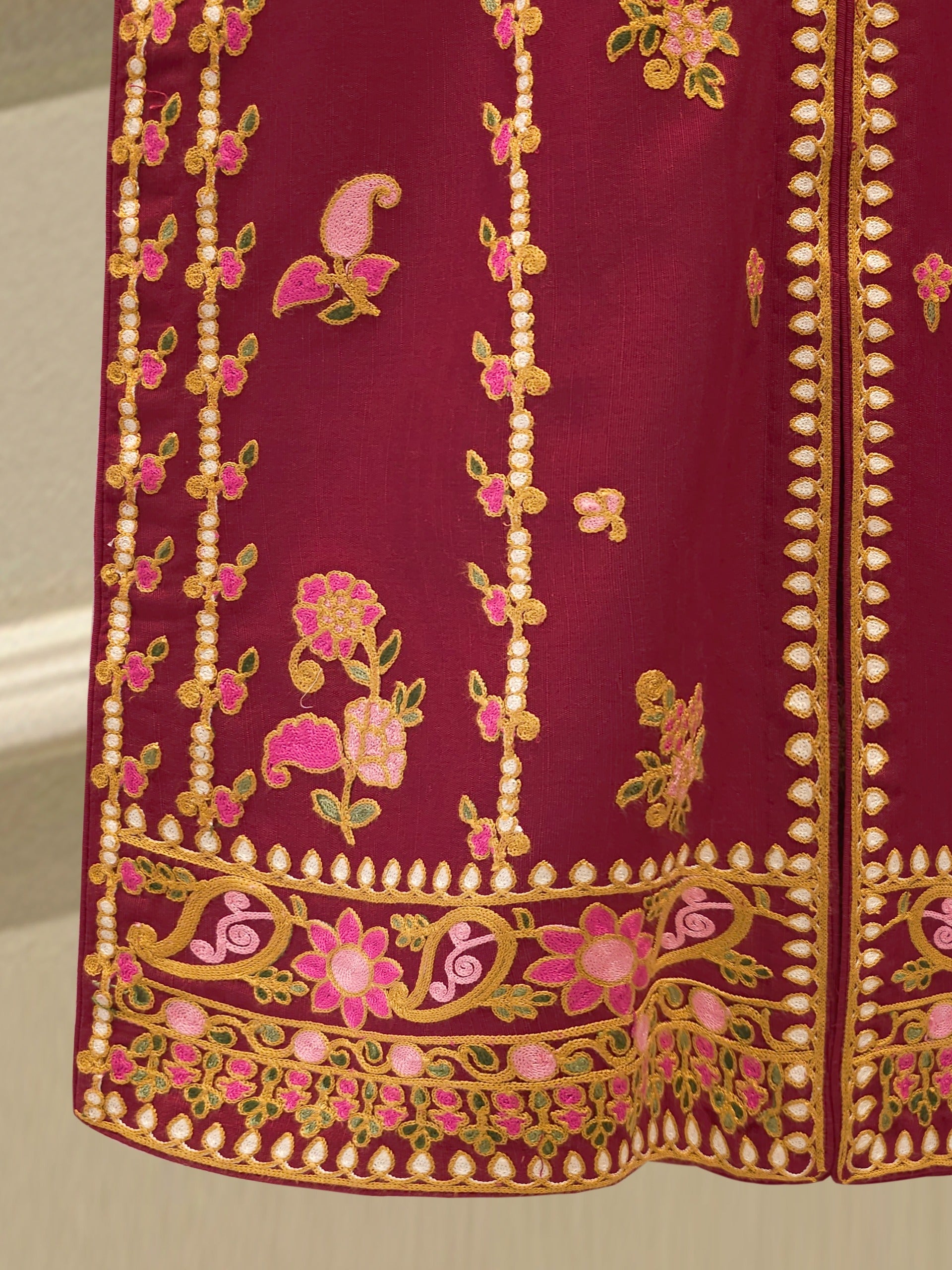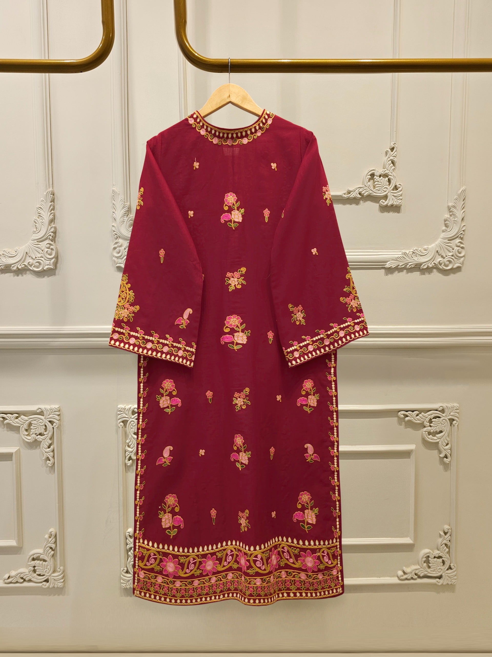 Maroon embroidered khaddar suit features a rich, traditional design on a warm, textured fabric ideal for cooler weather. The intricate embroidery add a touch of elegance, while the soft yet durable khaddar material ensures comfort and style for everyday wear or casual gatherings. Perfect for autumn and winter seasons.