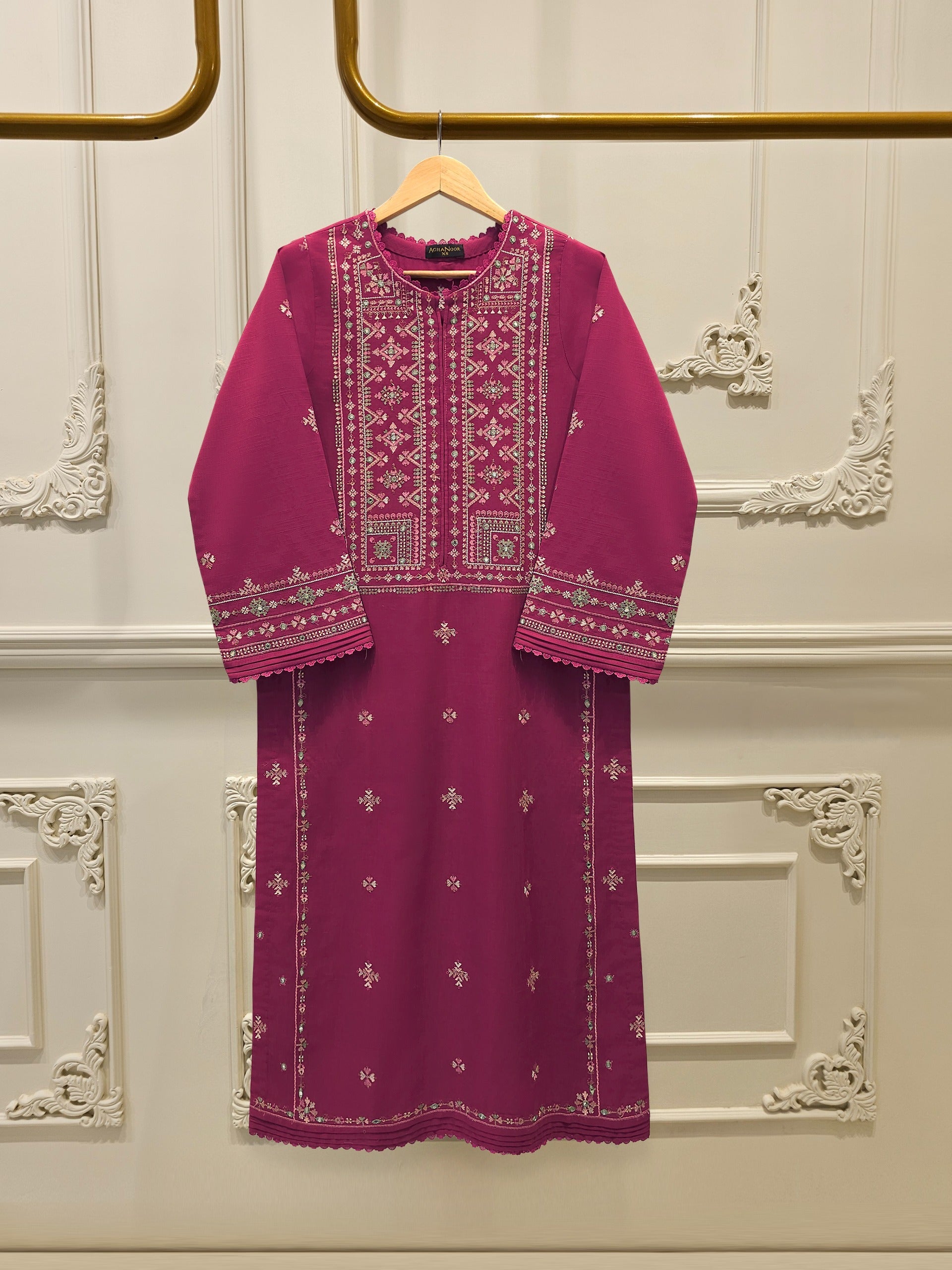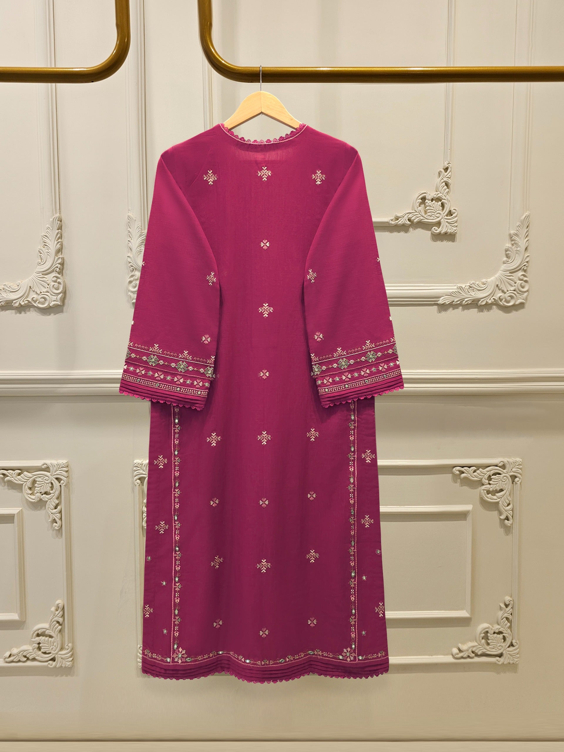 Maroon embroidered khaddar suit features a rich, traditional design on a warm, textured fabric ideal for cooler weather. The intricate embroidery add a touch of elegance, while the soft yet durable khaddar material ensures comfort and style for everyday wear or casual gatherings. Perfect for autumn and winter seasons.