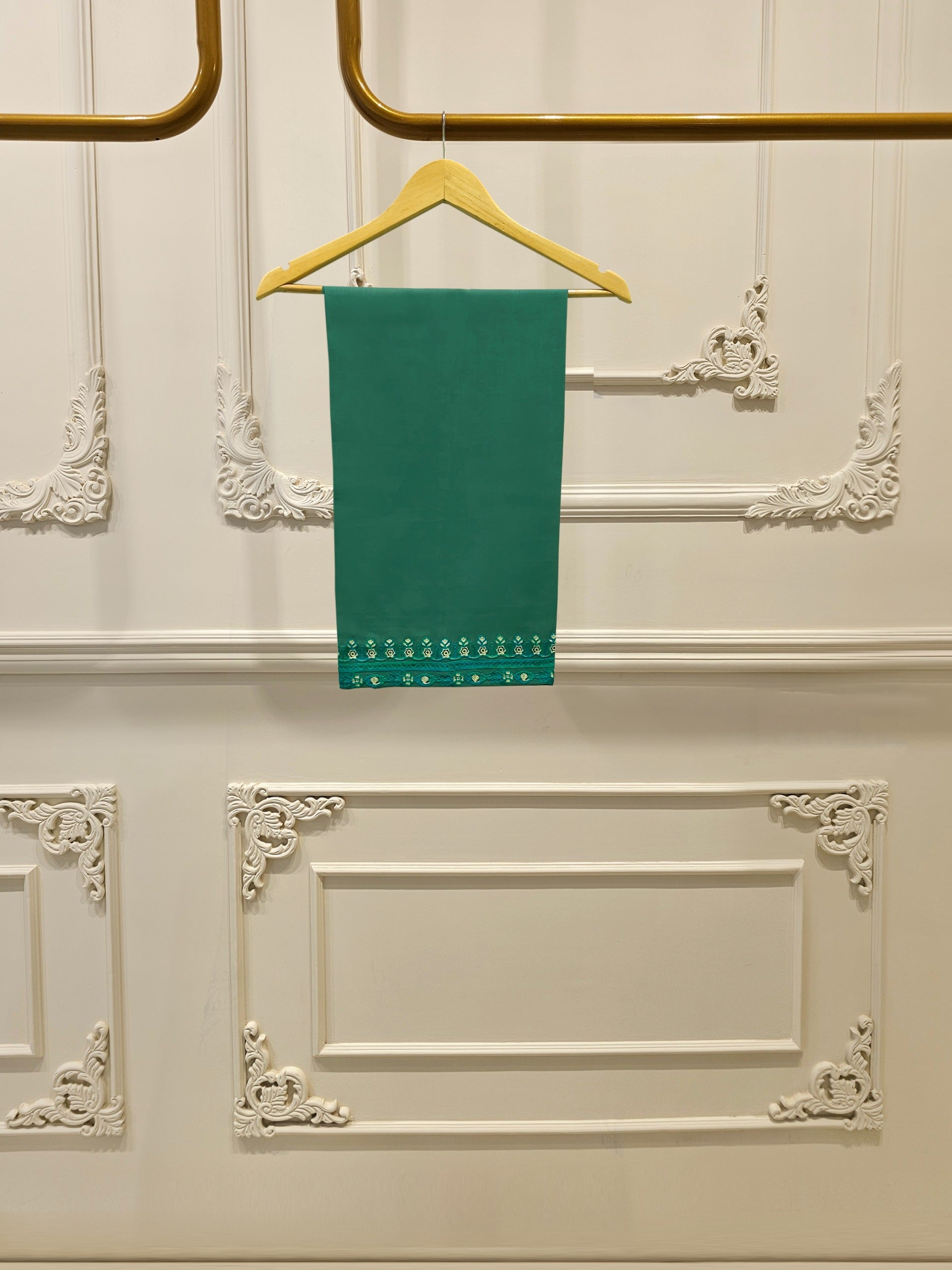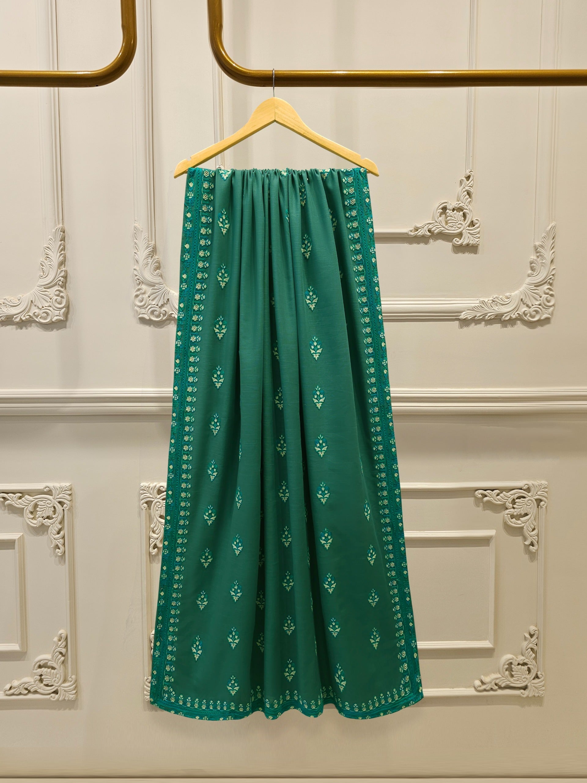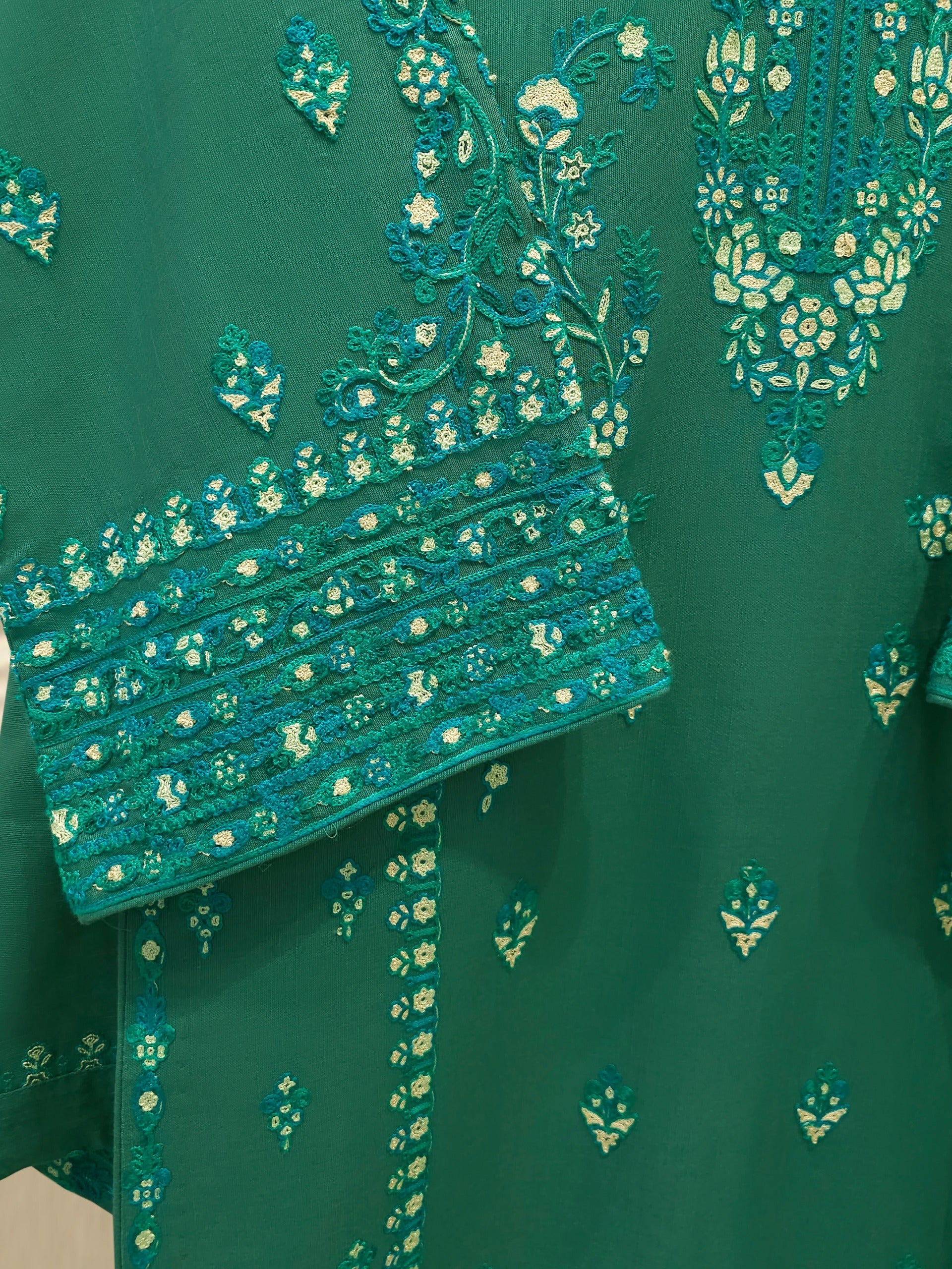 Green embroidered khaddar suit features a rich, traditional design on a warm, textured fabric ideal for cooler weather. The intricate embroidery add a touch of elegance, while the soft yet durable khaddar material ensures comfort and style for everyday wear or casual gatherings. Perfect for autumn and winter seasons.