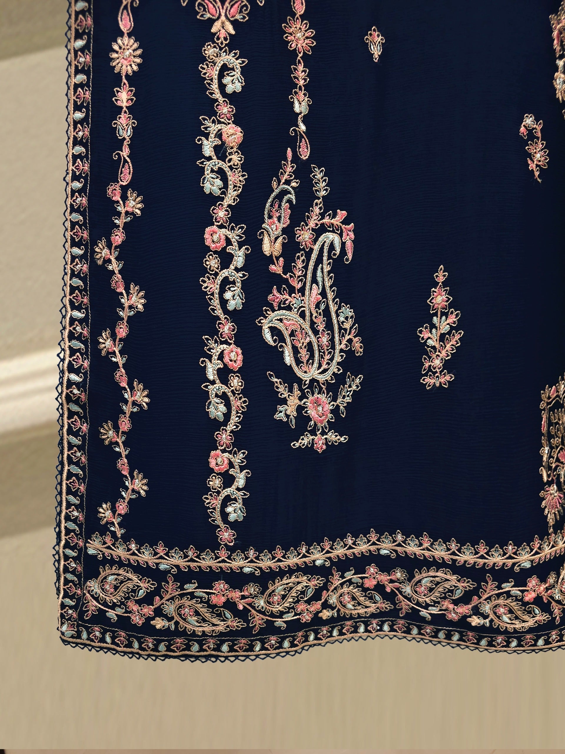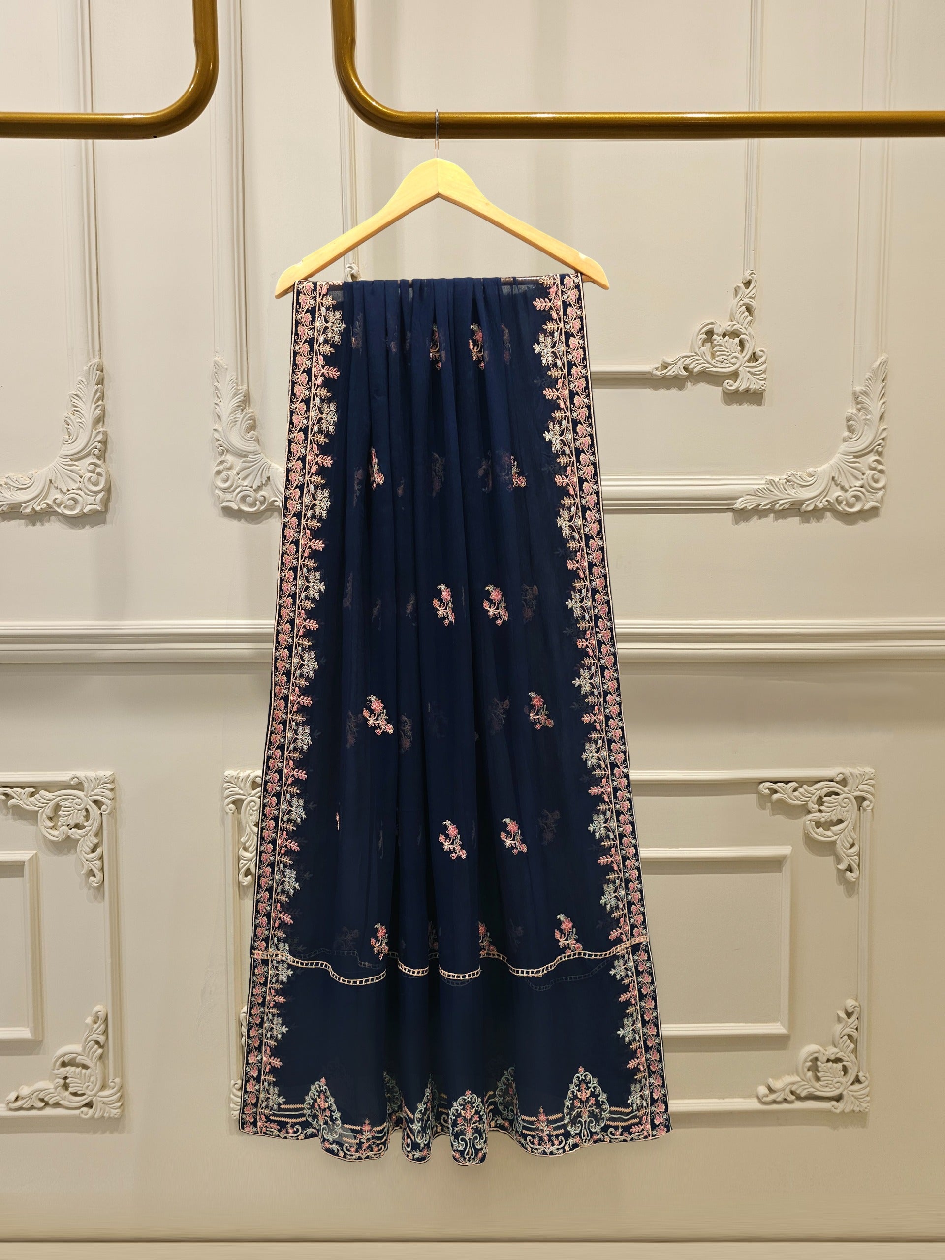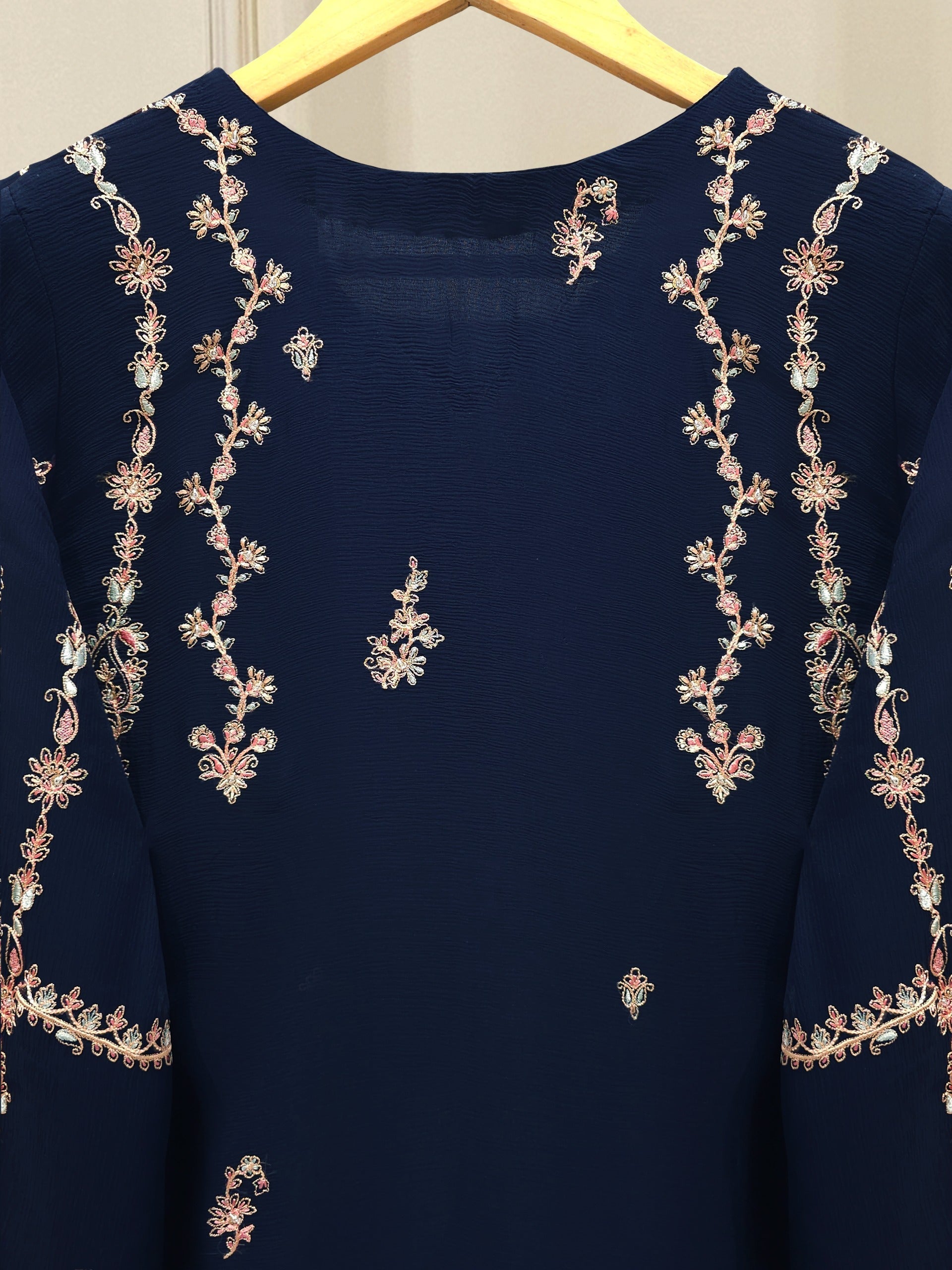Elevate your style with our navy blue embroidered chiffon straight shirt crafted with utmost care and attention to detail. The shirt features intricate embroidery on the front and sleeves, adding a touch of timeless charm.