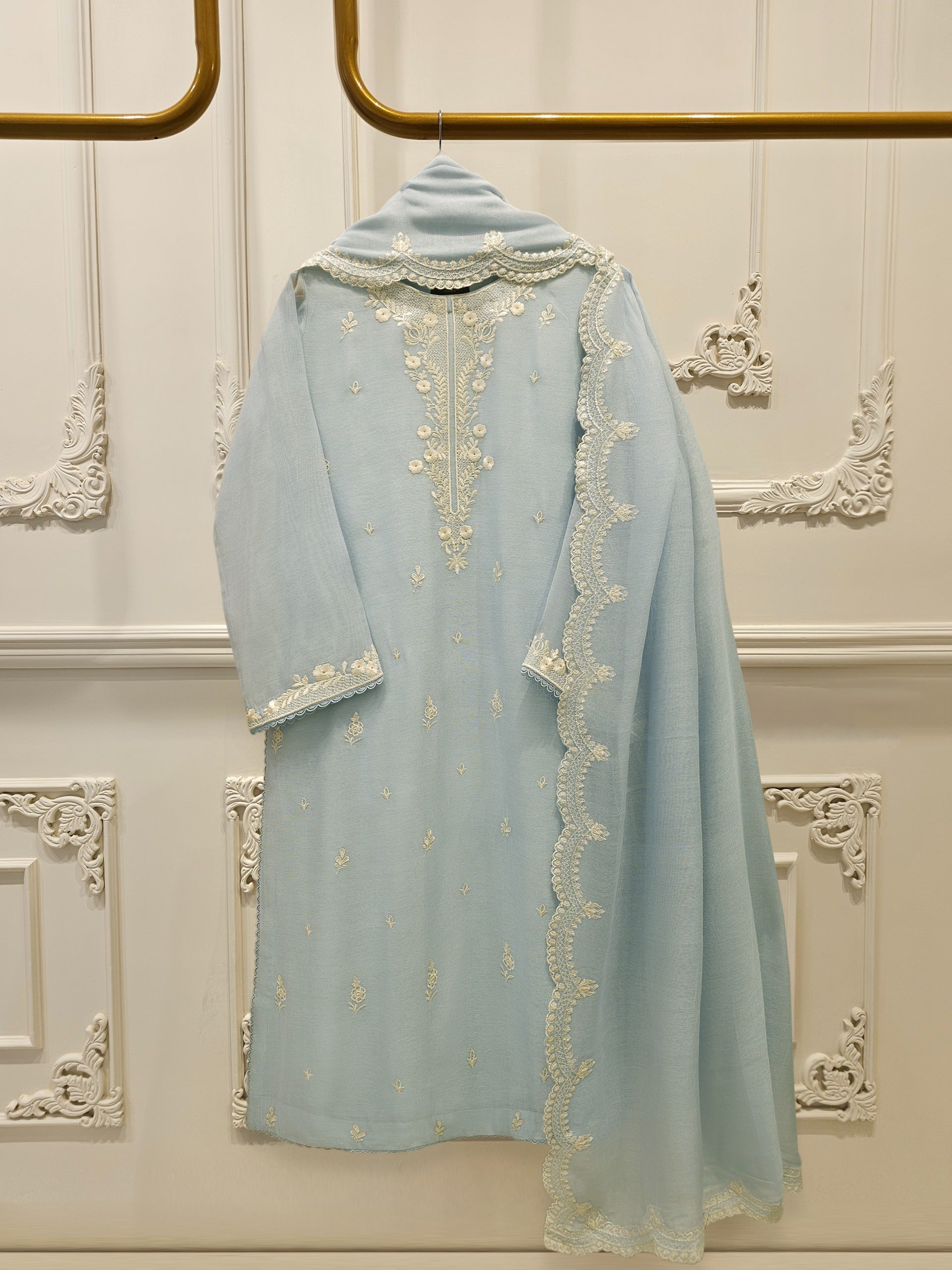Introducing our elegant embroidered cotton net shirt with pants a perfect choice for those who appreciate intricate detailing and graceful style. Crafted from high-quality cotton net fabric, this shirt offers a lightweight and luxurious feel, allowing you to feel comfortable and chic throughout the day. The set comes with a matching pant which enhances the overall look and adds a touch of finesse to your outfit.