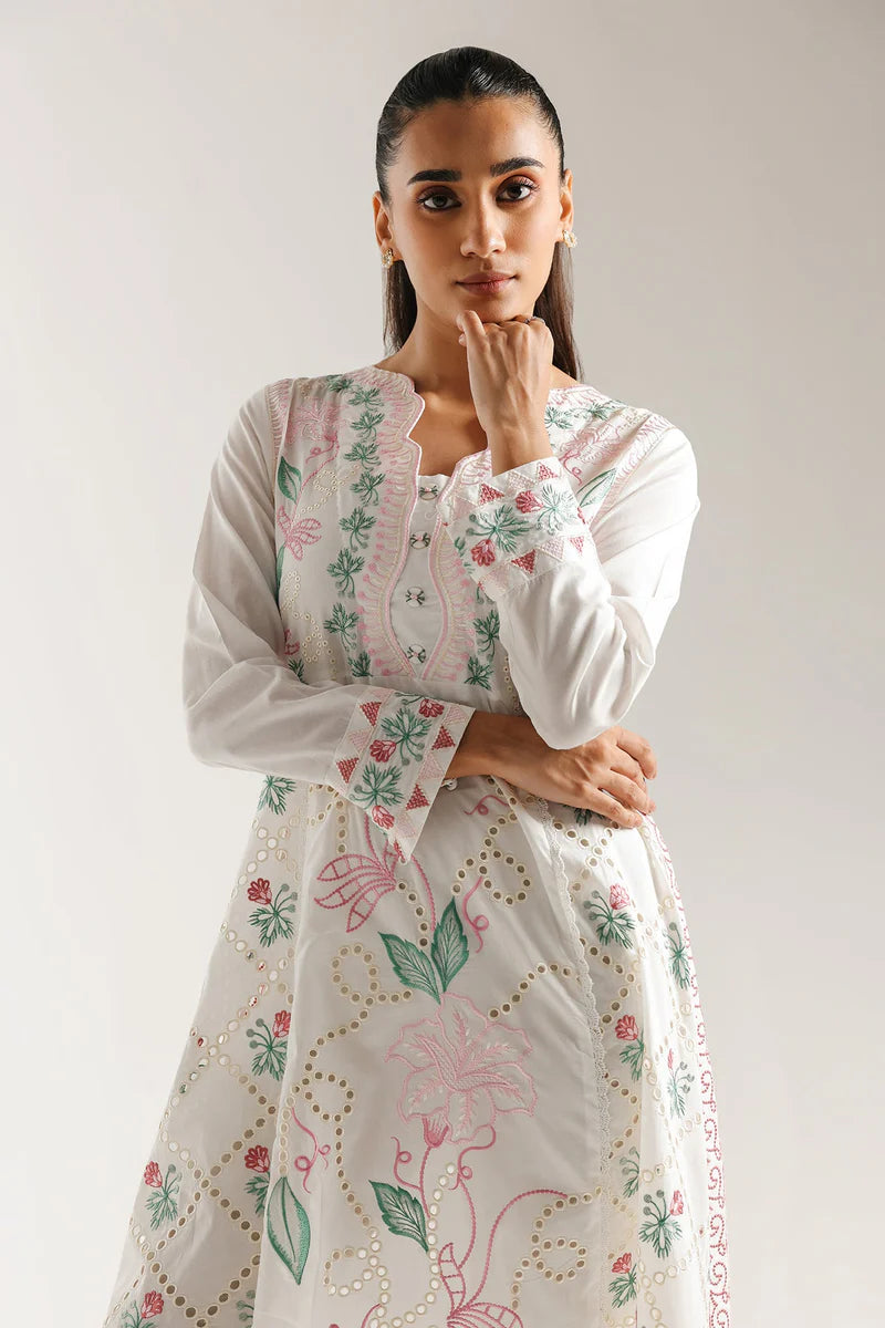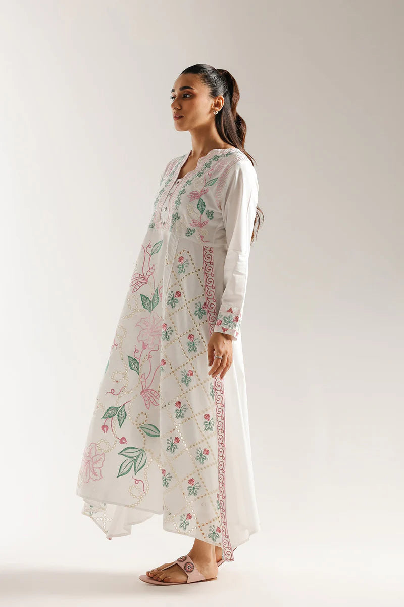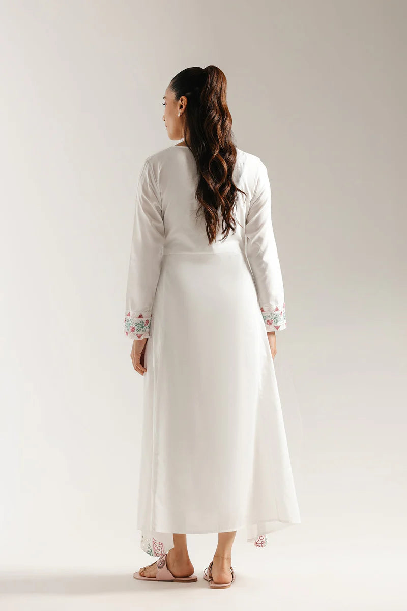 Discover an enchanting style in this embroidered dress. This elegant white maxi dress is adorned with delicate floral embroidery in soft pink and green hues, creating a beautiful and whimsical pattern. With its graceful, flowing silhouette and classic neckline, this dress is a perfect choice for a fresh and sophisticated look.