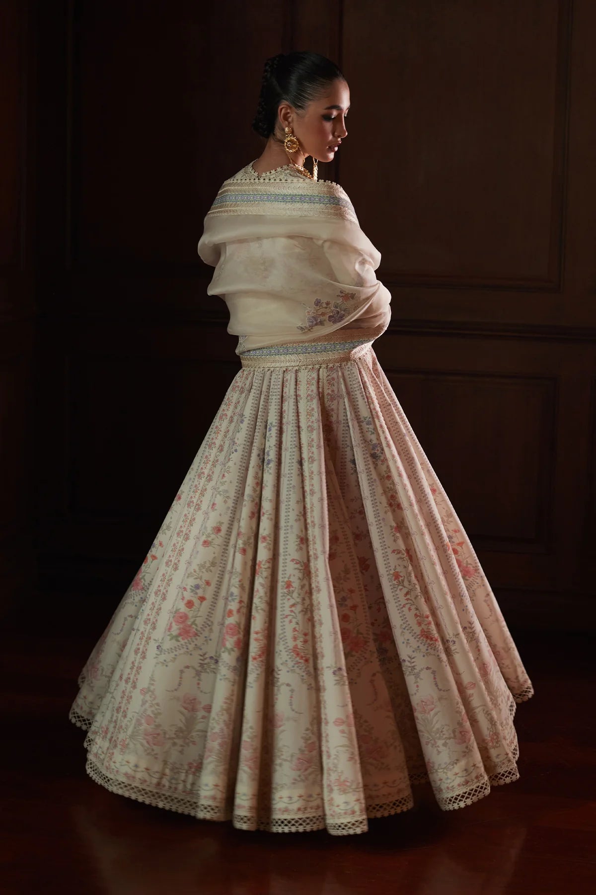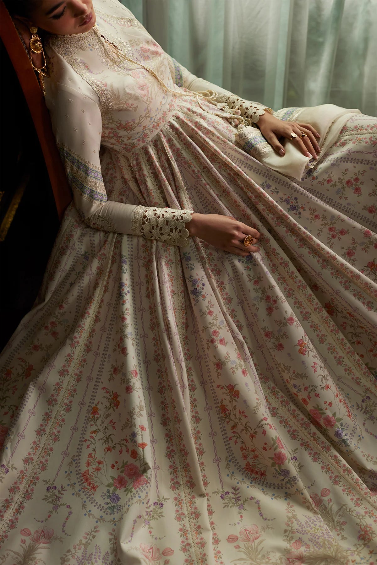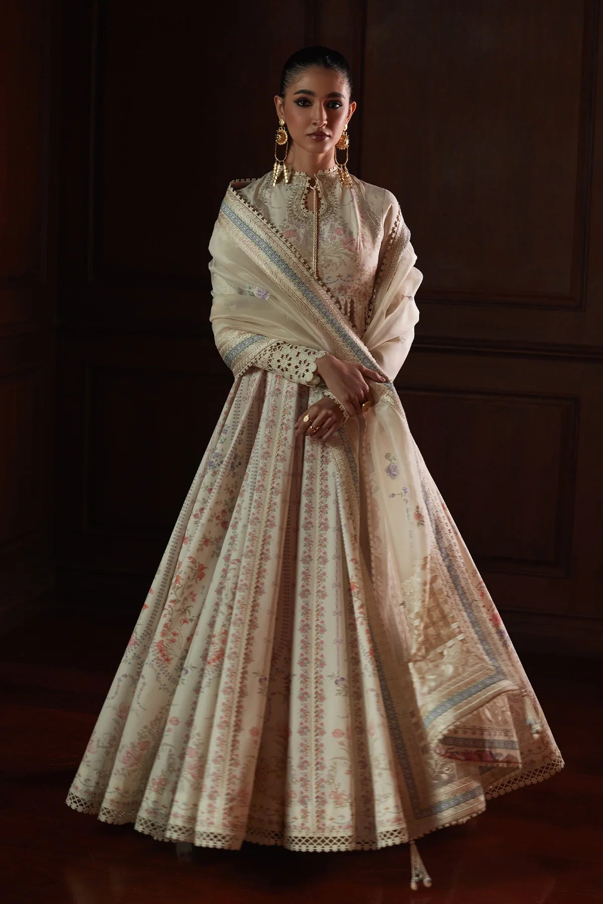 Introducing a stunning printed pishwas, perfect for Eid celebrations. This elegant frock features intricate floral prints and delicate embroidery, along with a generous 500-600 inches of flare for a beautiful silhouette. It comes with an embroidered organza dupatta and stylish azhar pants, making it an ideal choice for a graceful and festive look.