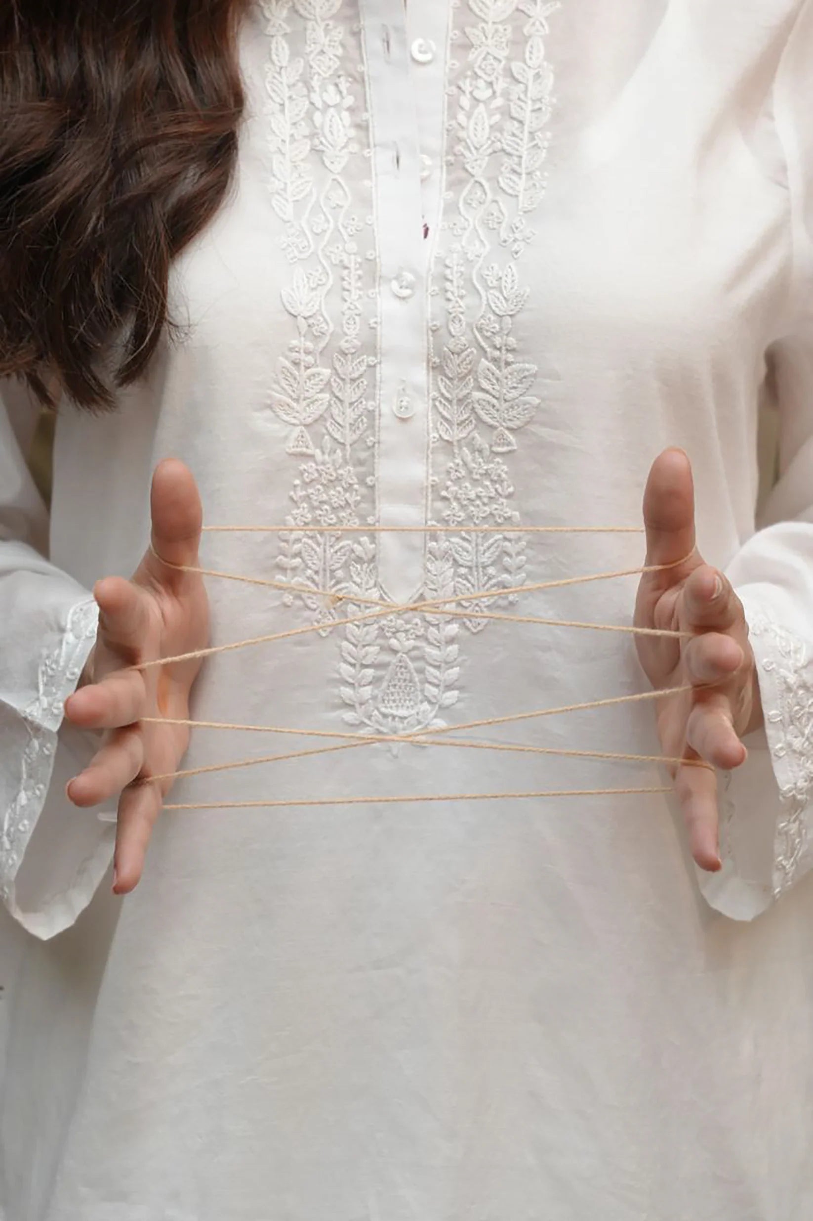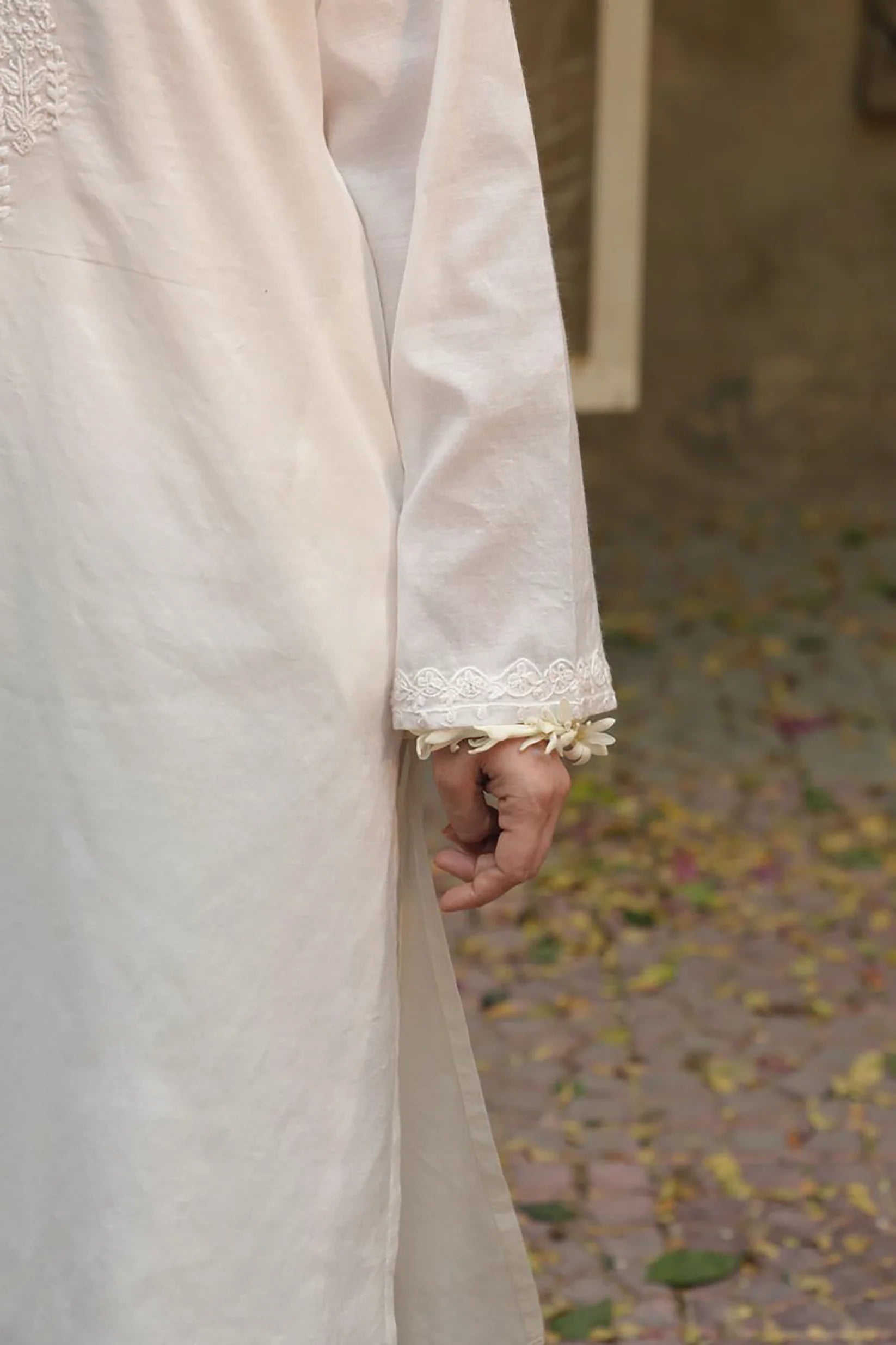 Crafted in kora cotton, the Sahil set is adorned with intricate chain and satin stitch embroidery along the neckline and sleeves, while the block printed logo and matching accents on the pockets echo the collection's charm. Paired with a khadi cotton izaar and cotton silk lining, this timeless ensemble is a wardrobe essential.